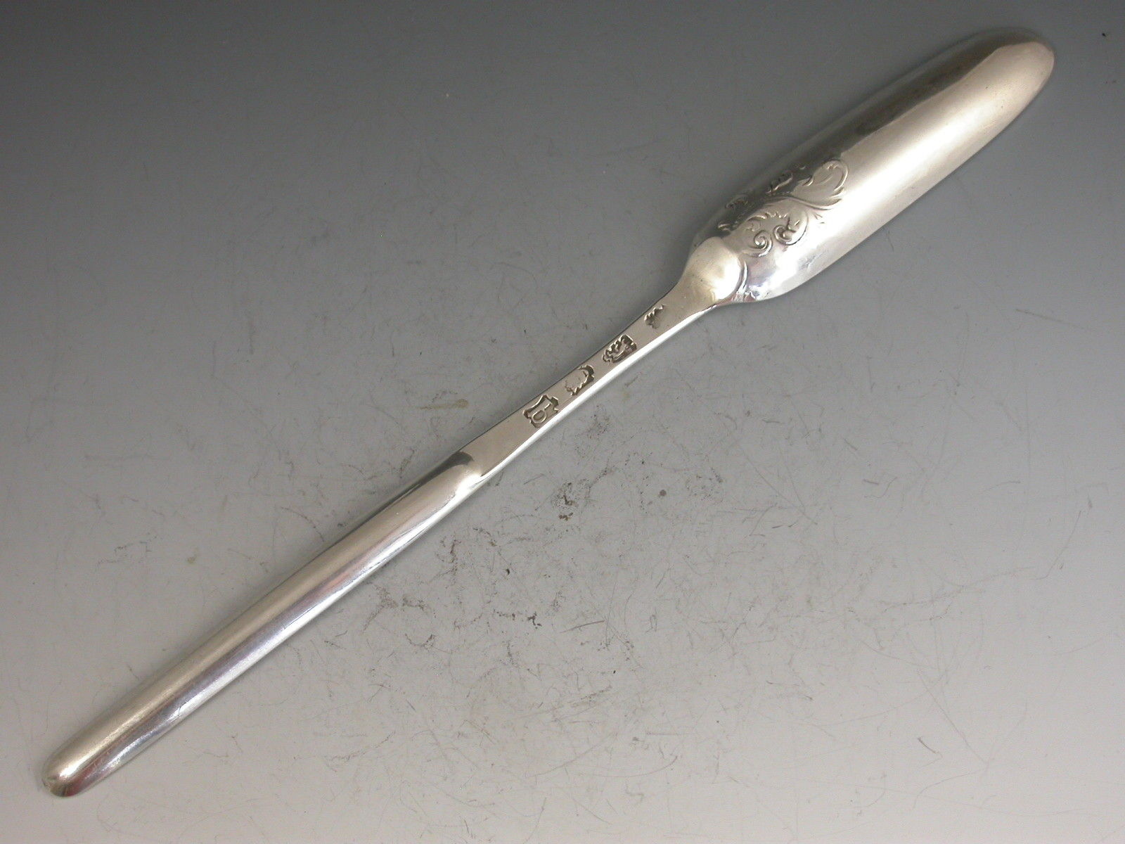 A rare George II silver 'fancy back' Marrow Scoop of standard form with two bowls, the larger bowl chased with a foliate scroll to the reverse.