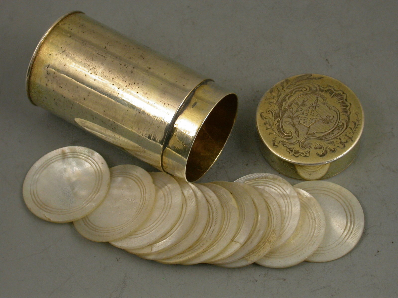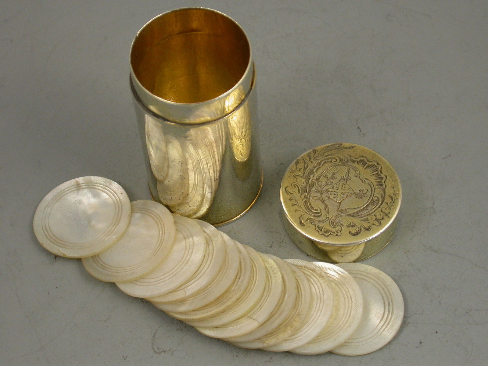 A fine George II silver gilt Counter Box of plain cylindrical form with pull off cover, engraved with the Arms of Garnier. Complete with thirteen Mother of Pearl counters.