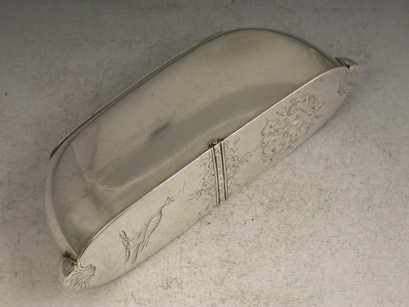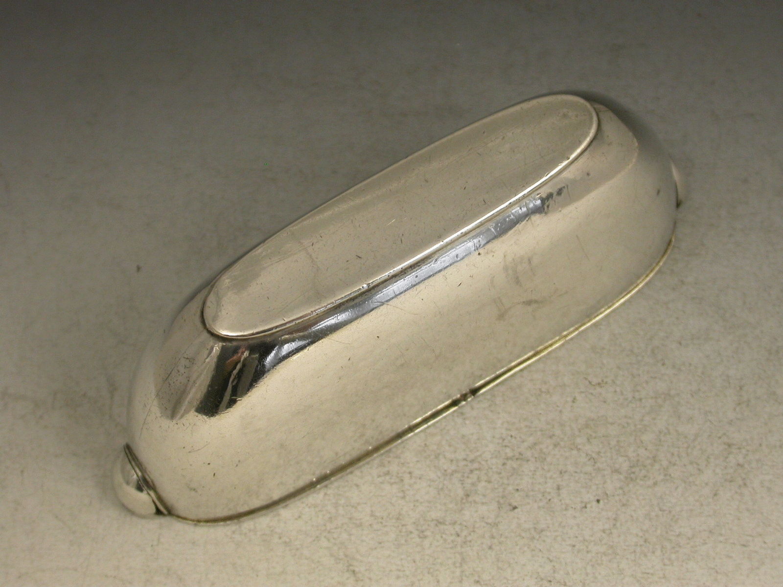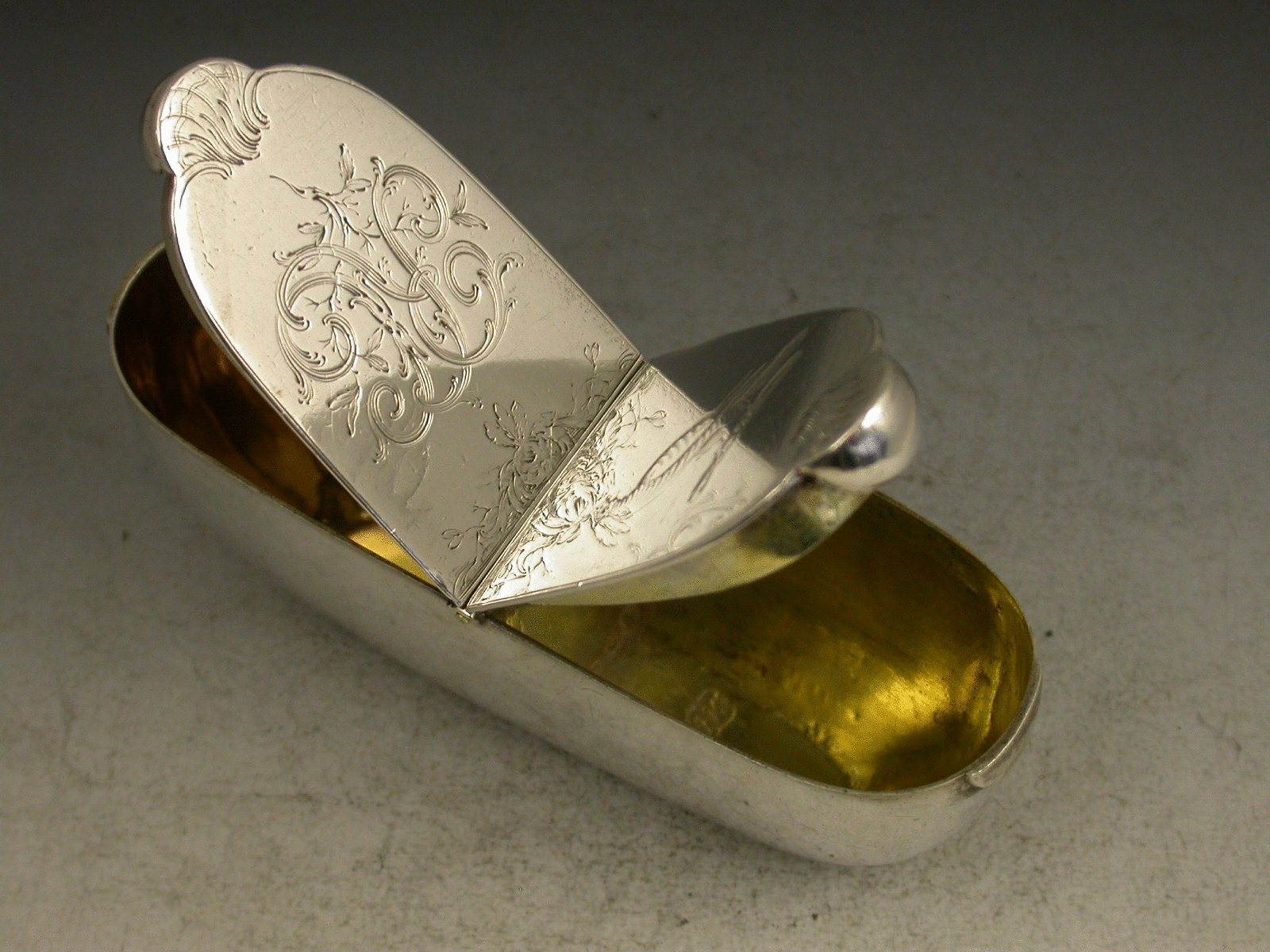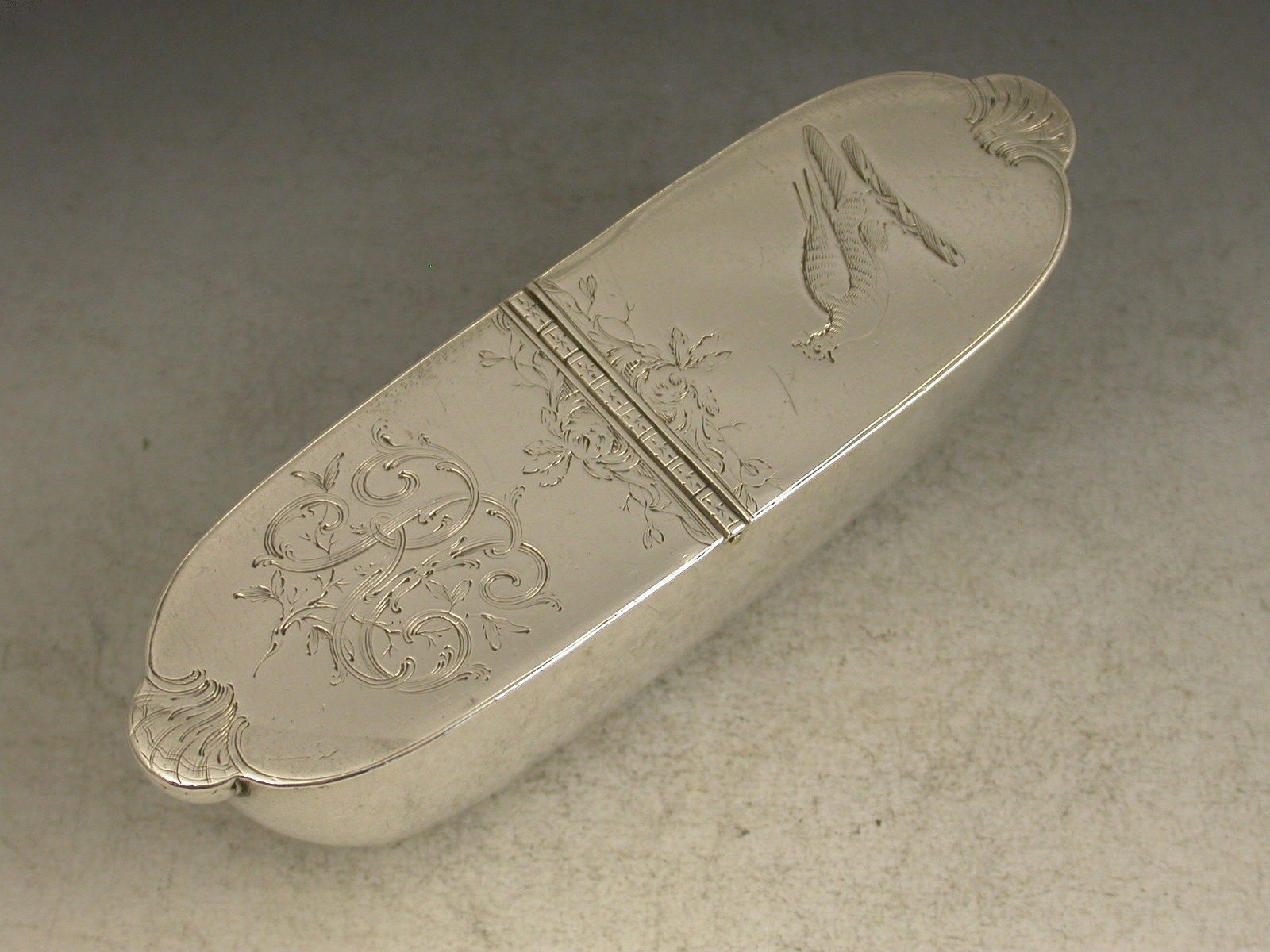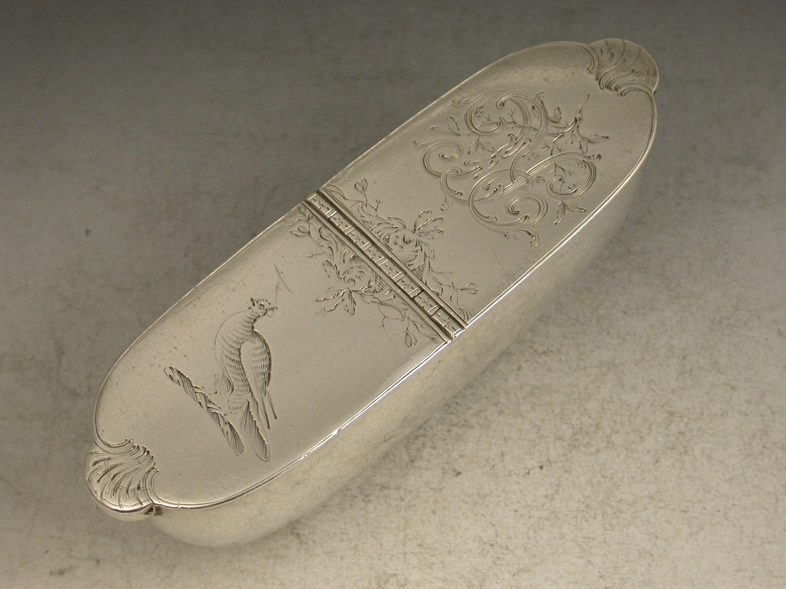 A fine quality George II silver twin compartment Snuff Box, of elongated oval form with central concealed hinge, one cover engraved with a crest the other with initials, an engraved thumb-piece to either end, the silver gilt interiors struck with two makers marks only - ""I.W"" (in Roman Capitals) and ""I.W"" (in script).
