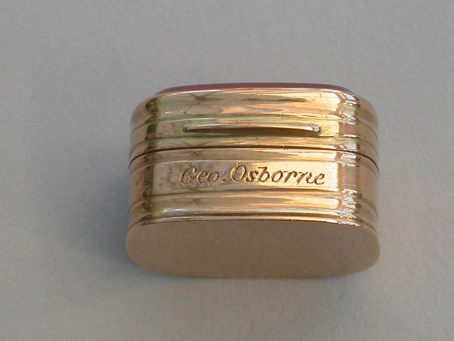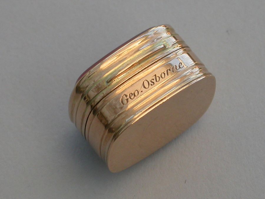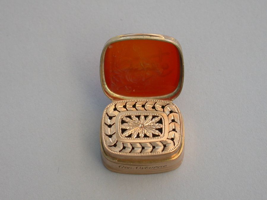 A very fine small George III 18 carat gold (tested) Vinaigrette of shaped rectangular form with reeded sides, the lid inset with a Carnelian carved with FAITH on the outside and HOPE on the inside. The finely pierced and engraved grille with central framed flower head. ""Geo. Osborne"" engraved to the front.