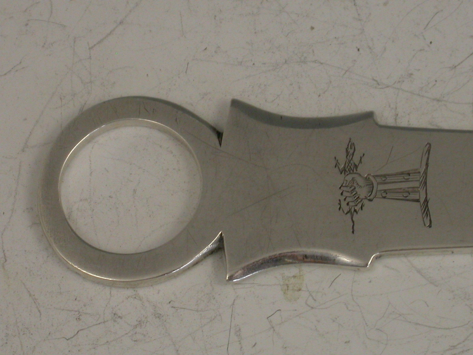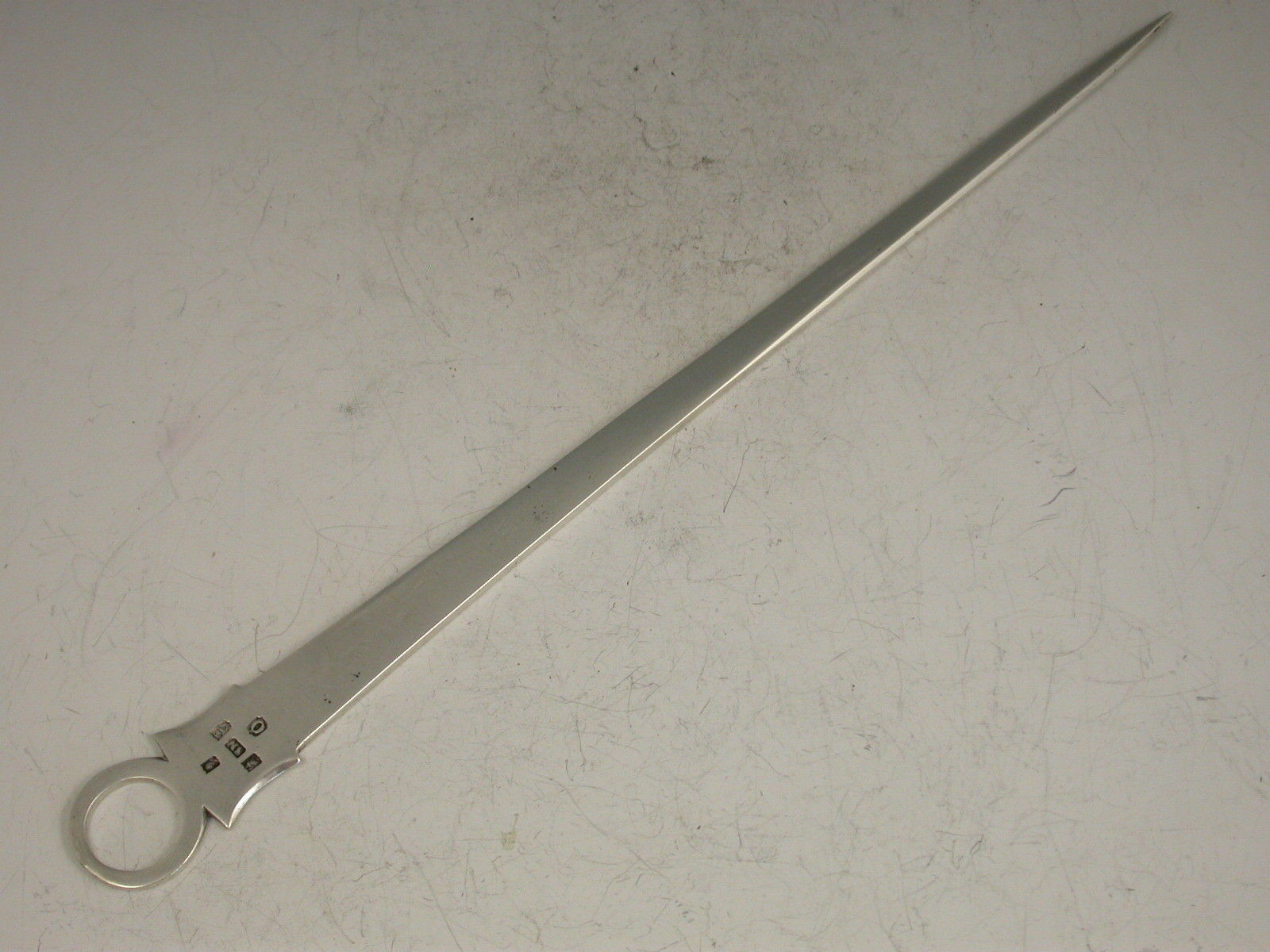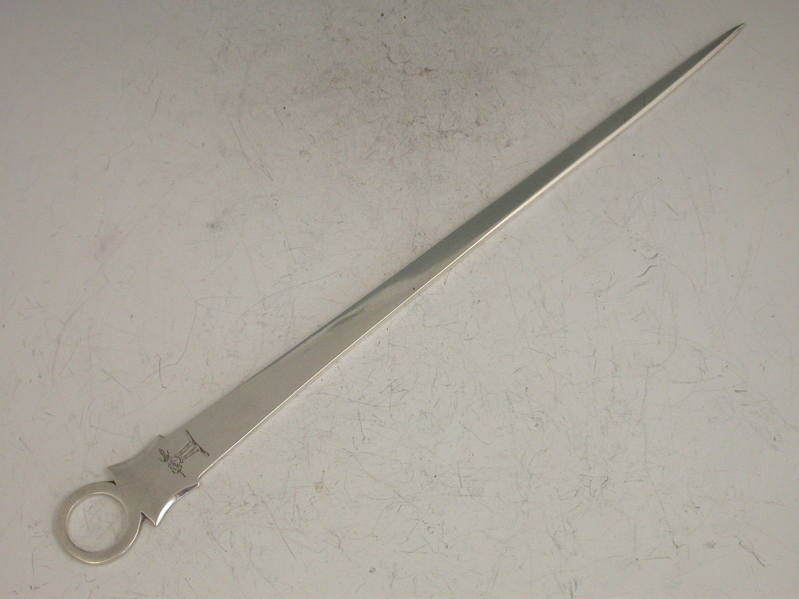A nice quality George III Irish silver Meat Skewer with shield shaped terminal and plain ring handle, engraved with a crest depicting an arm holding a lizard or salamander, possibly for the Owen family of Ireland.