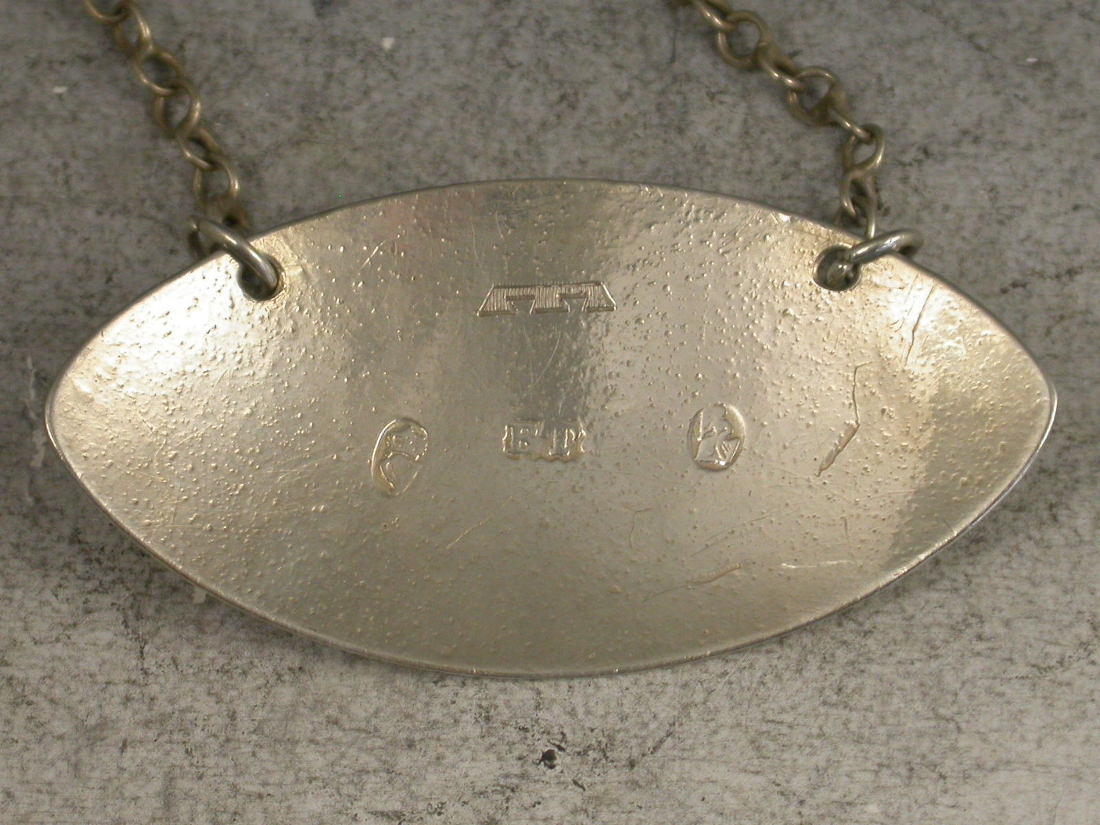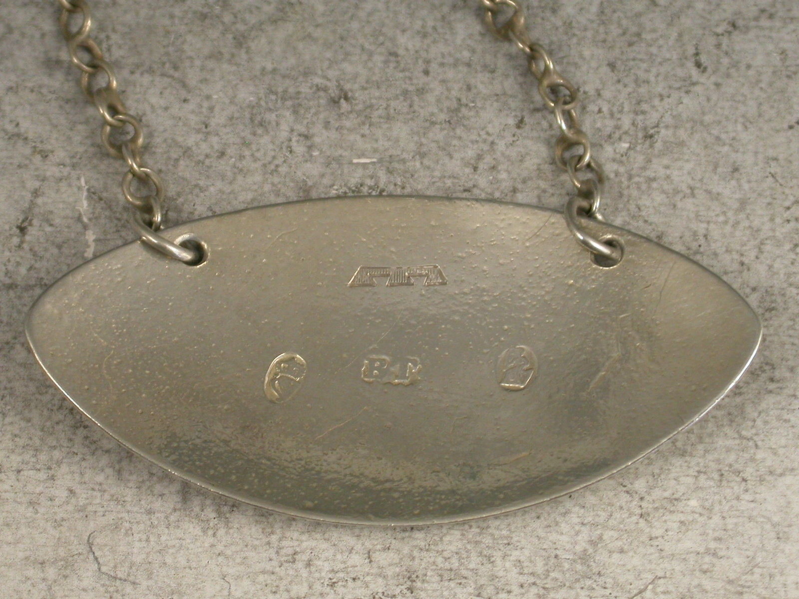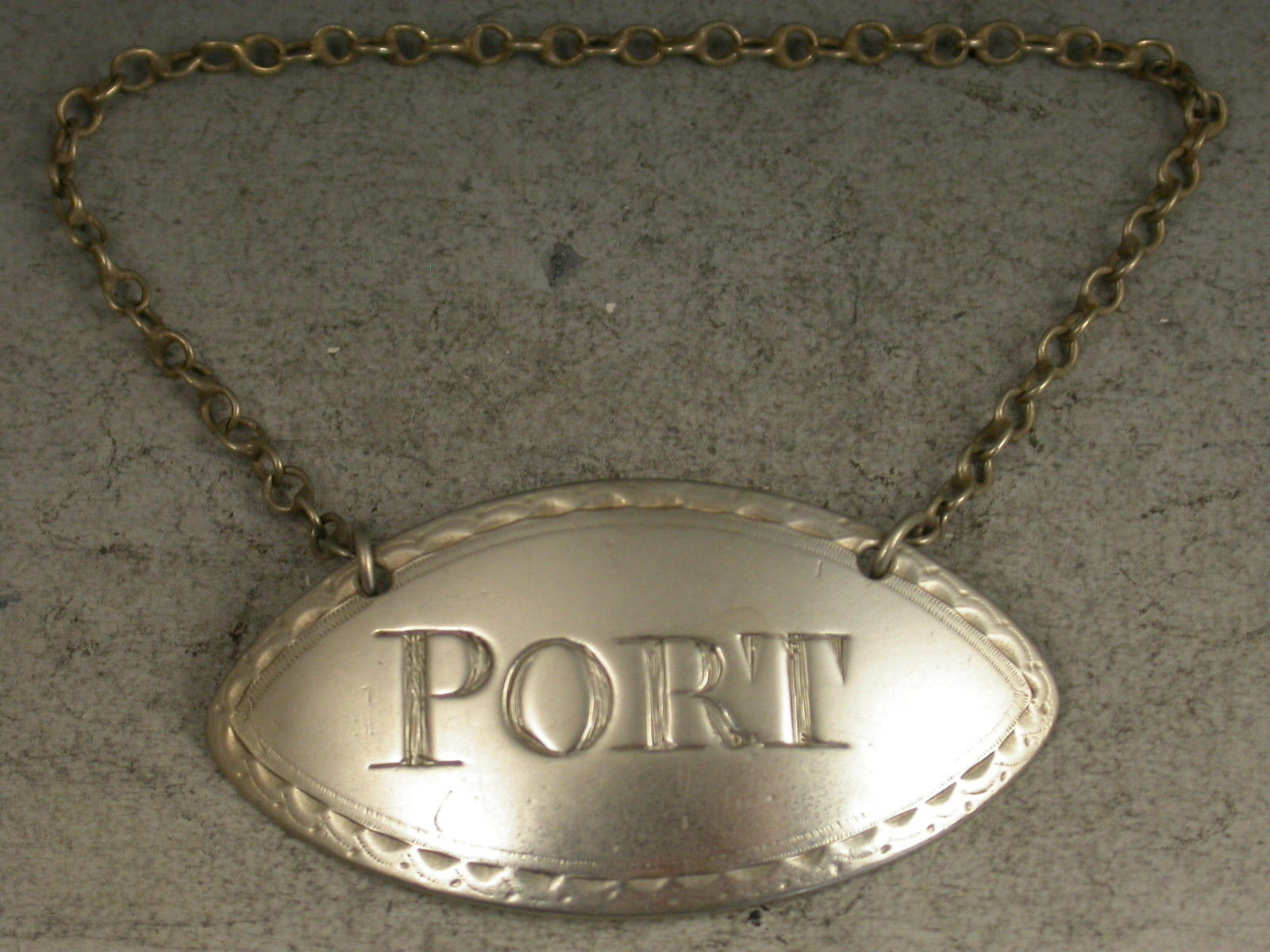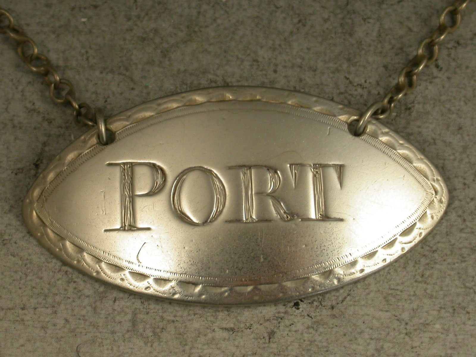 A George III Irish silver Wine Label of eye shape with bright-cut engraved feather edge border, incised for Port.