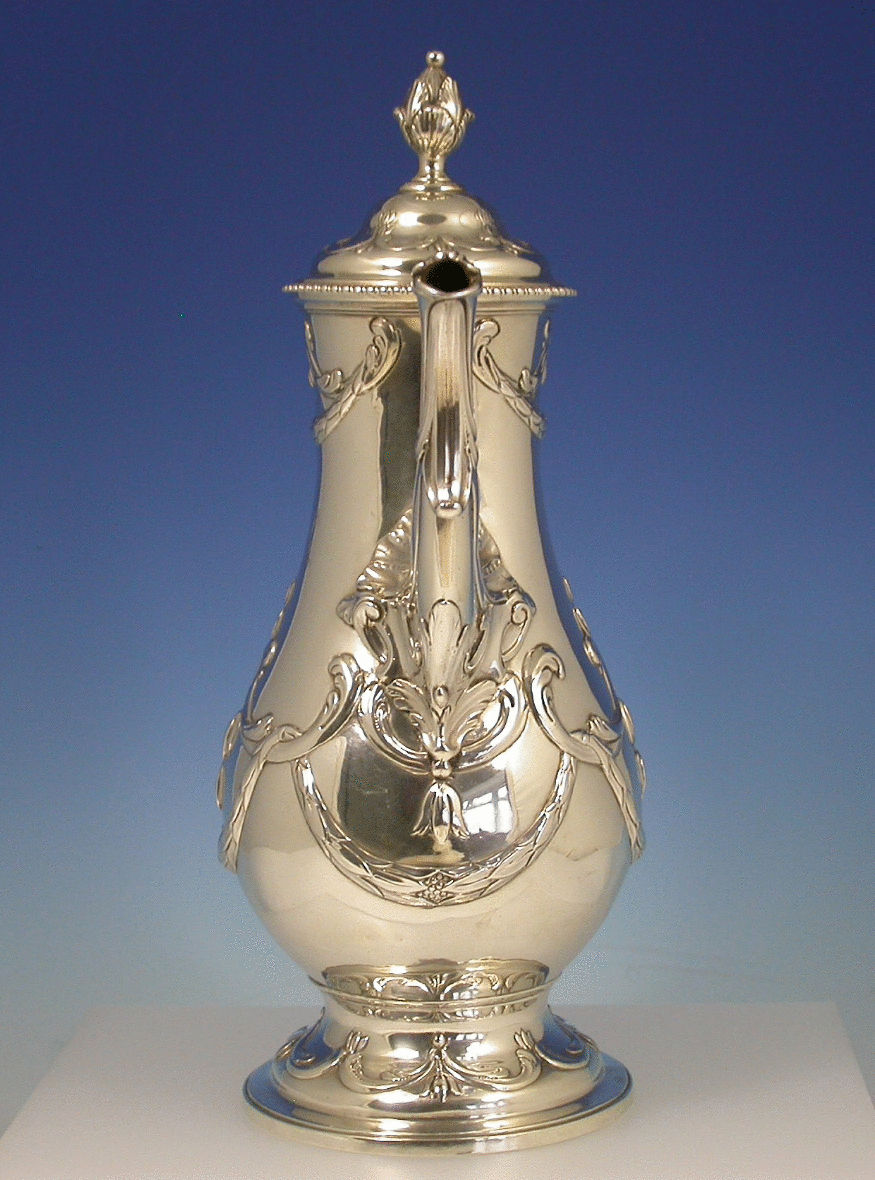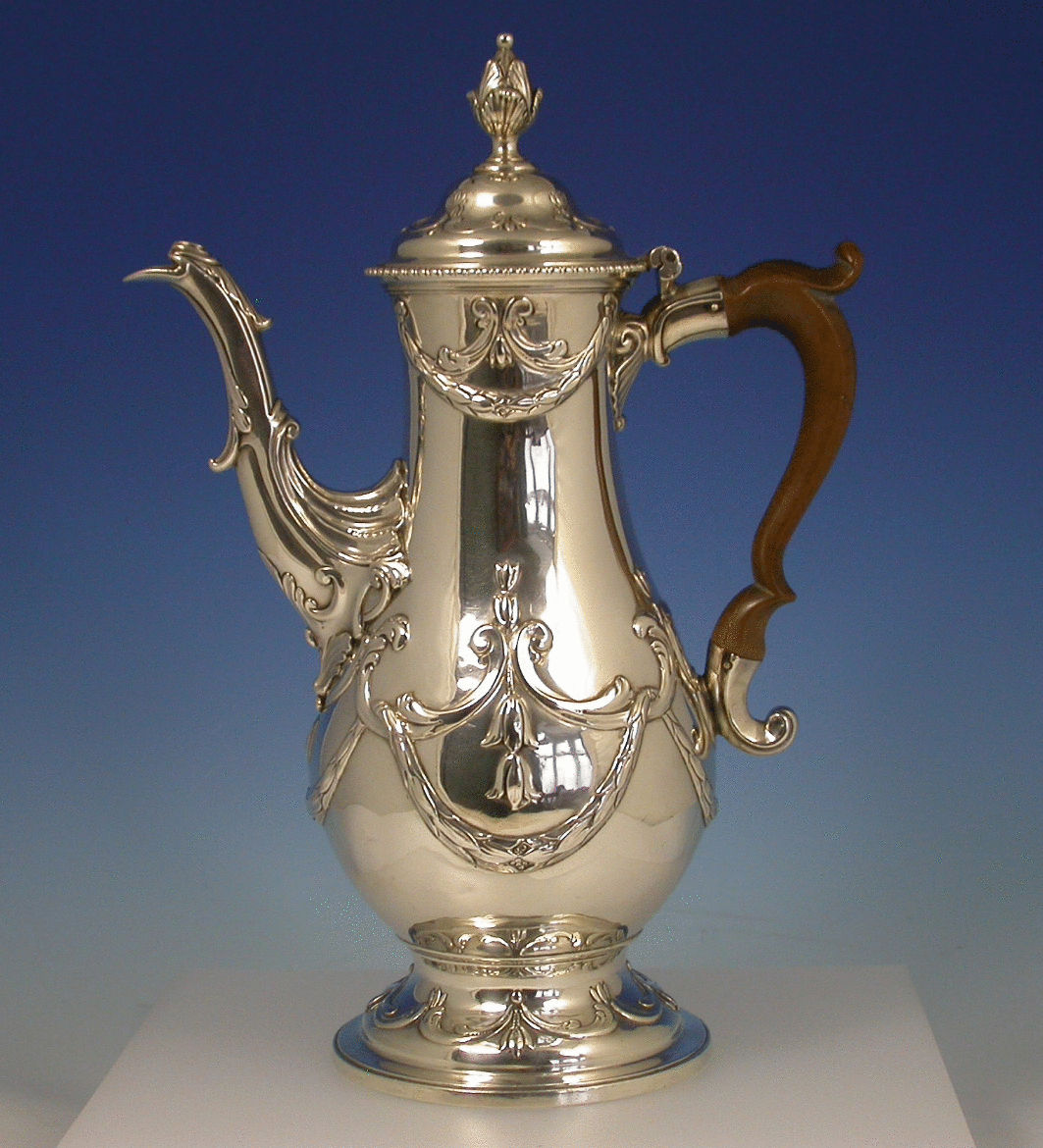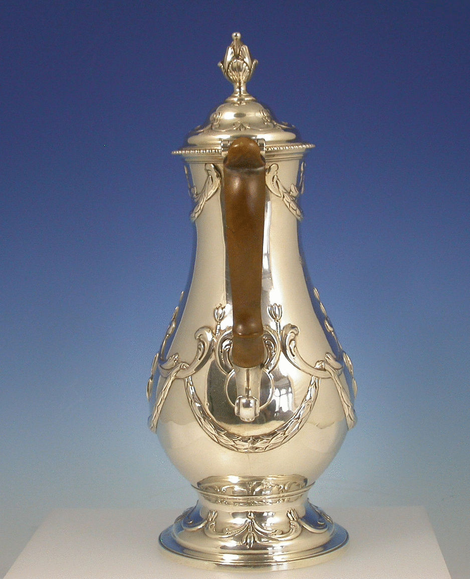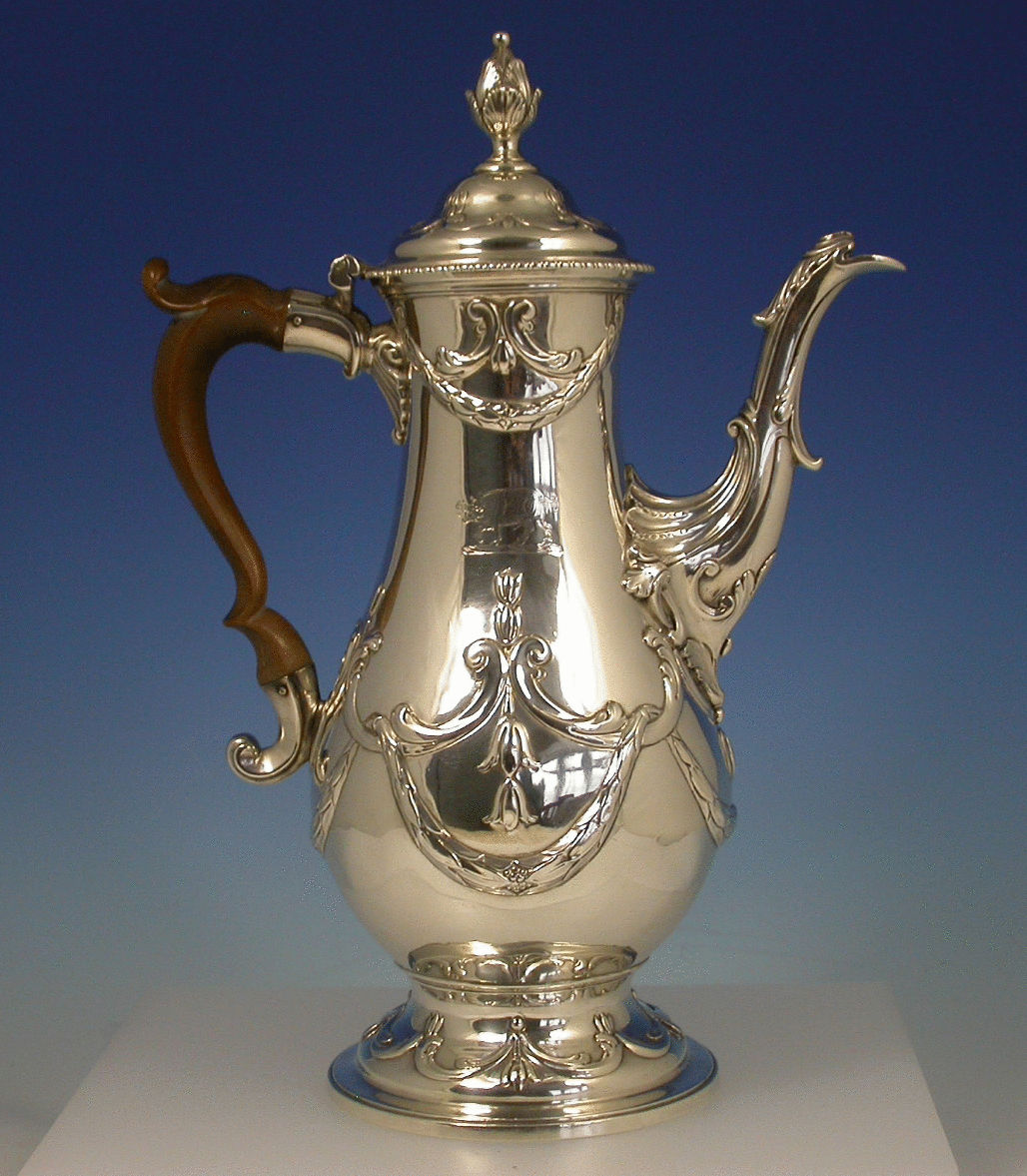 A fine quality George III silver Coffee Pot of baluster form, chased and engraved with swags and festoons in the Adam style, scrolled wooden handle. The body engraved with the crest of a boar.
