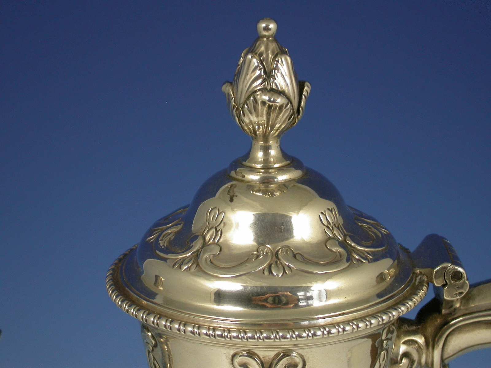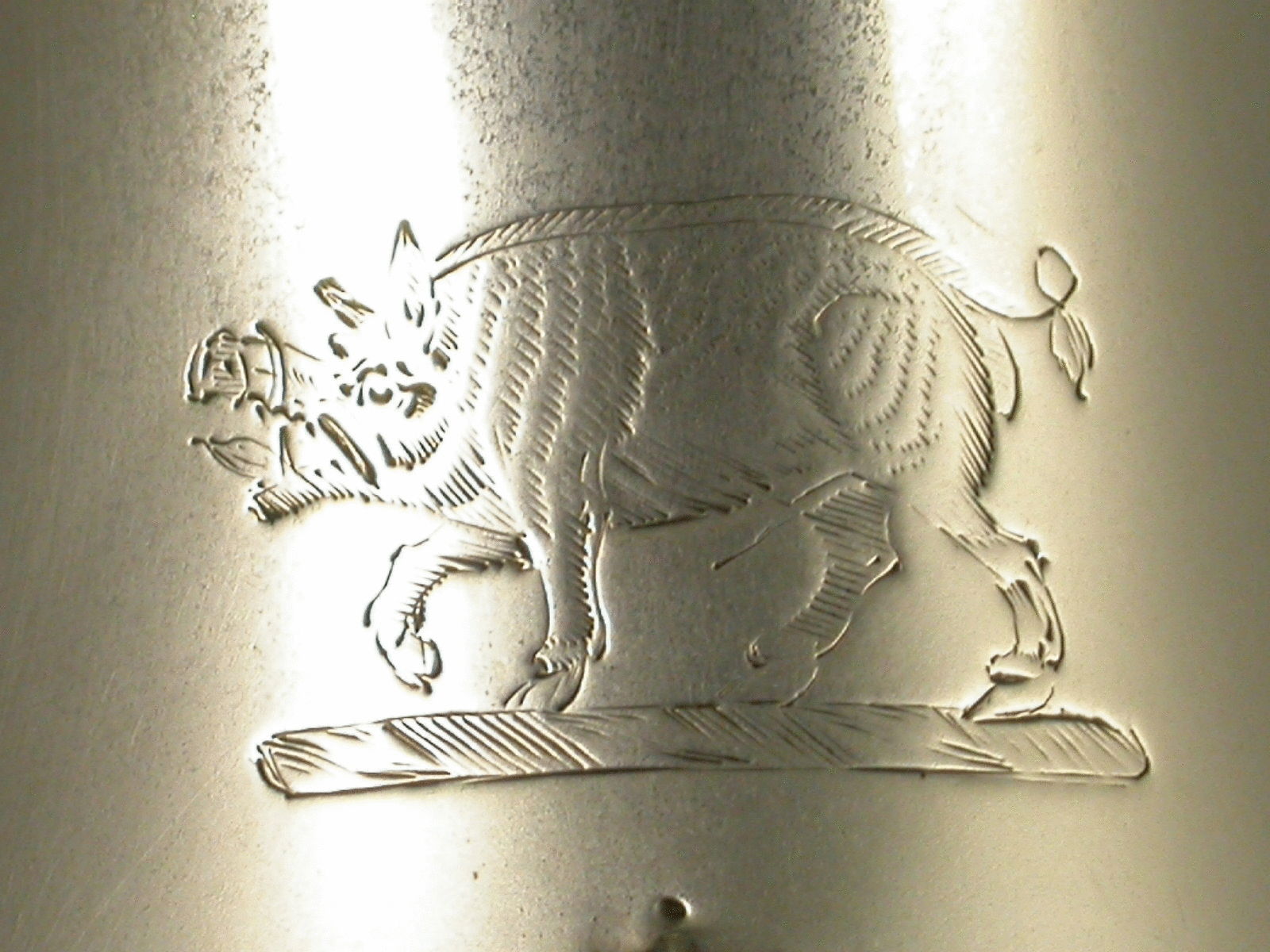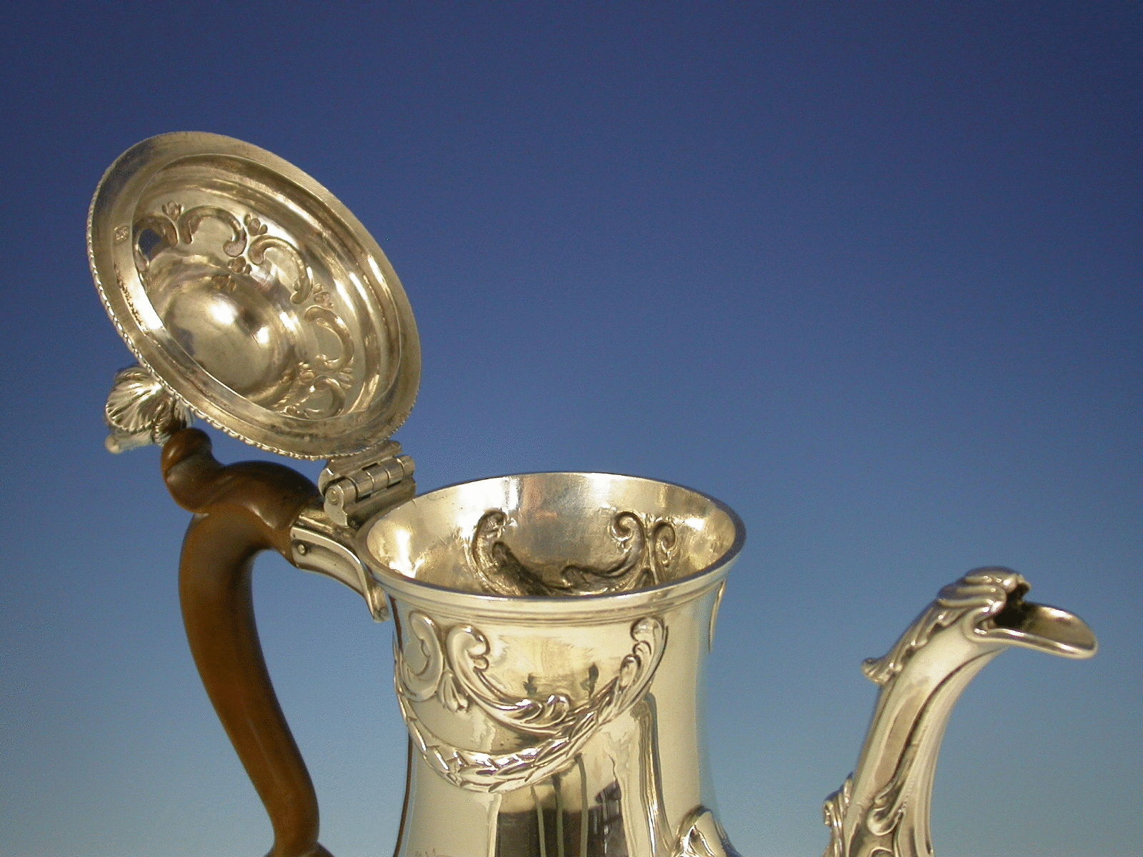 A fine quality George III silver Coffee Pot of baluster form, chased and engraved with swags and festoons in the Adam style, scrolled wooden handle. The body engraved with the crest of a boar.