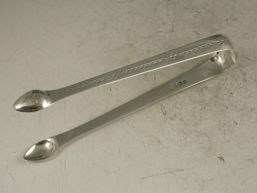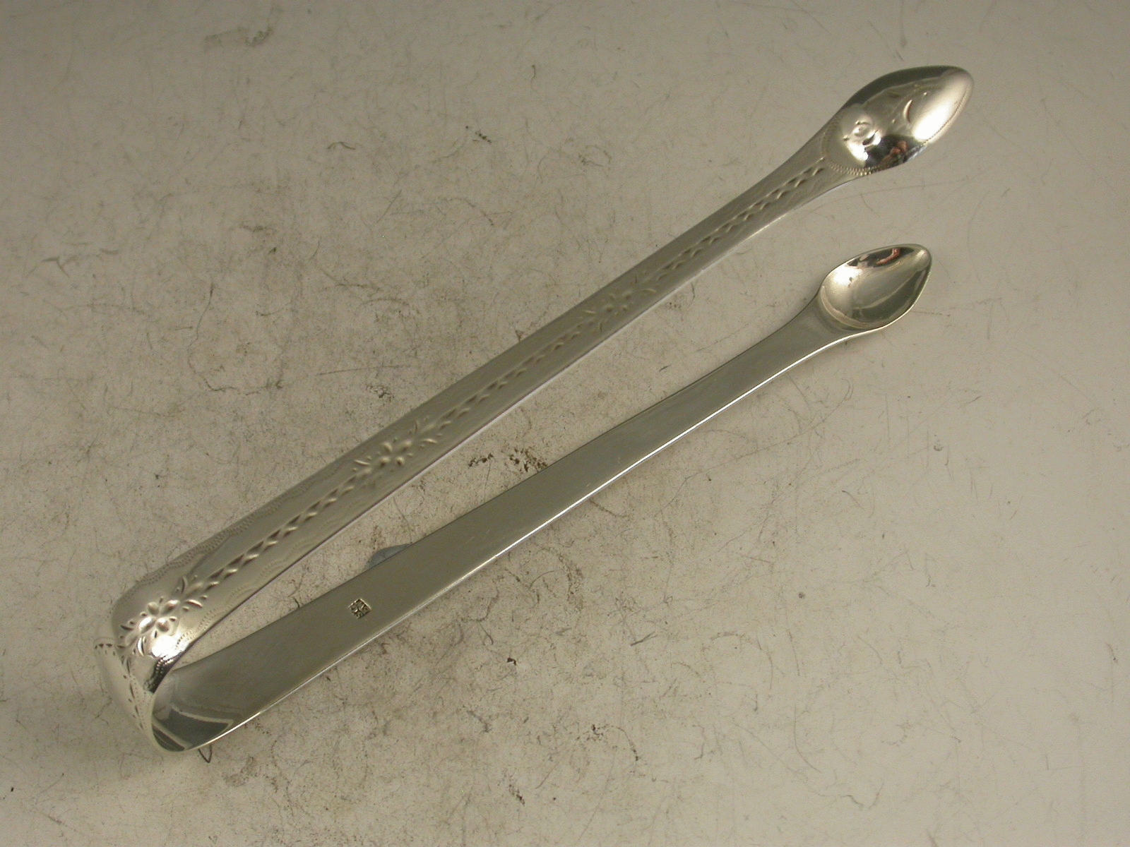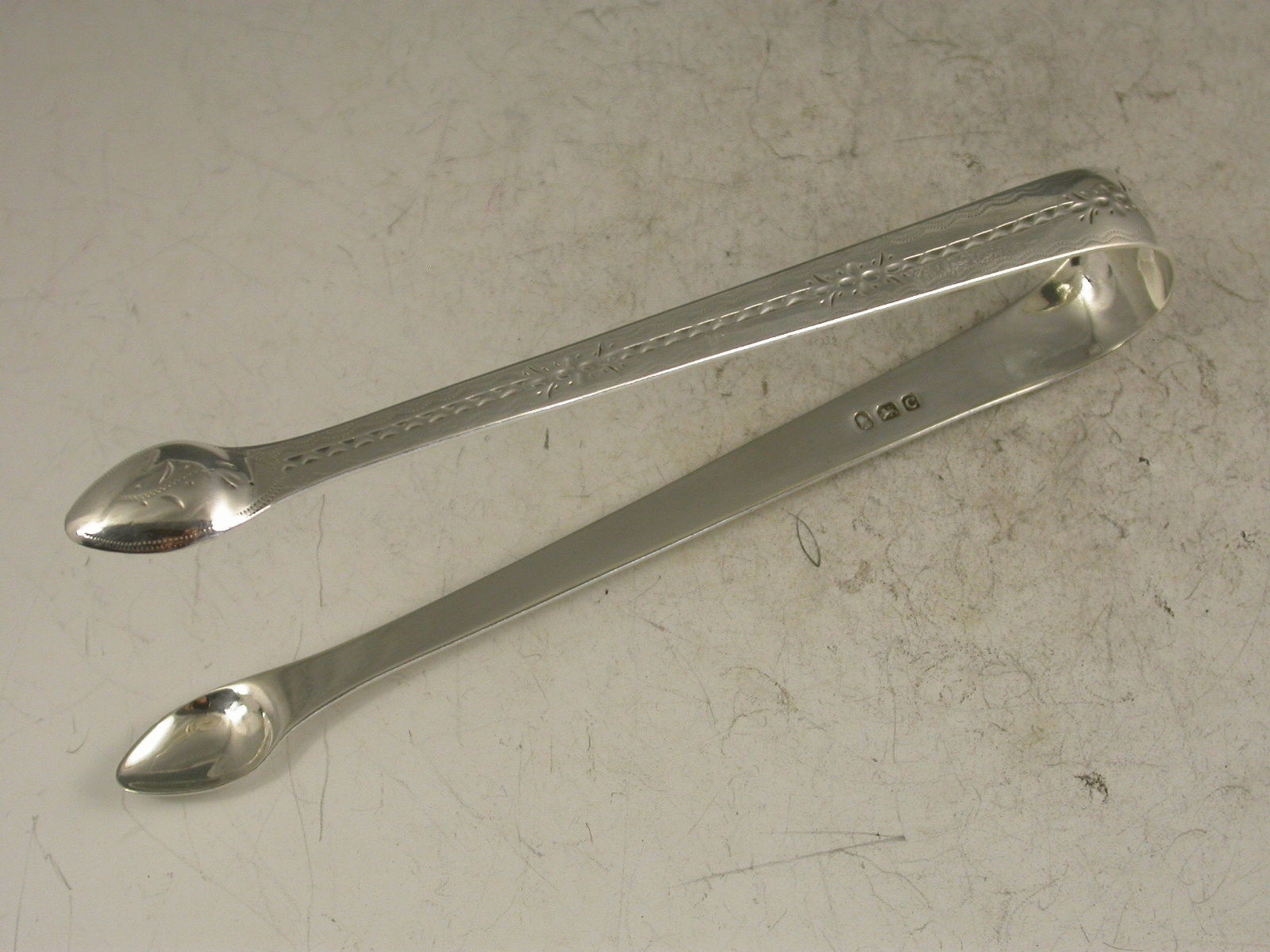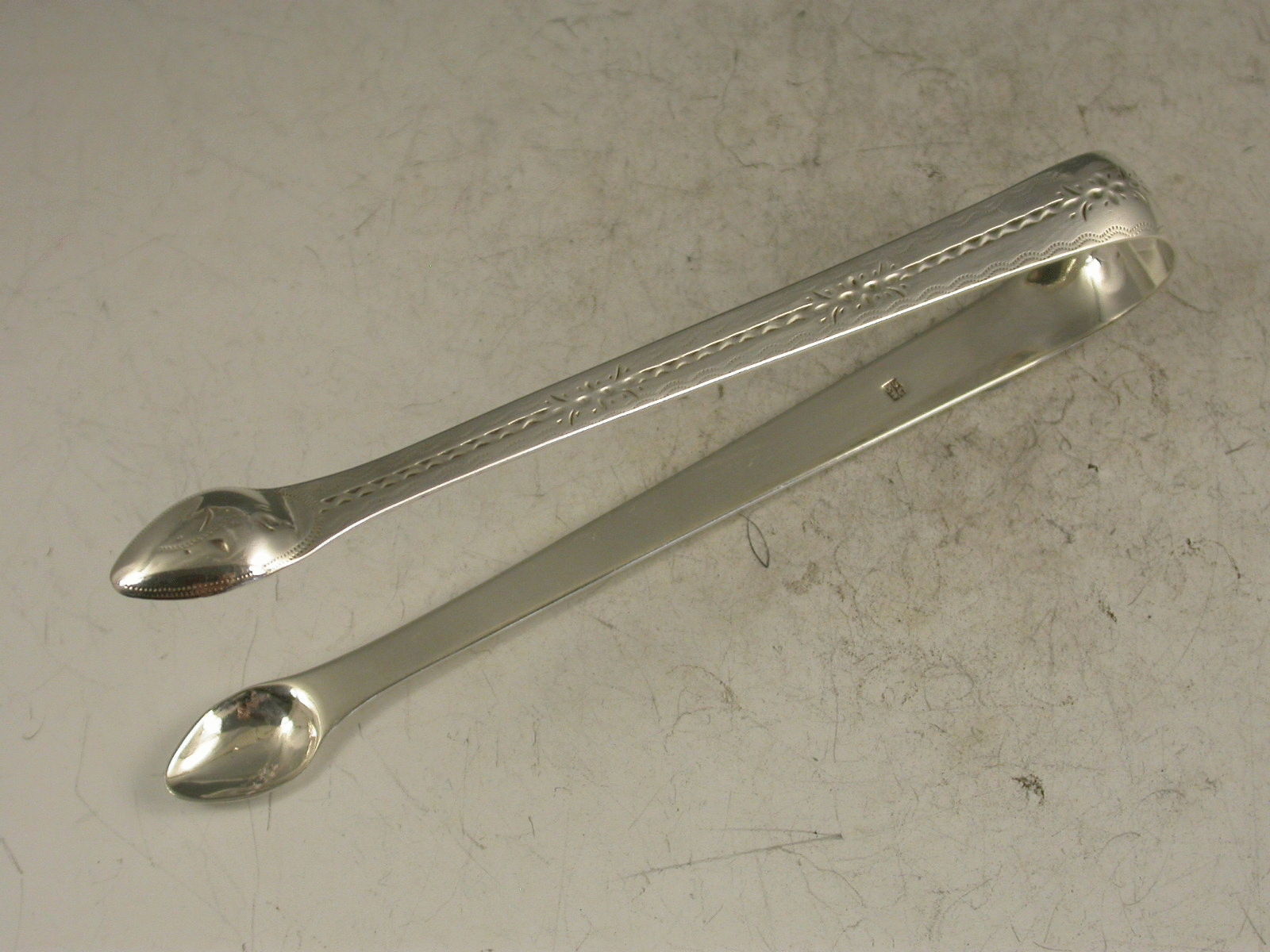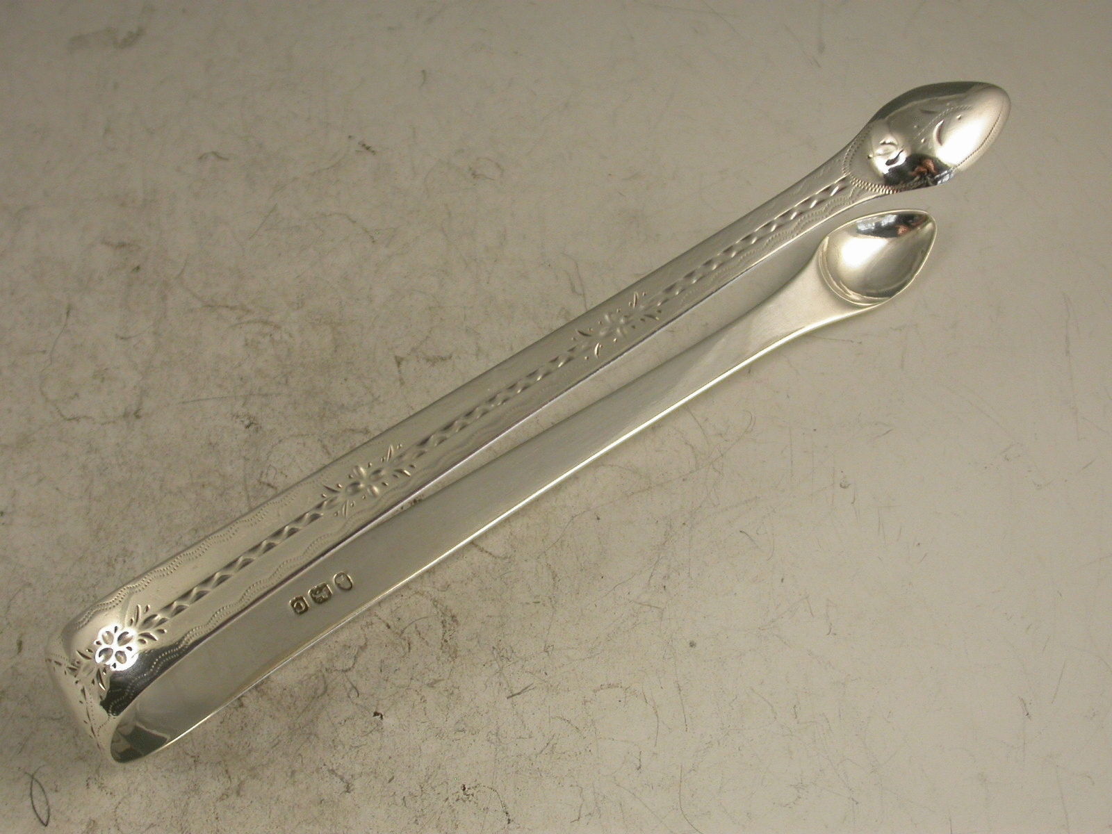 A pair of George III 18th century silver Sugar Tongs with bright-cut engraved decoration.