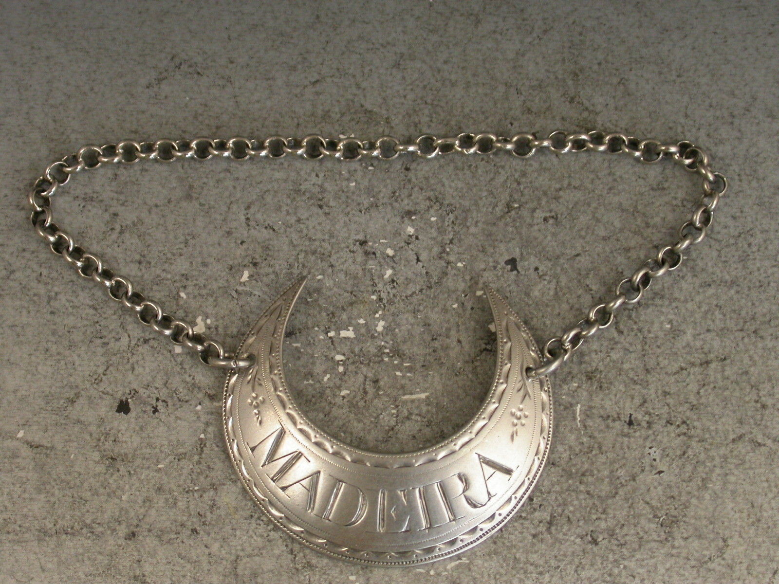 A fine George III silver Wine Label of crescent form with bright cut engraved decoration to the border and stylised bunches of grapes, incised for Madeira.