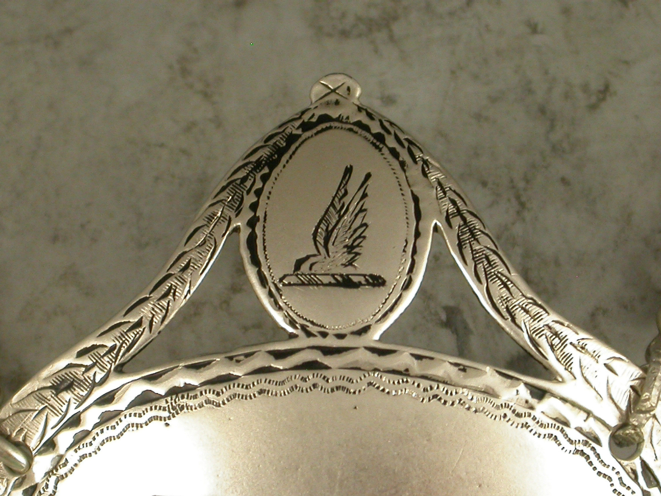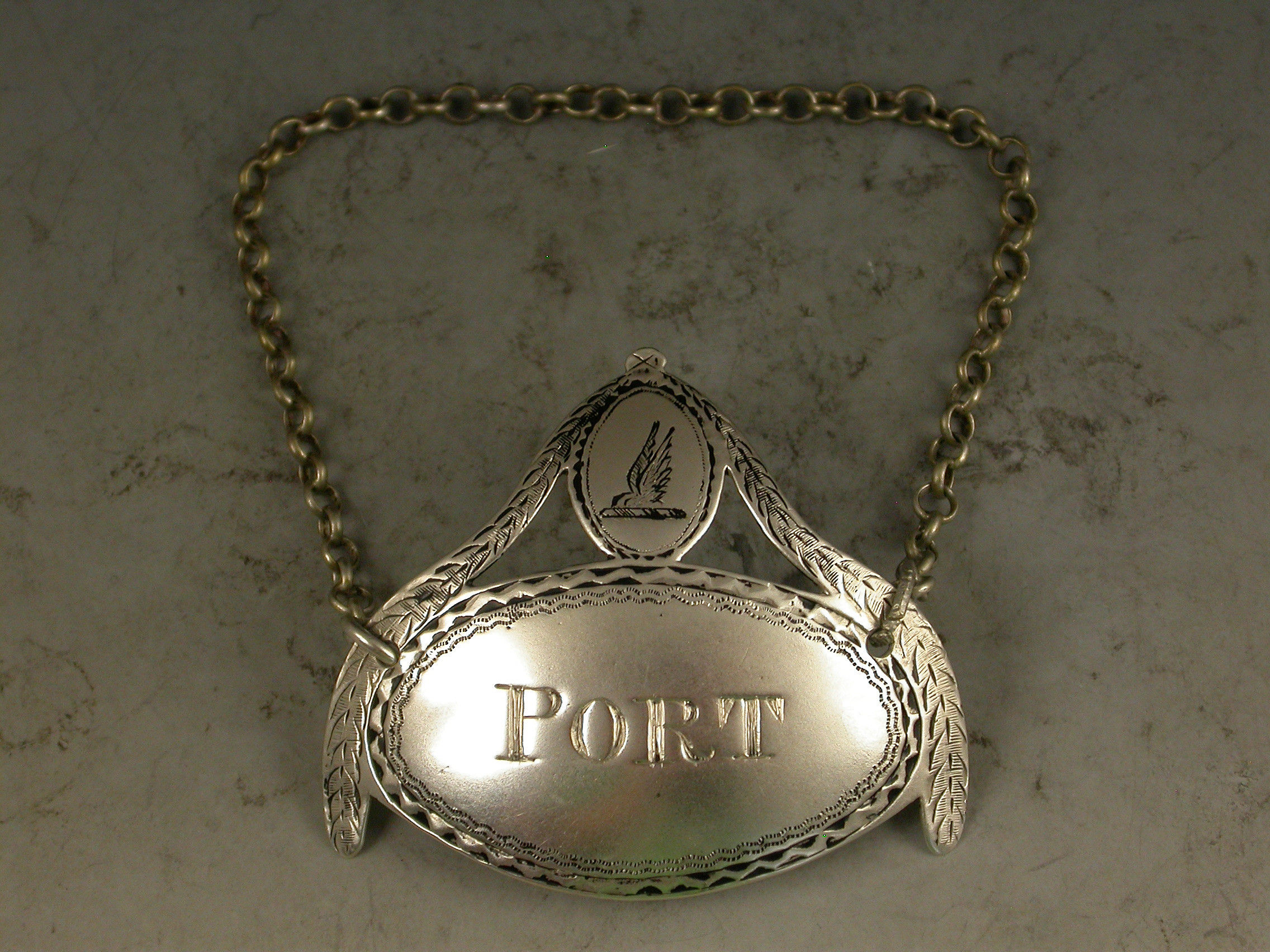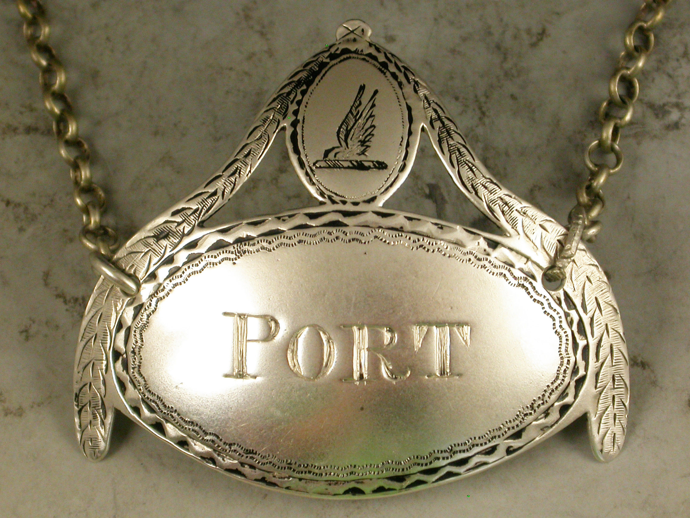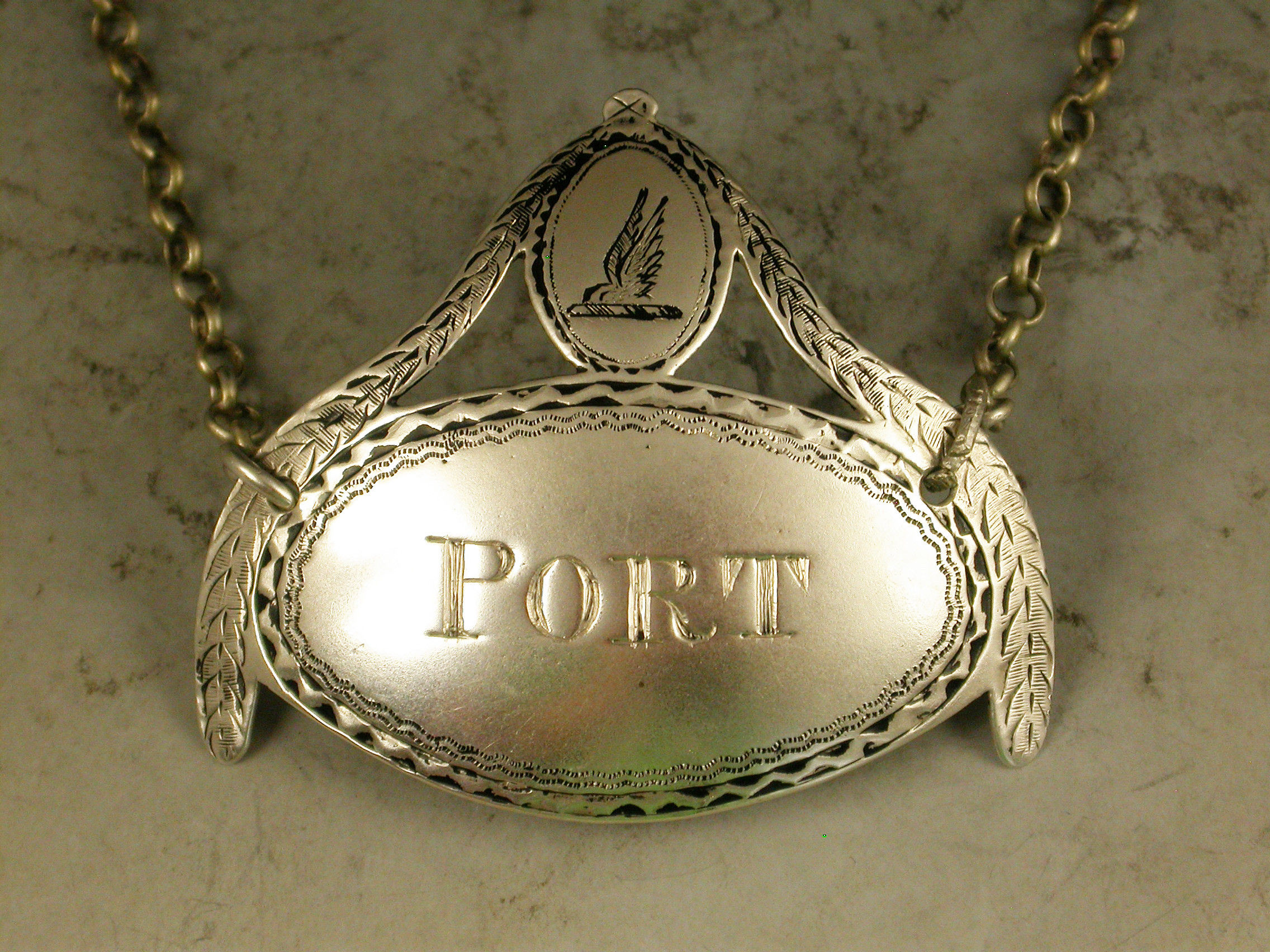 A good George III silver Wine Label of oval form with crested shield above supported by swags, a bright-cut and niello filled border, incised for Port.