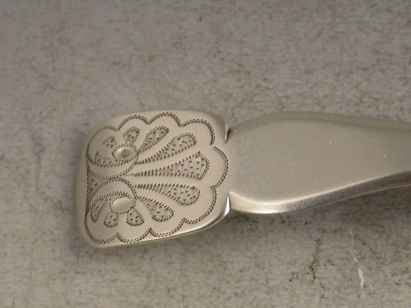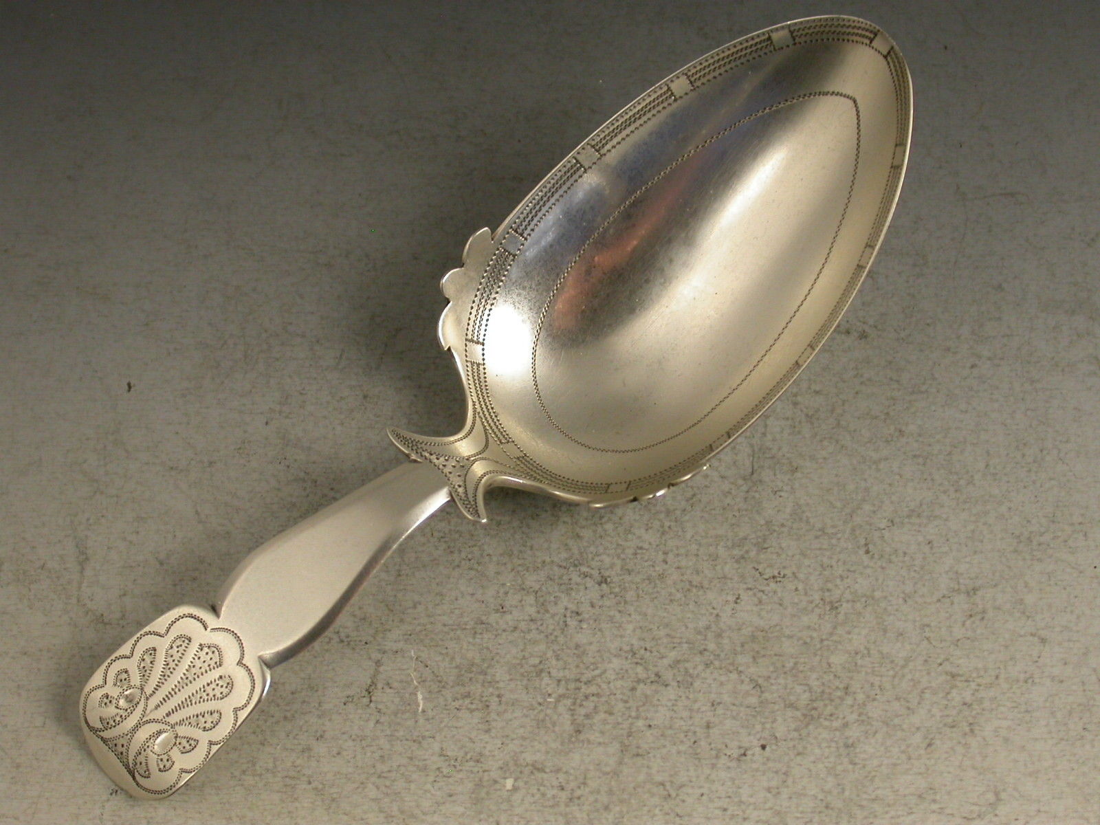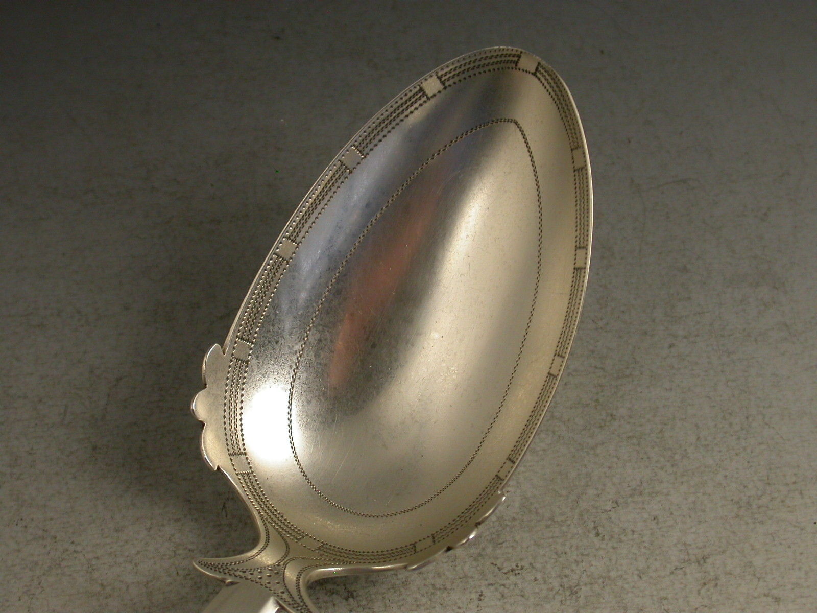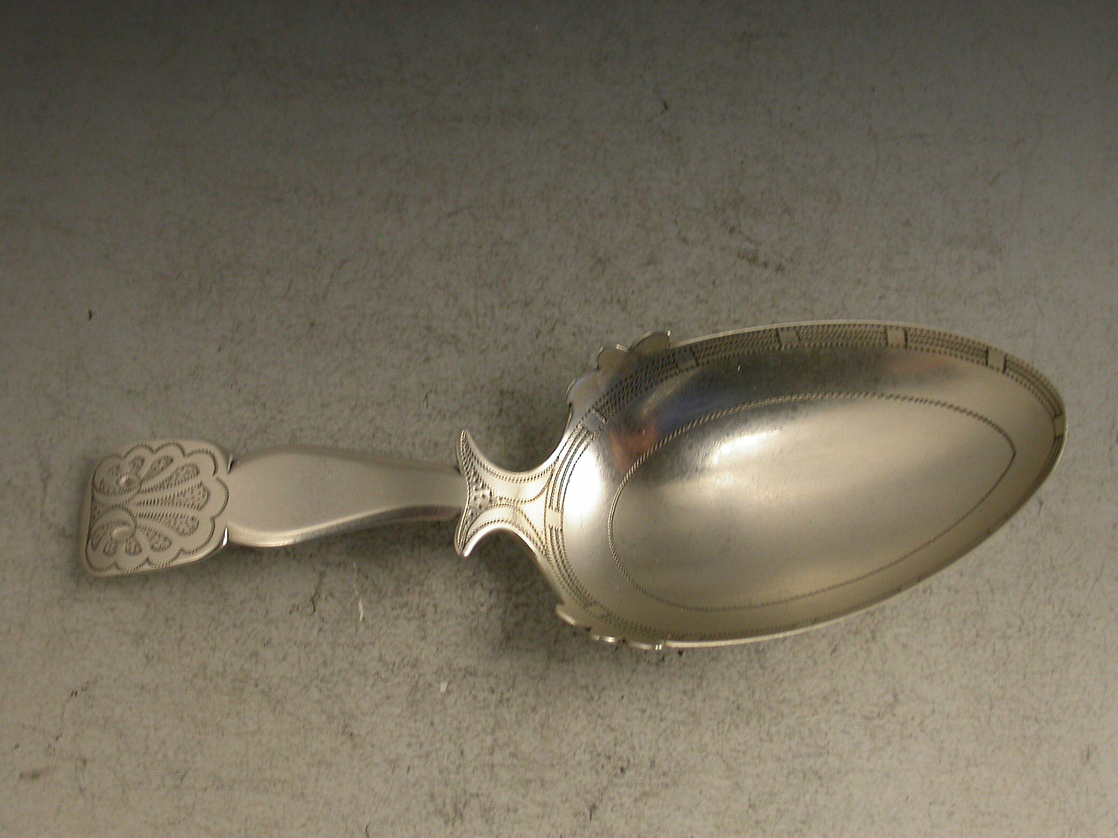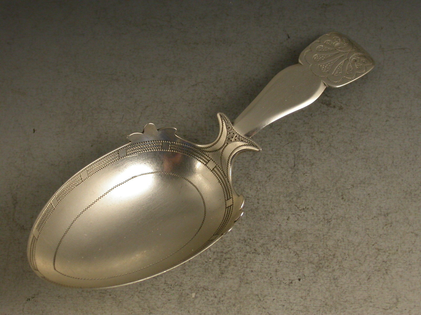 A fine George III large silver Caddy Spoon, the egg shaped bowl with bright-cut and prick-dot engraved decoration and leaf shaped embellishments to the border, the shaped fiddle pattern handle with shoulders and engraved shell decoration.