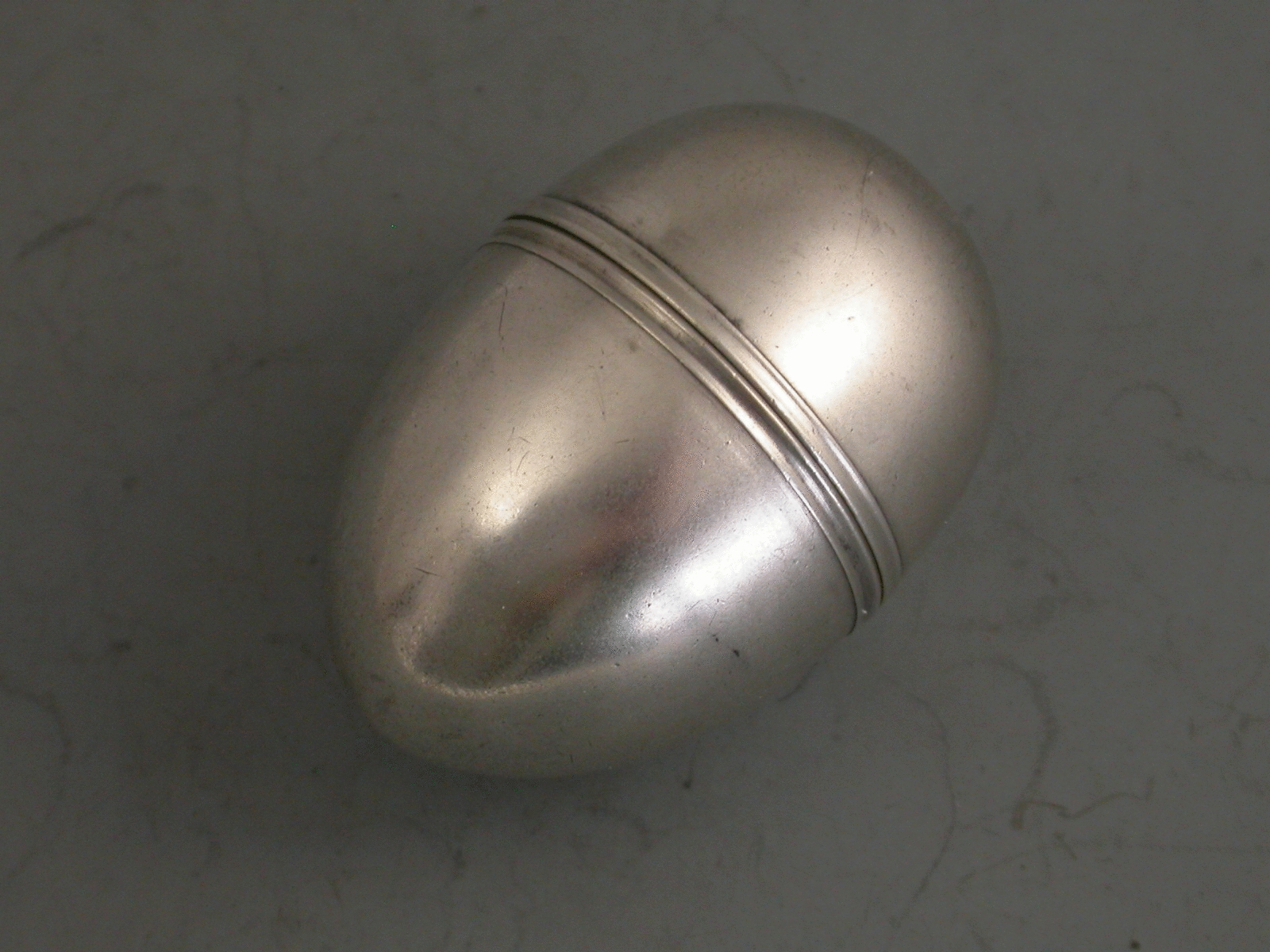 A good George III silver Nutmeg Grater of perfectly plain egg shape with reeded girdle, opening at the centre to reveal pull out steel grater.