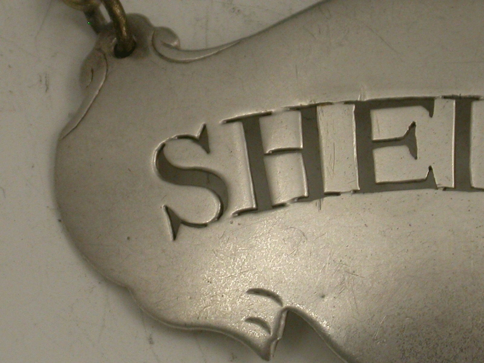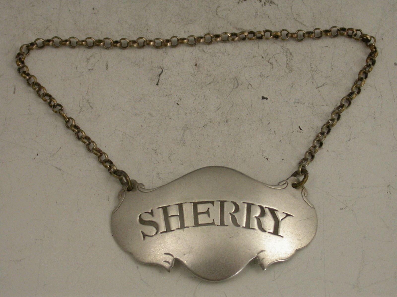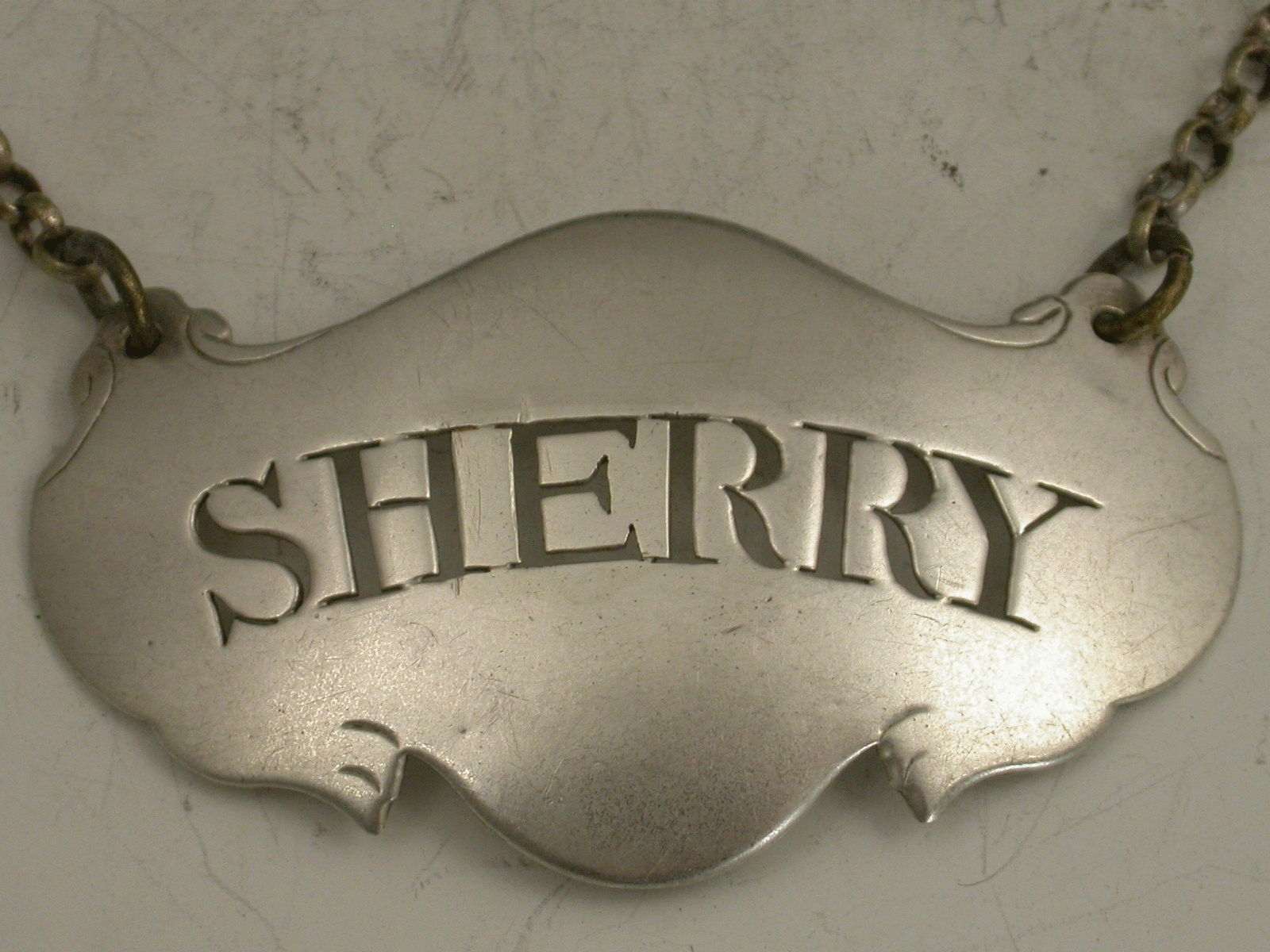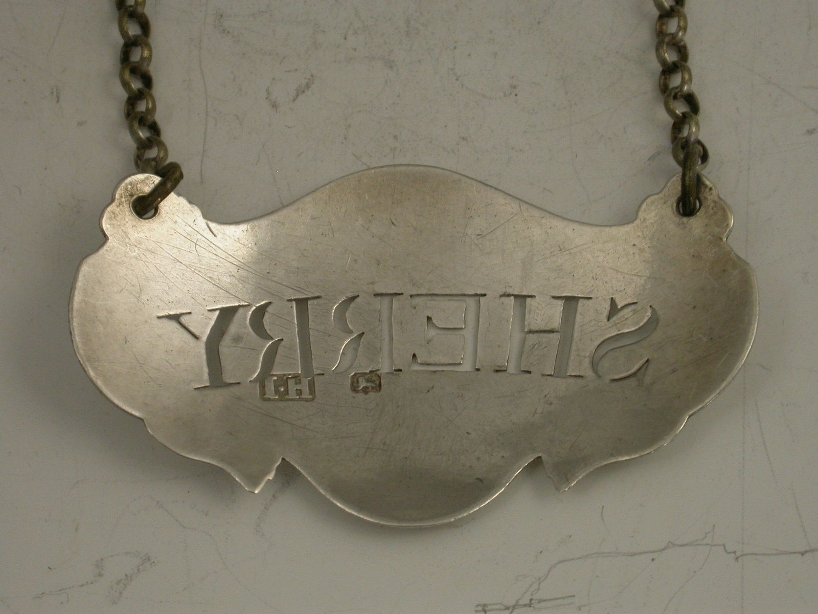 An unusual George III 18th century silver Wine Label of escutcheon shape with insignificant engraved lines to simulate drapes, pierced for Sherry.