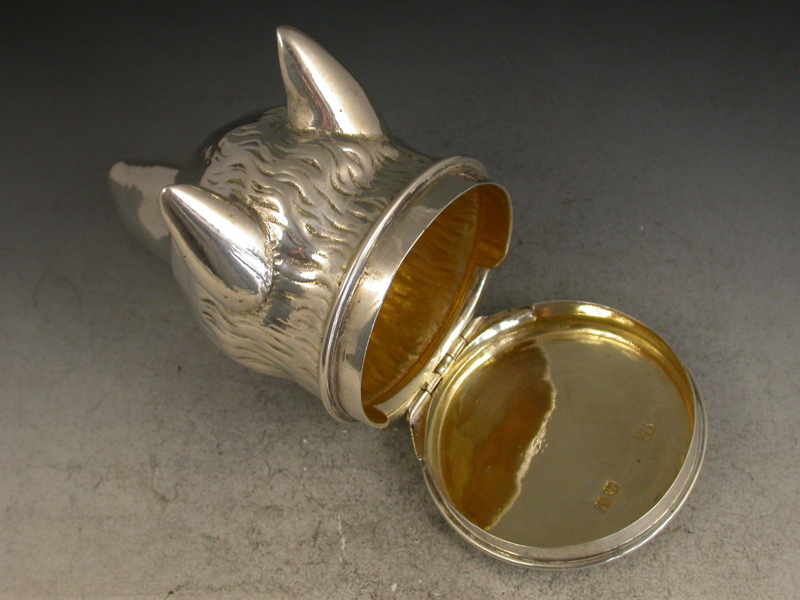 A nice quality George III silver Snuff Box made in the form of a Foxes Head, with hinged circular cover engraved with a contemporary crest and with silver gilt interior.