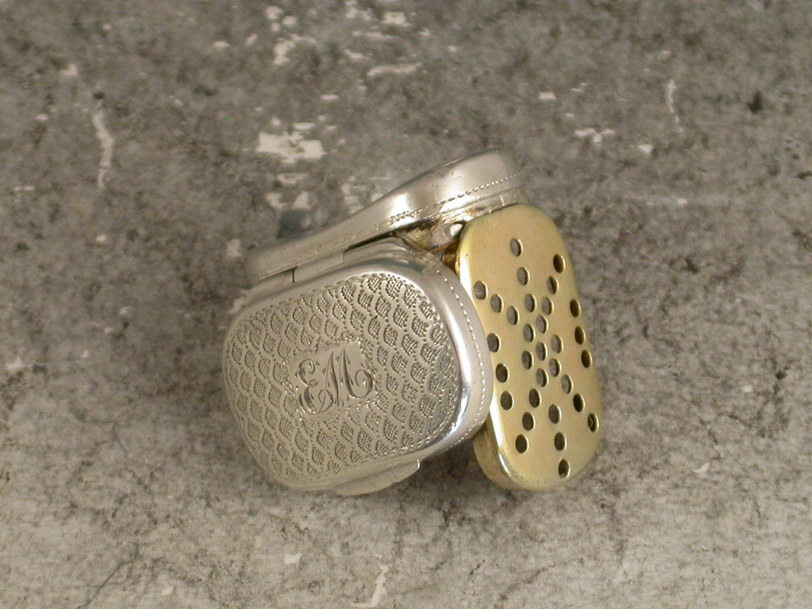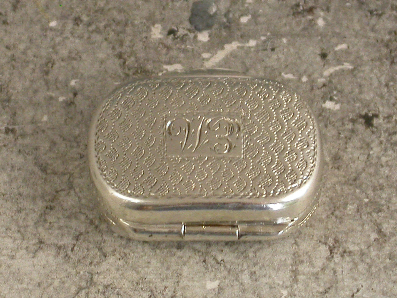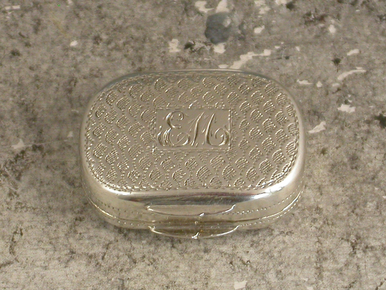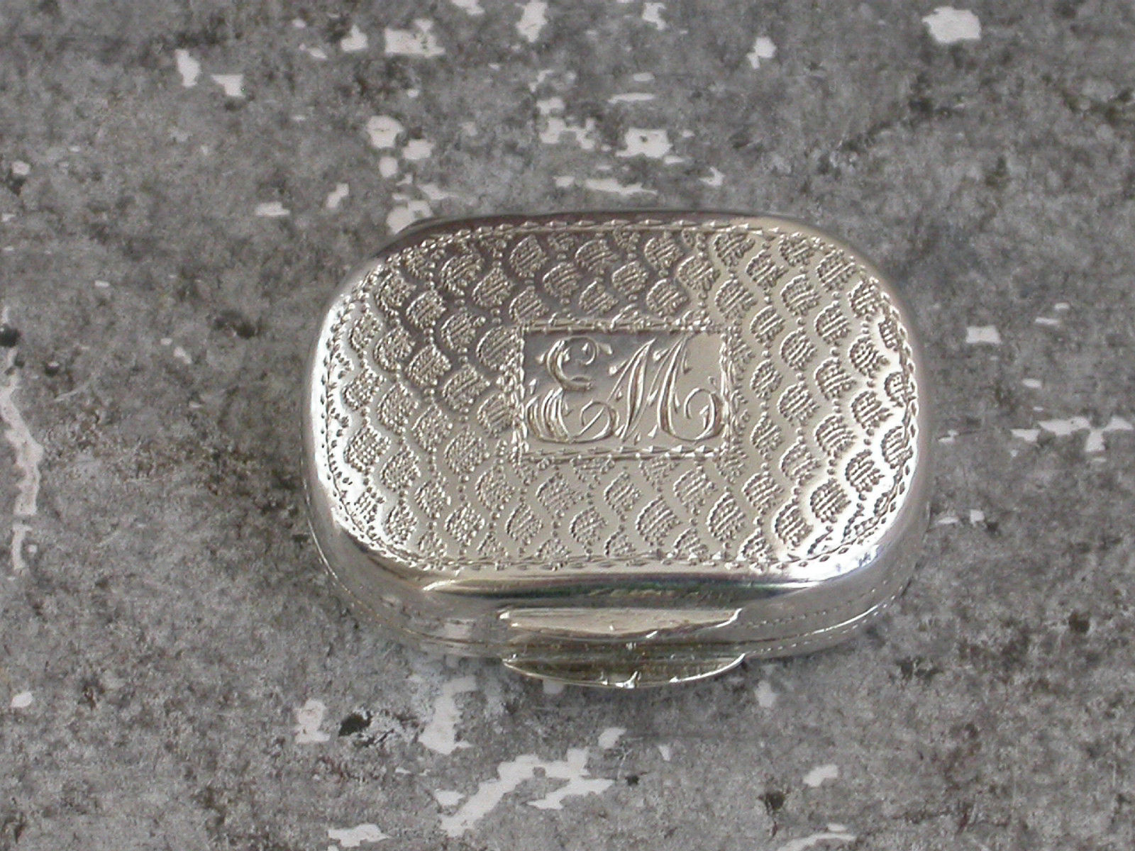 A good George III miniature silver Vinaigrette of oval cushion shape with bright-cut engraved fish scale decoration to the lid and also engraved with contemporary script initials 'EM', the silver gilt interior with simple pierced grille.