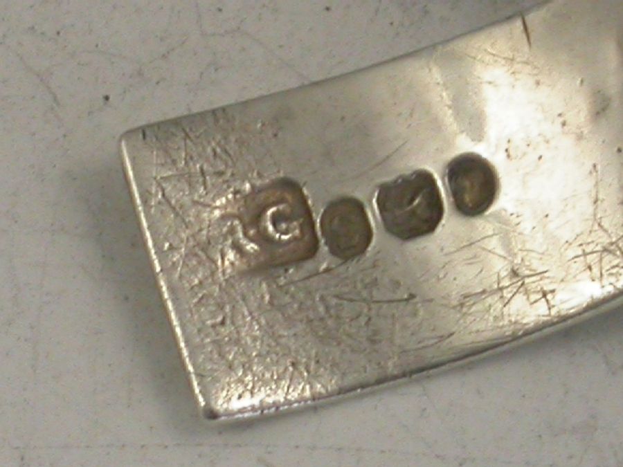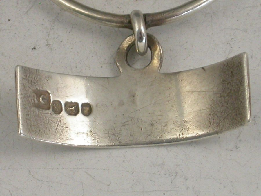 A good George III silver Sauce Label of neck ring form, the curved narrow rectangular label with single suspension eye and sold circular silver wire suspension ring, incised for Cayenne.
