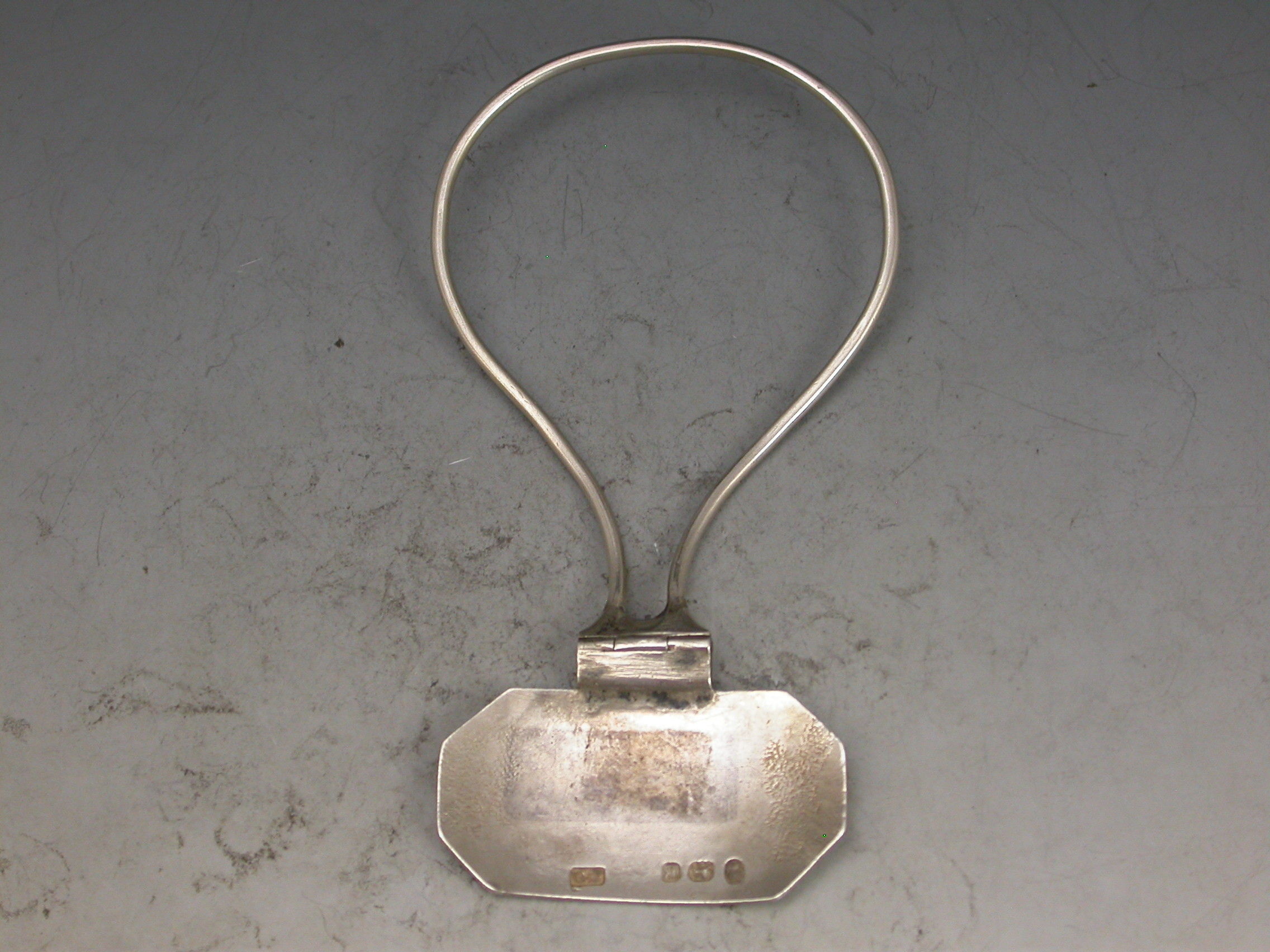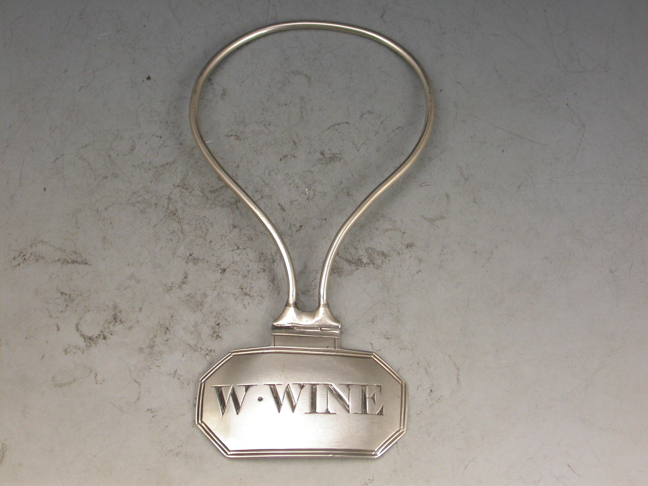 A good George III silver Wine Label of cut cornered rectangular form with hinged wire neck ring support, double reeded border, incised for W*Wine.