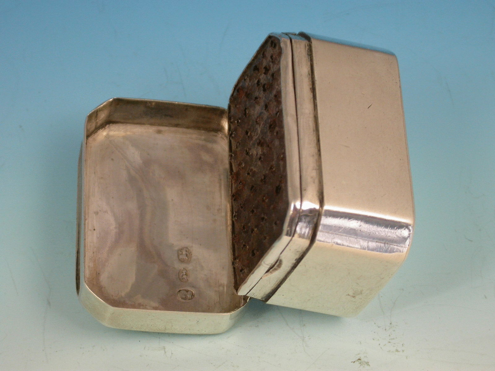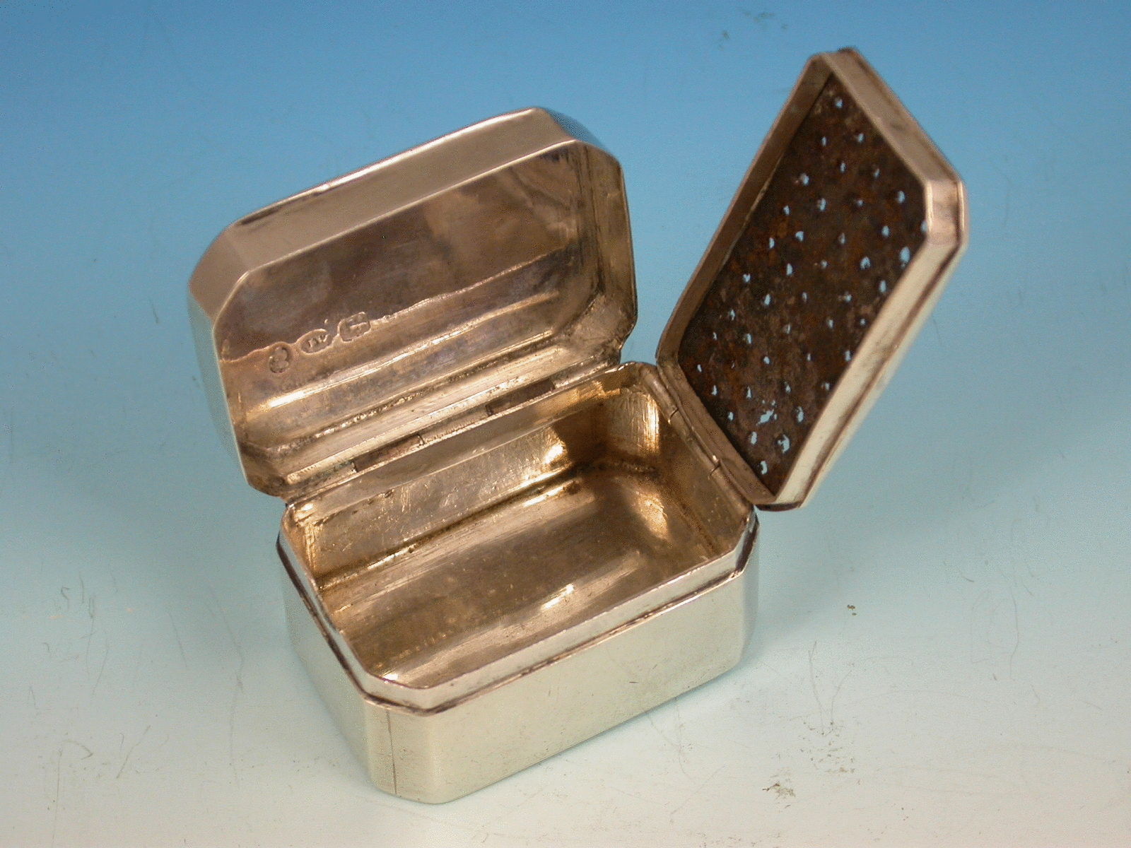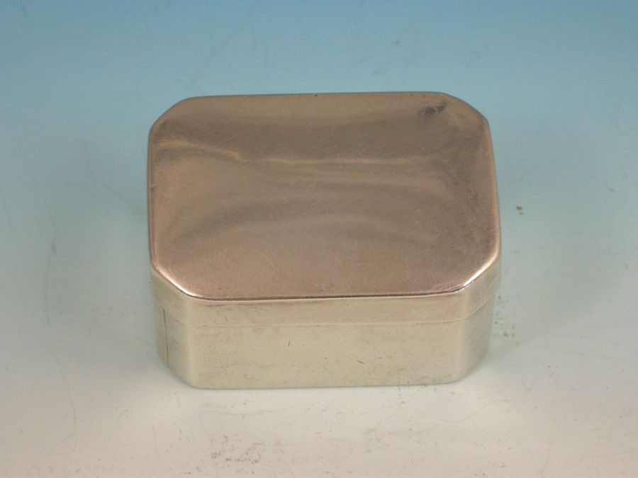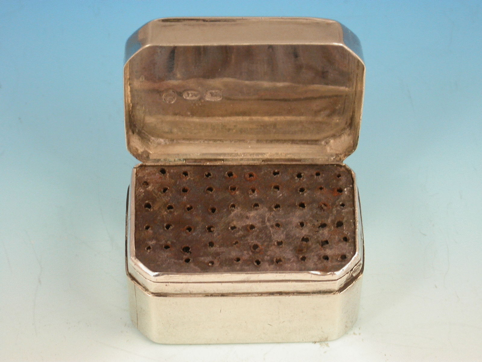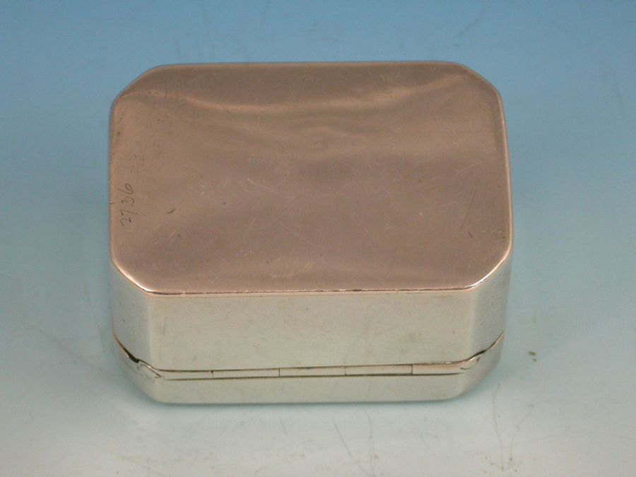 A George III silver Nutmeg Grater of perfectly plain rectangualr form with canted corners and internal hinged steel grater.