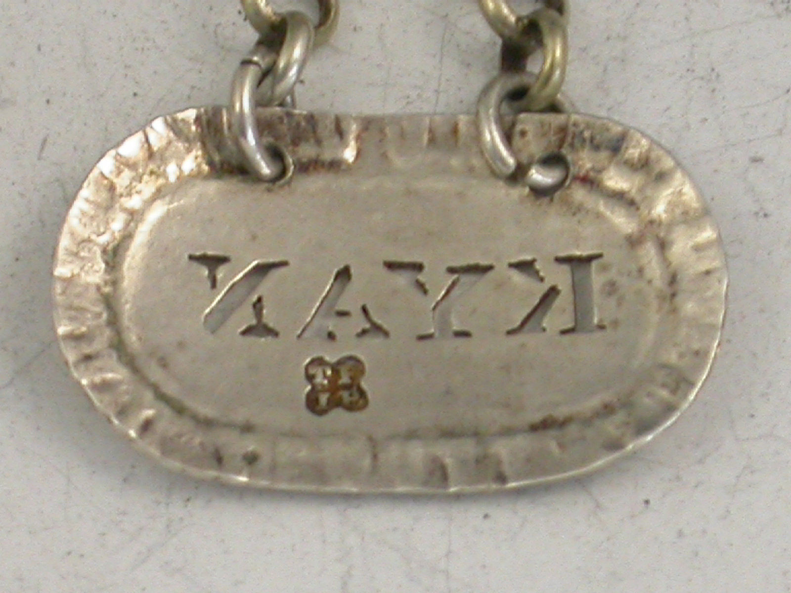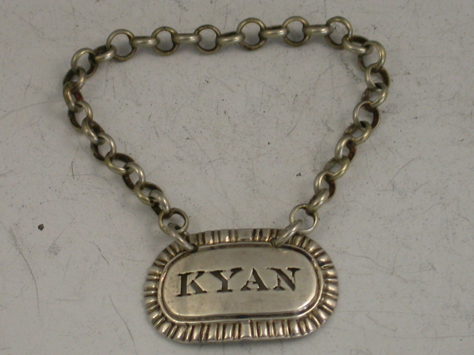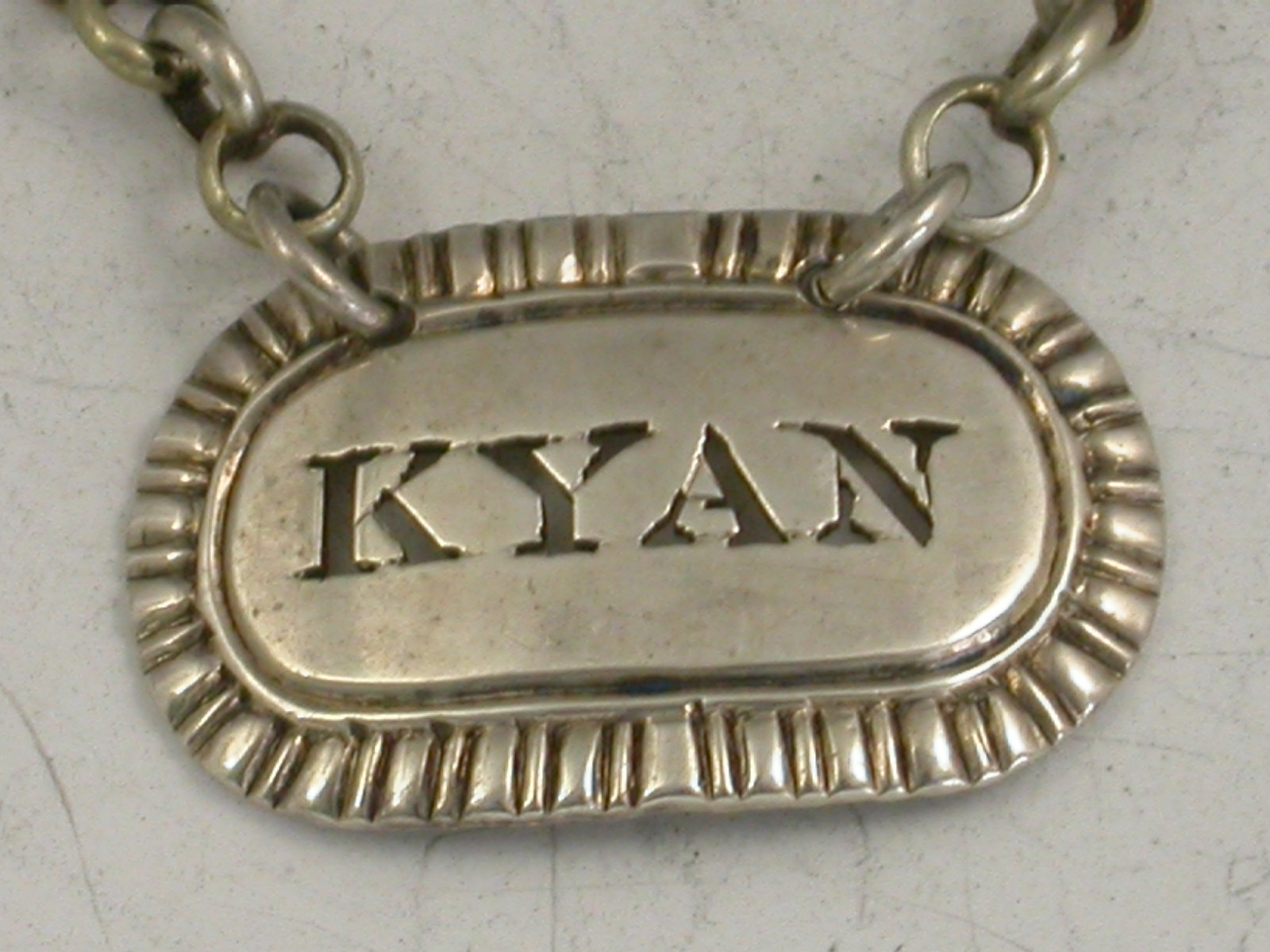 A George III small silver Sauce Label of rounded rectangular form with gadrooned border, pierced for Kyan.