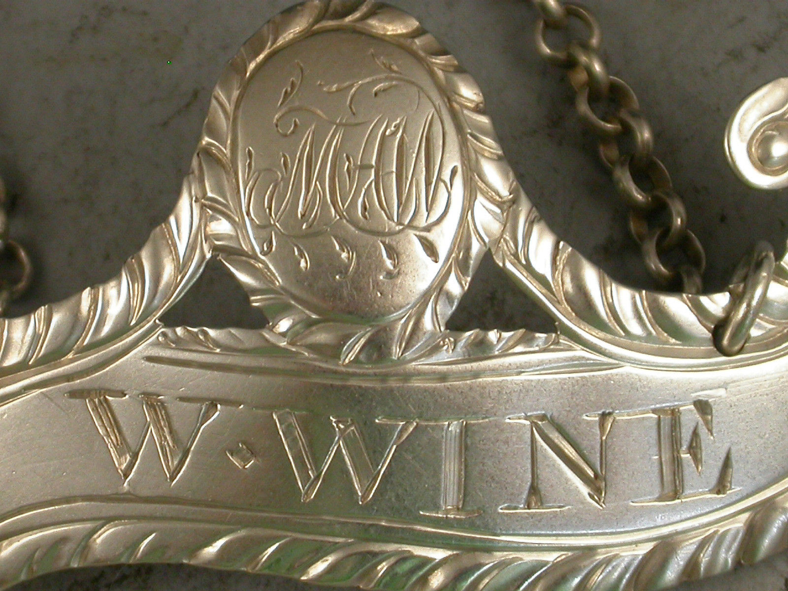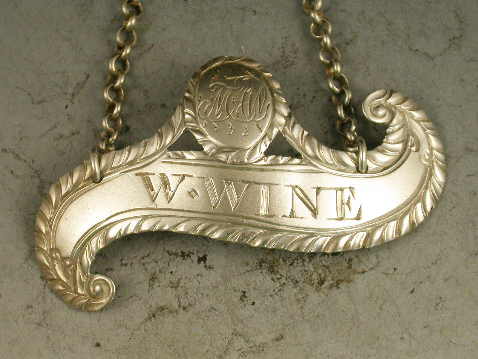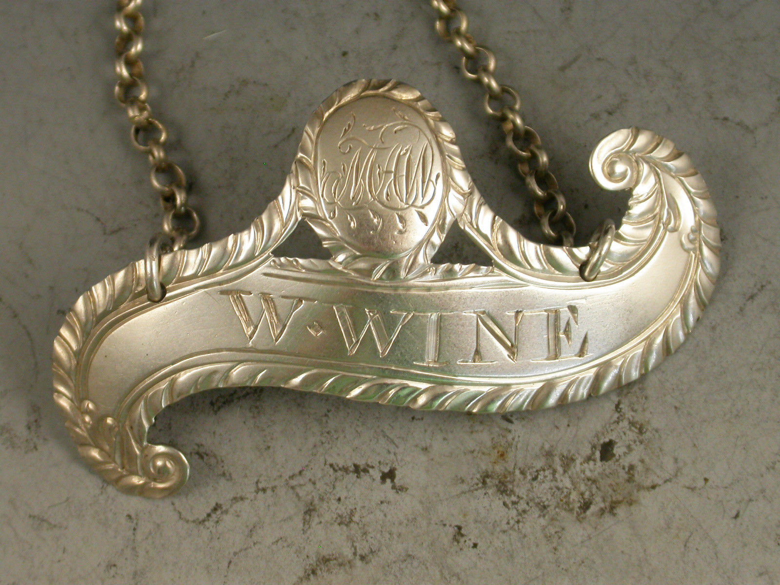 A fine George III silver Wine Label of scroll form with feather edge border, an oval cartouche above engraved with contemporary scrolled initials ""MAW"", incised for W*Wine.
