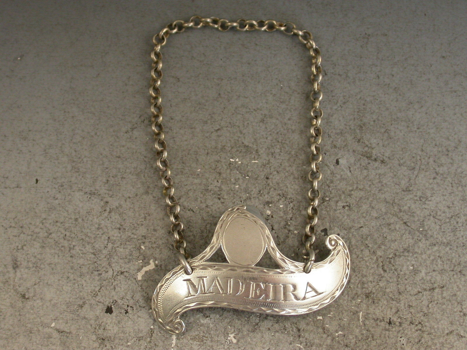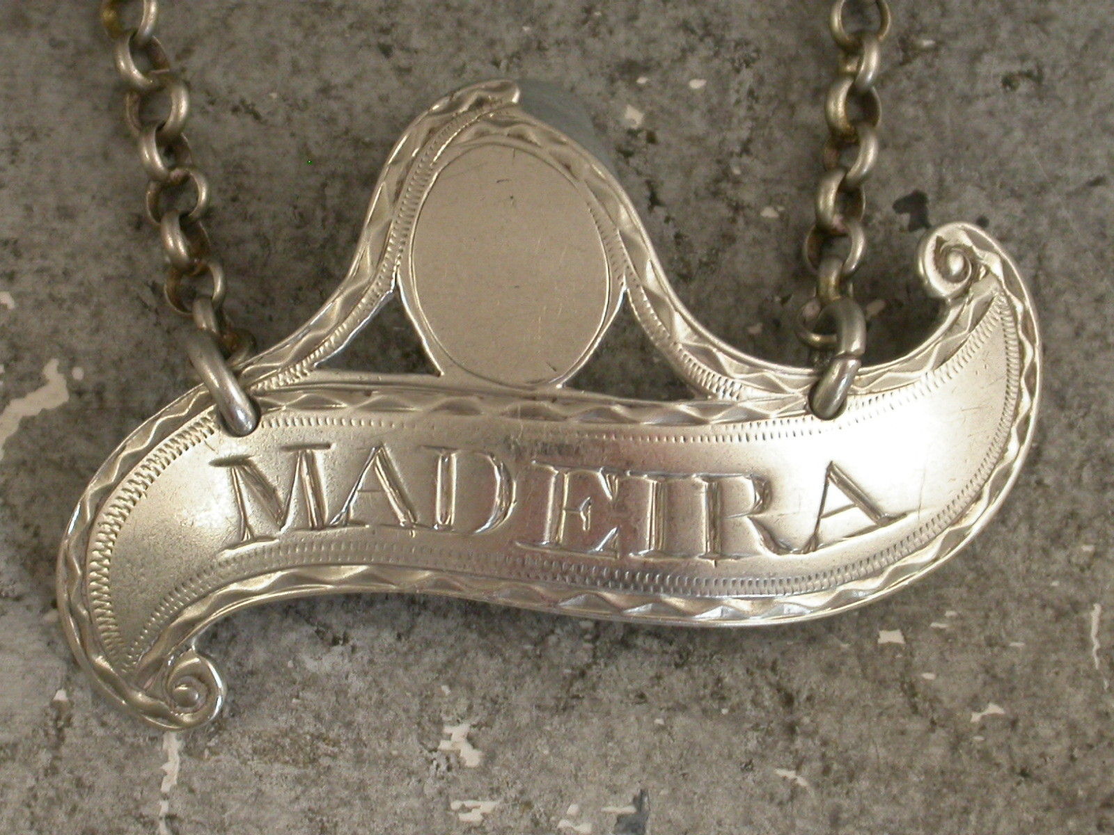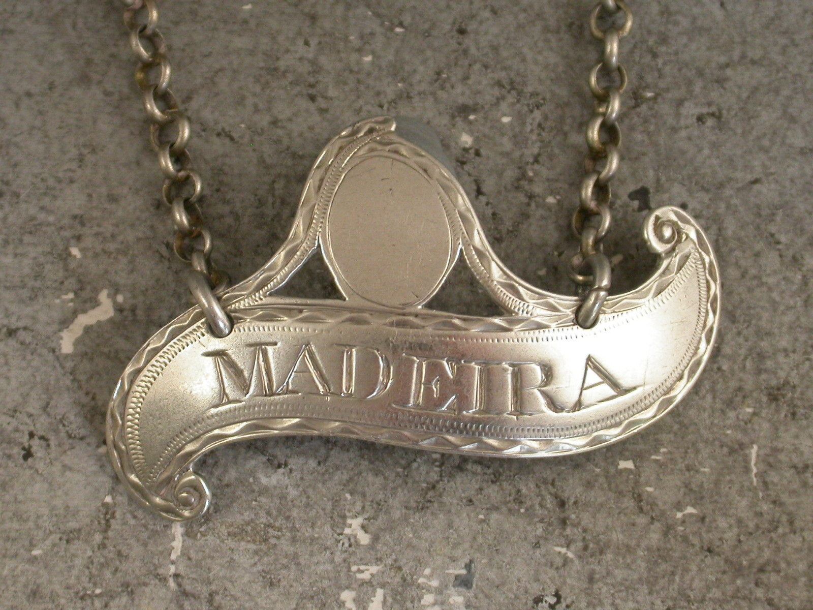 A very fine George III silver Wine Label of scroll form with vacant oval cartouche surmount and of a smaller than average size, with bright-cut engraved decoration to the border, incised for Madeira.