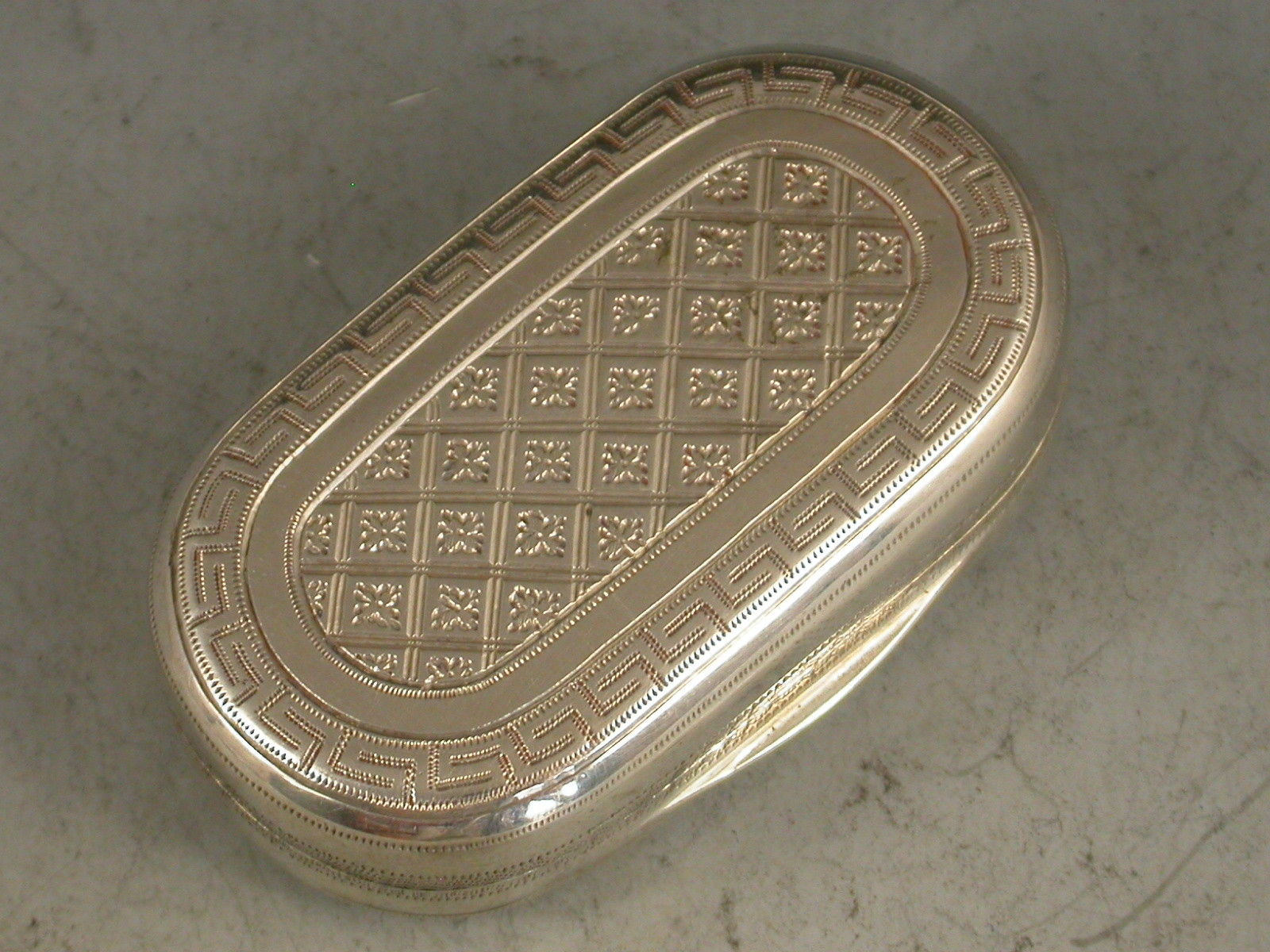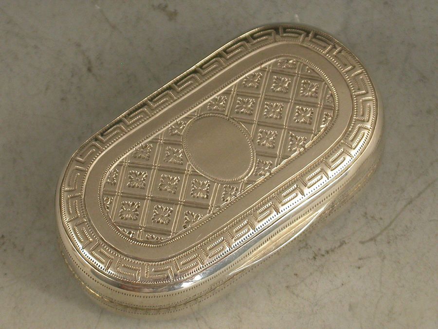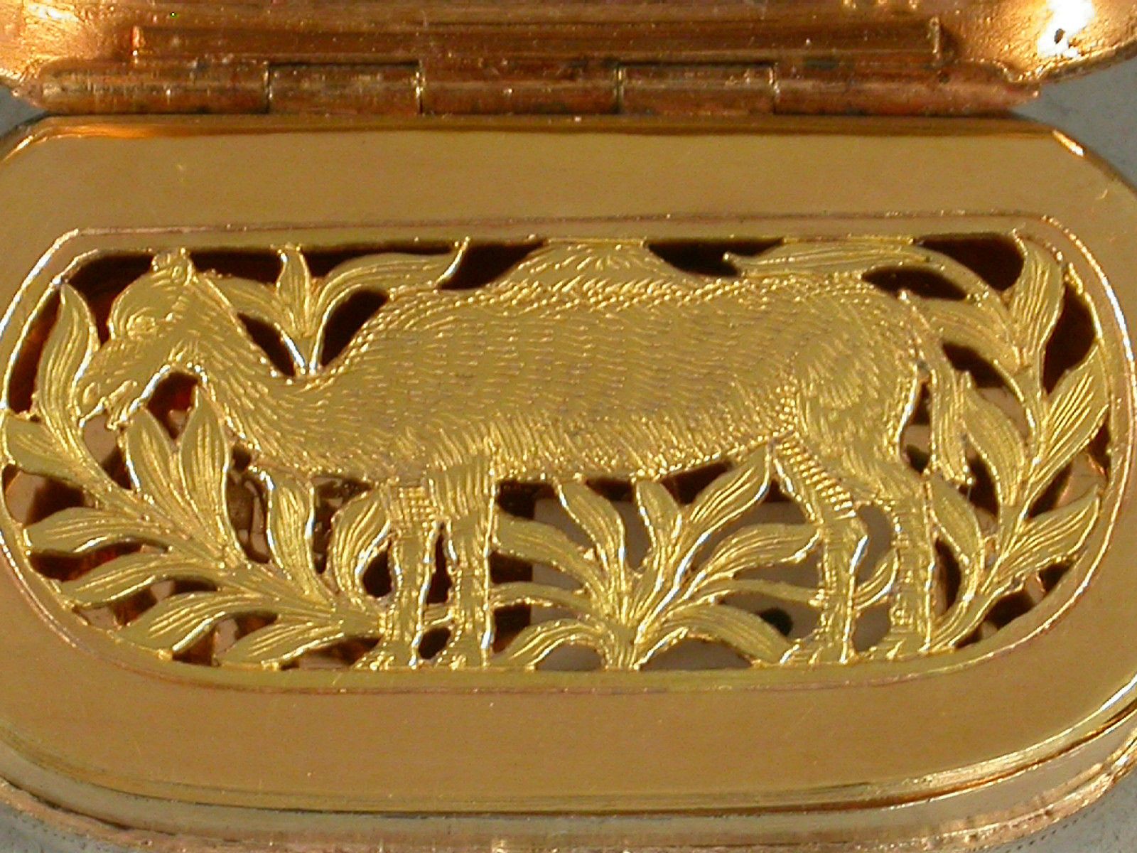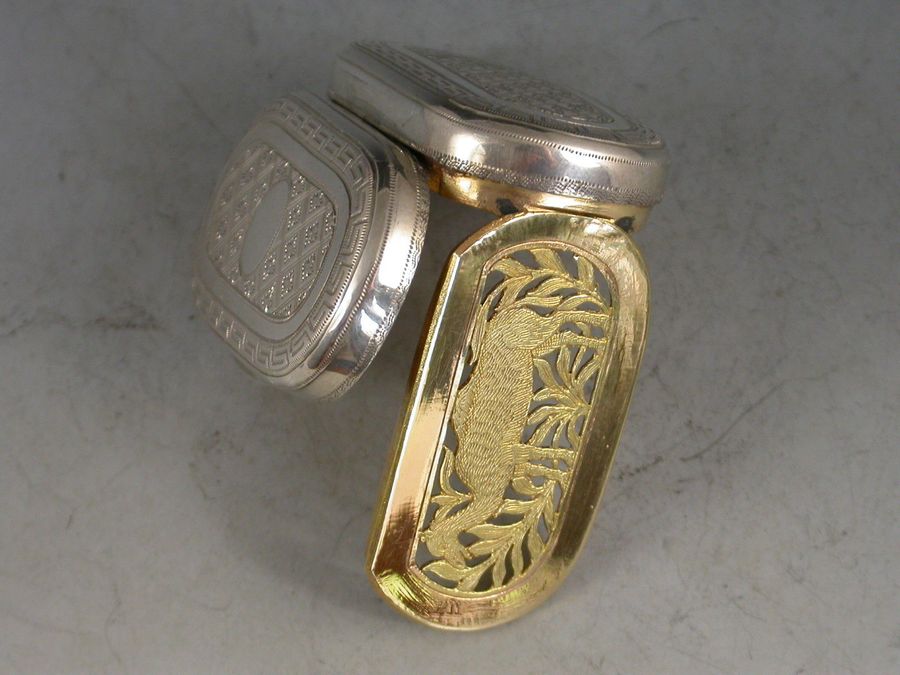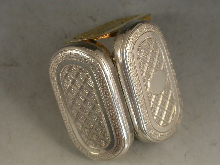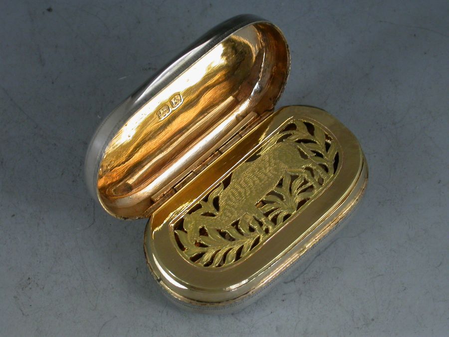 An extremely rare and fine quality George III London made silver Vinaigrette of rounded rectangular form, the lid and base decorated with fine bright-cut engraved patterns and telliswork. The silver gilt interior with a finely pierced grille depicting a camel.