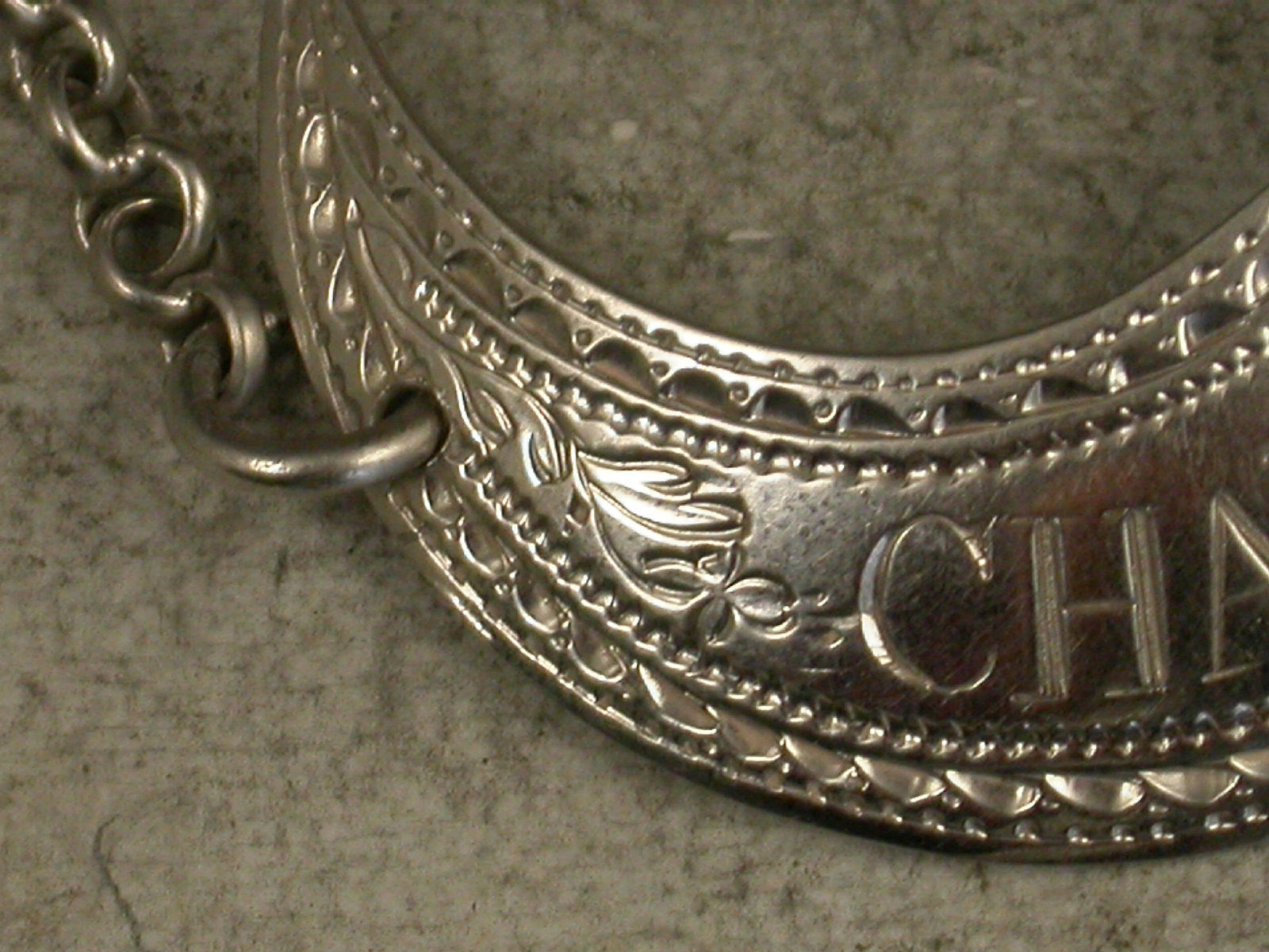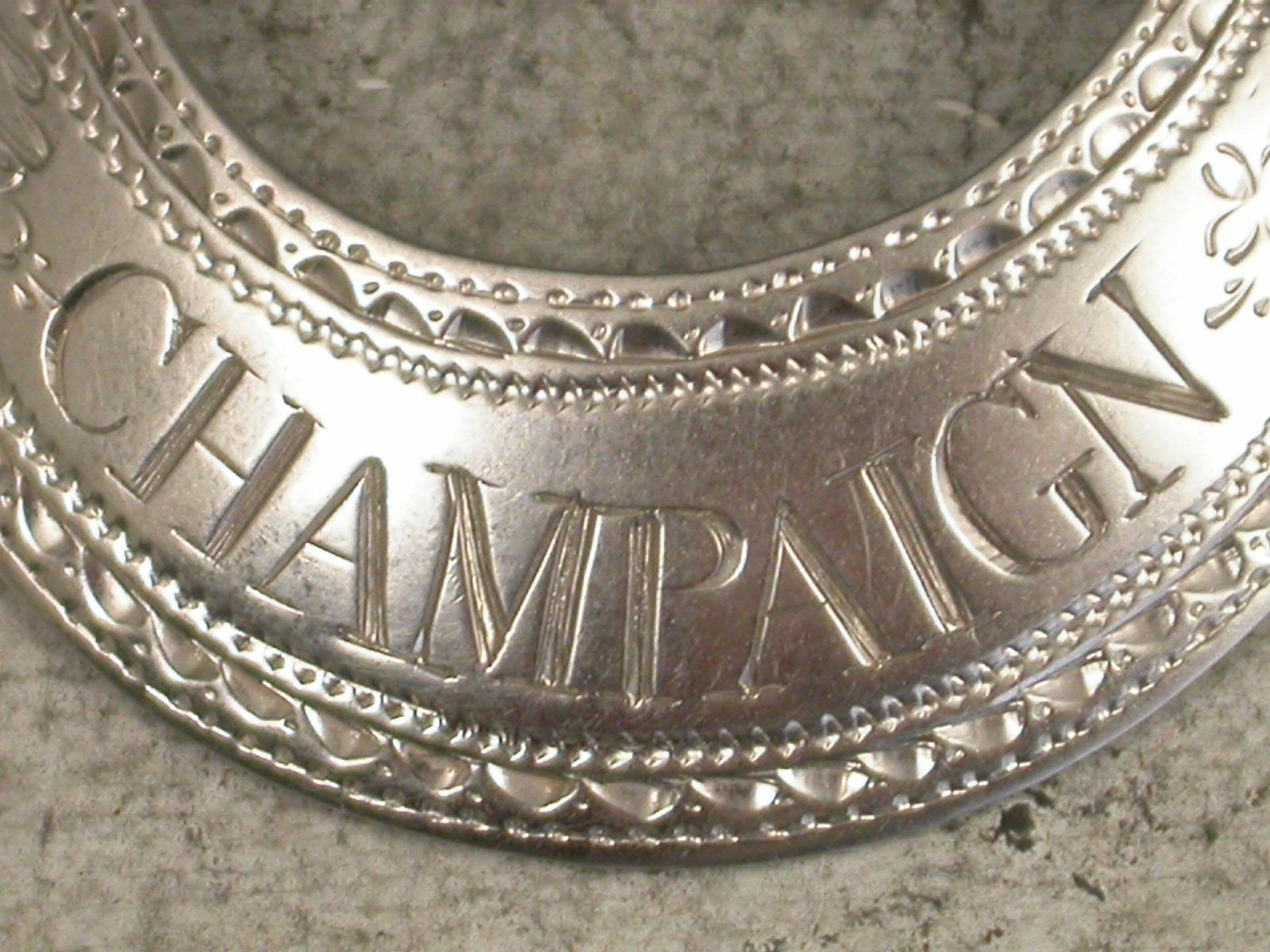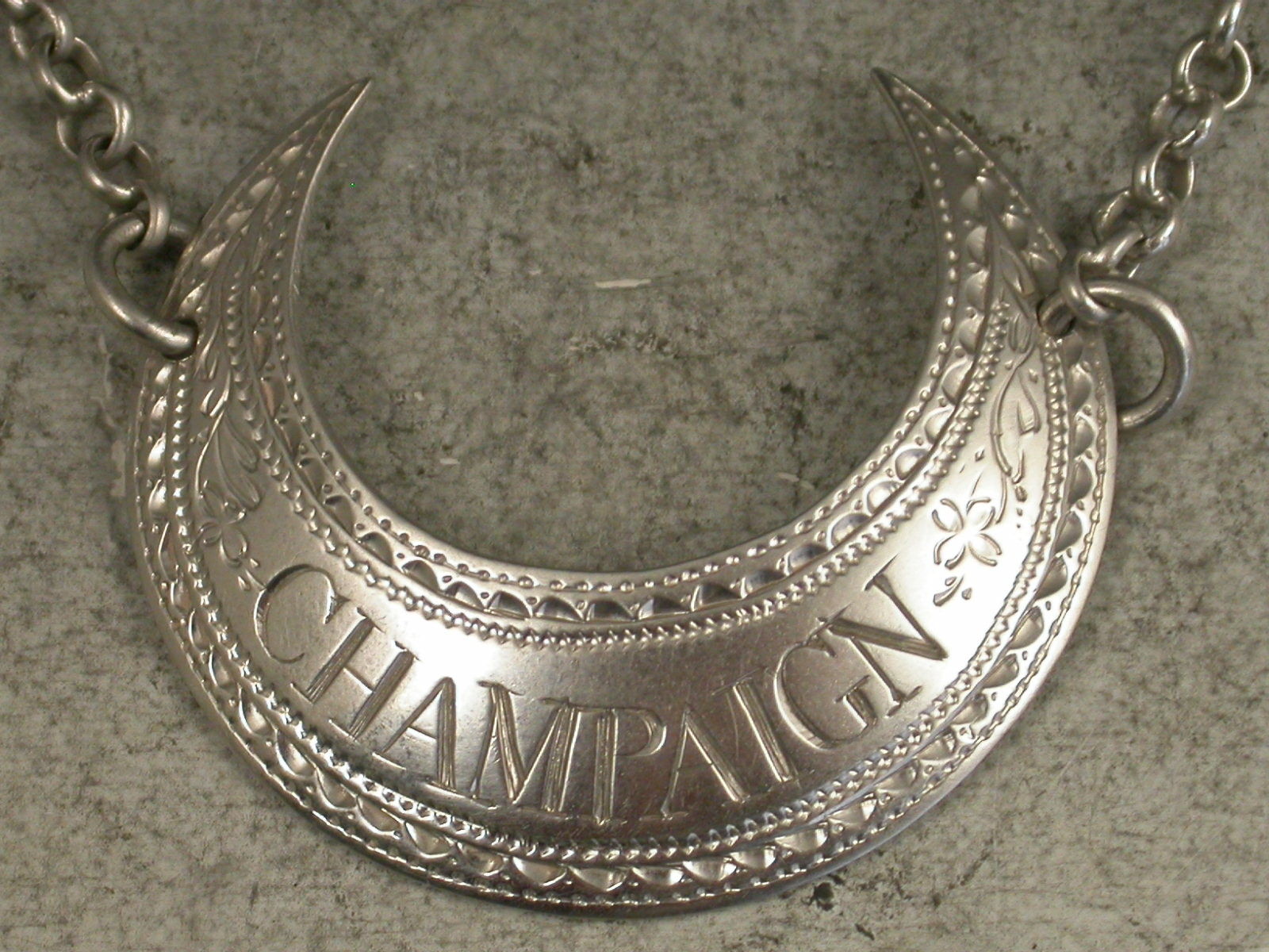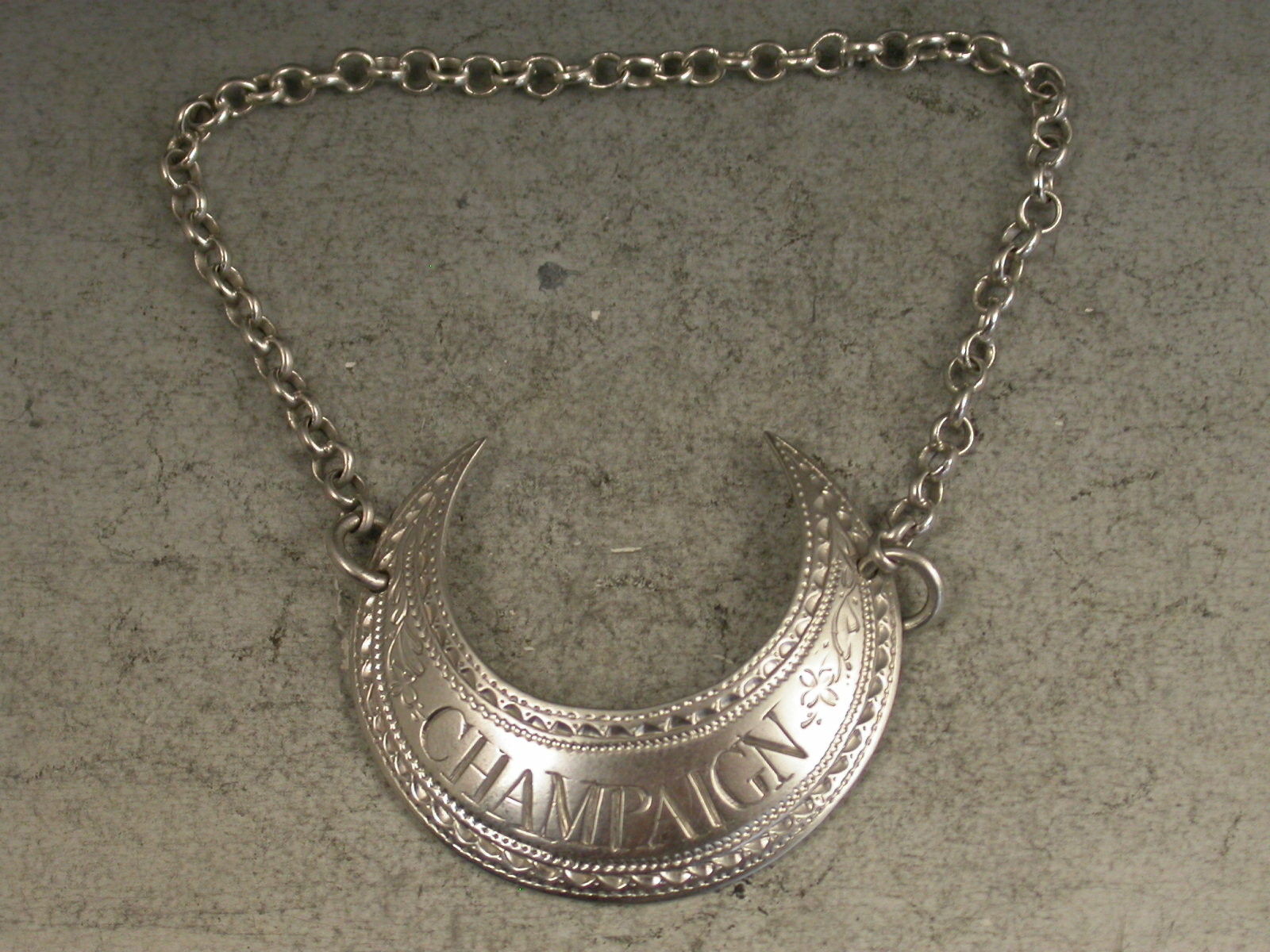 A fine George III silver Wine Label of crescent form with profuse bright-cut engraved decoration, incised for Champaign, an alternative spelling of Champagne.