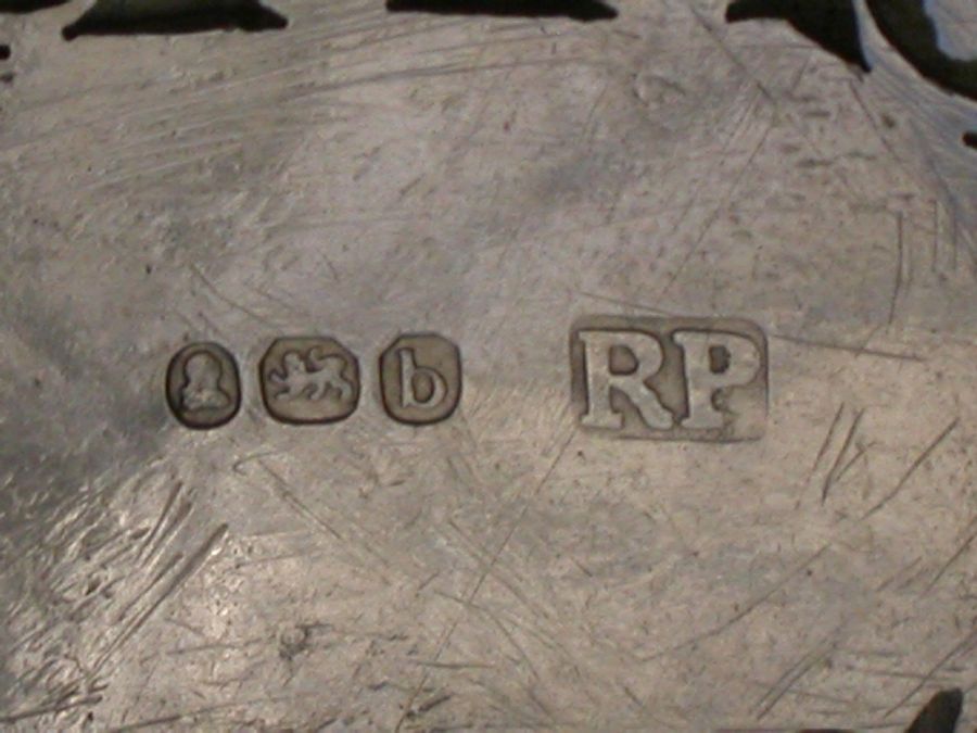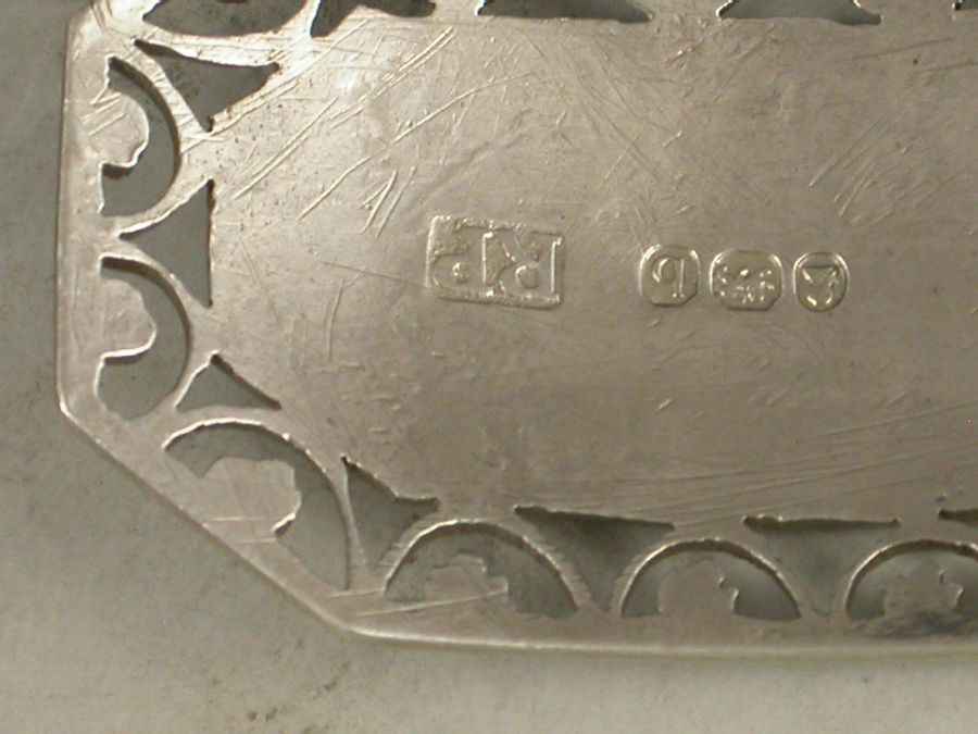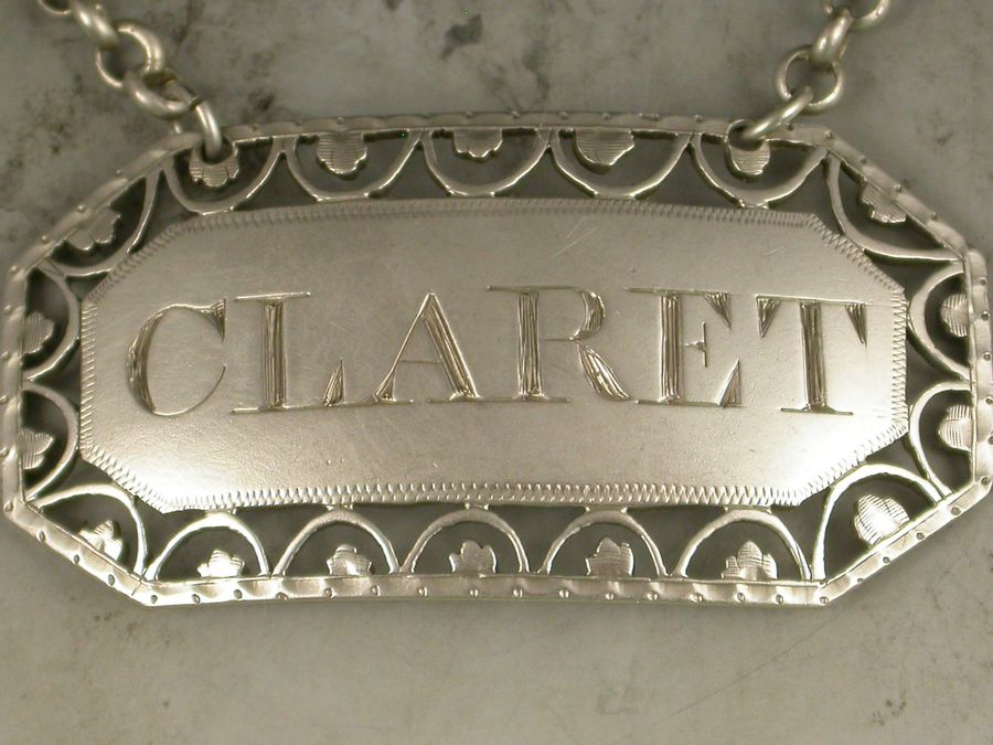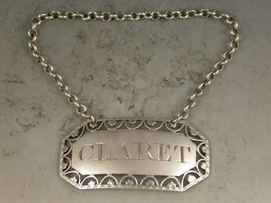 A fine George III silver Wine Label of rectangular form with cut-corners, intricately pierced and bright-cut engraved border of hoops and trefoils, incised for Claret.