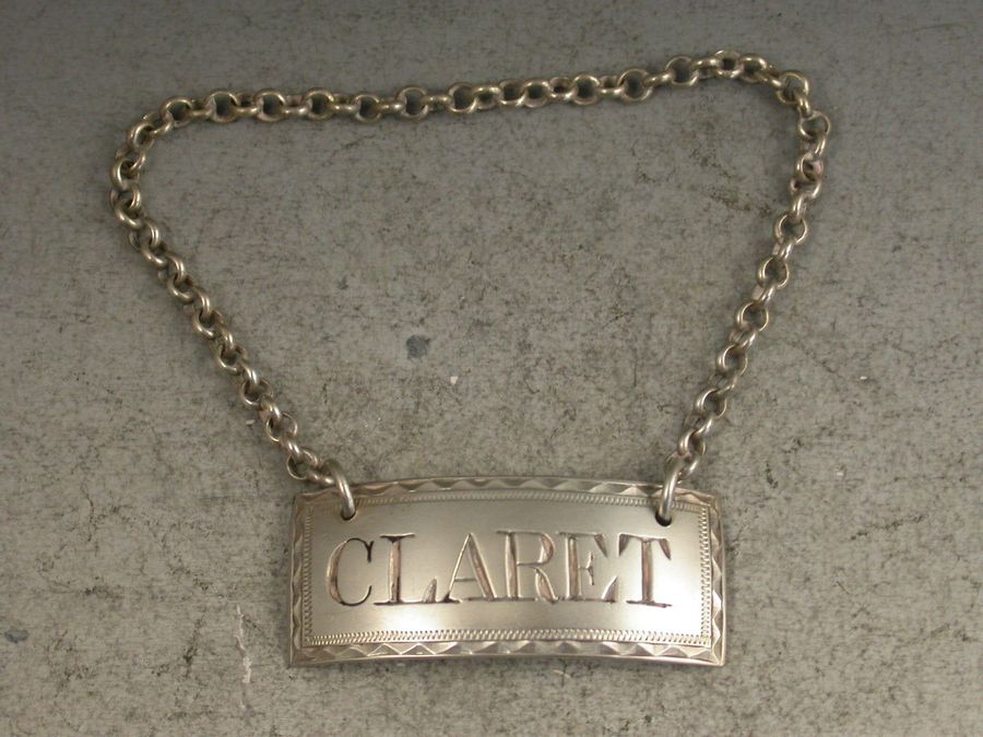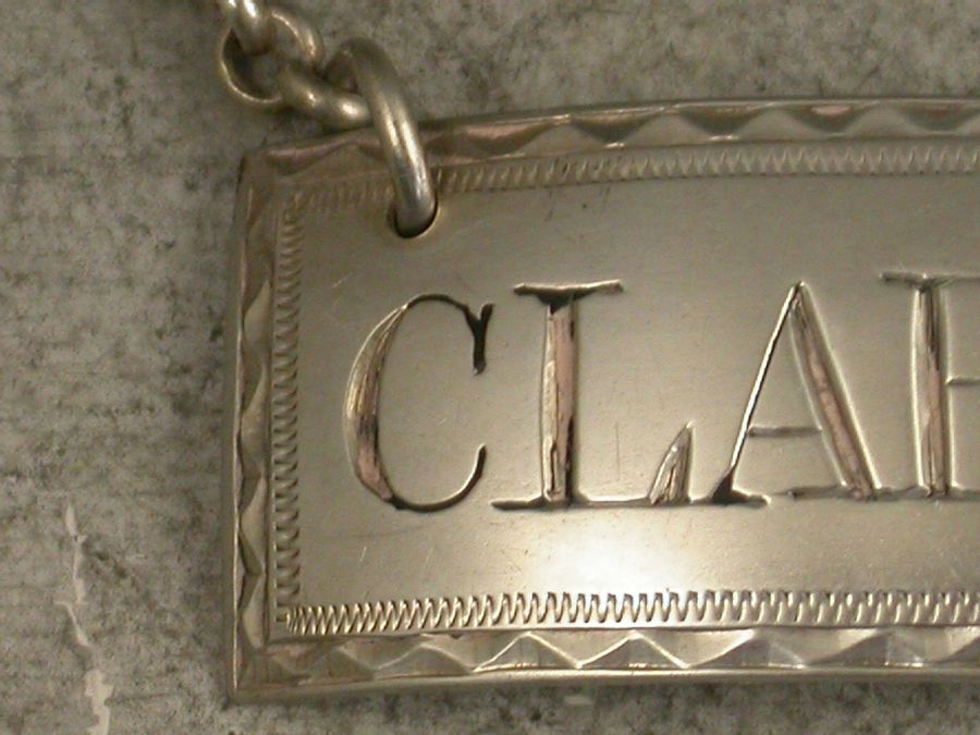 A good George III silver Wine Label of rectangular form with bright-cut engraved and wriggle work border, incised for Claret.