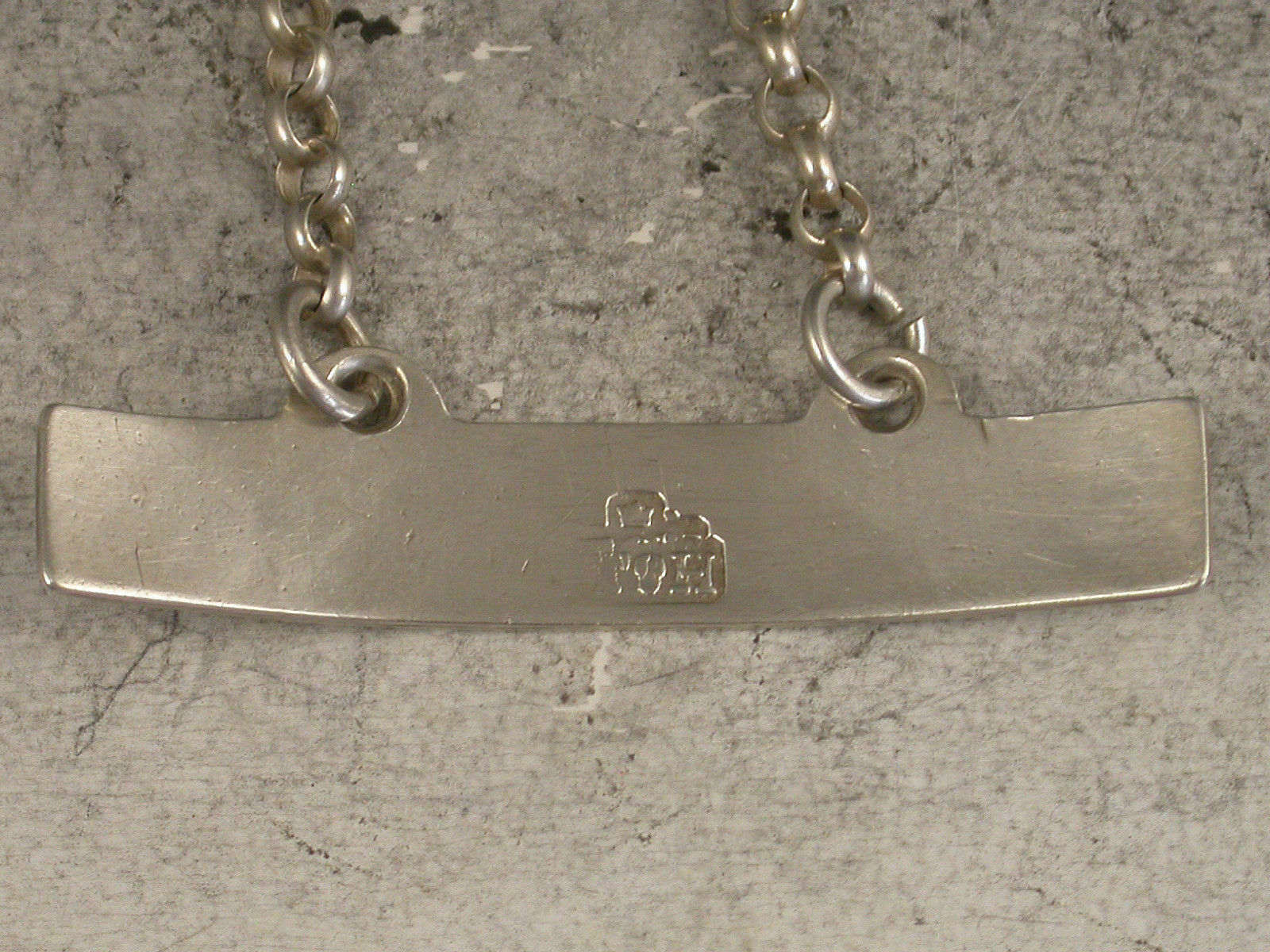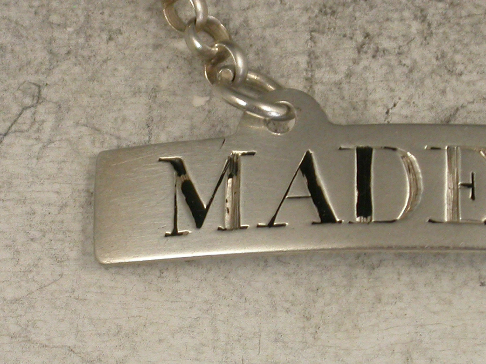 An early George III silver Wine Label of plain curved narrow rectangular form with raised eyelets, incised and niello filled for Madeira.