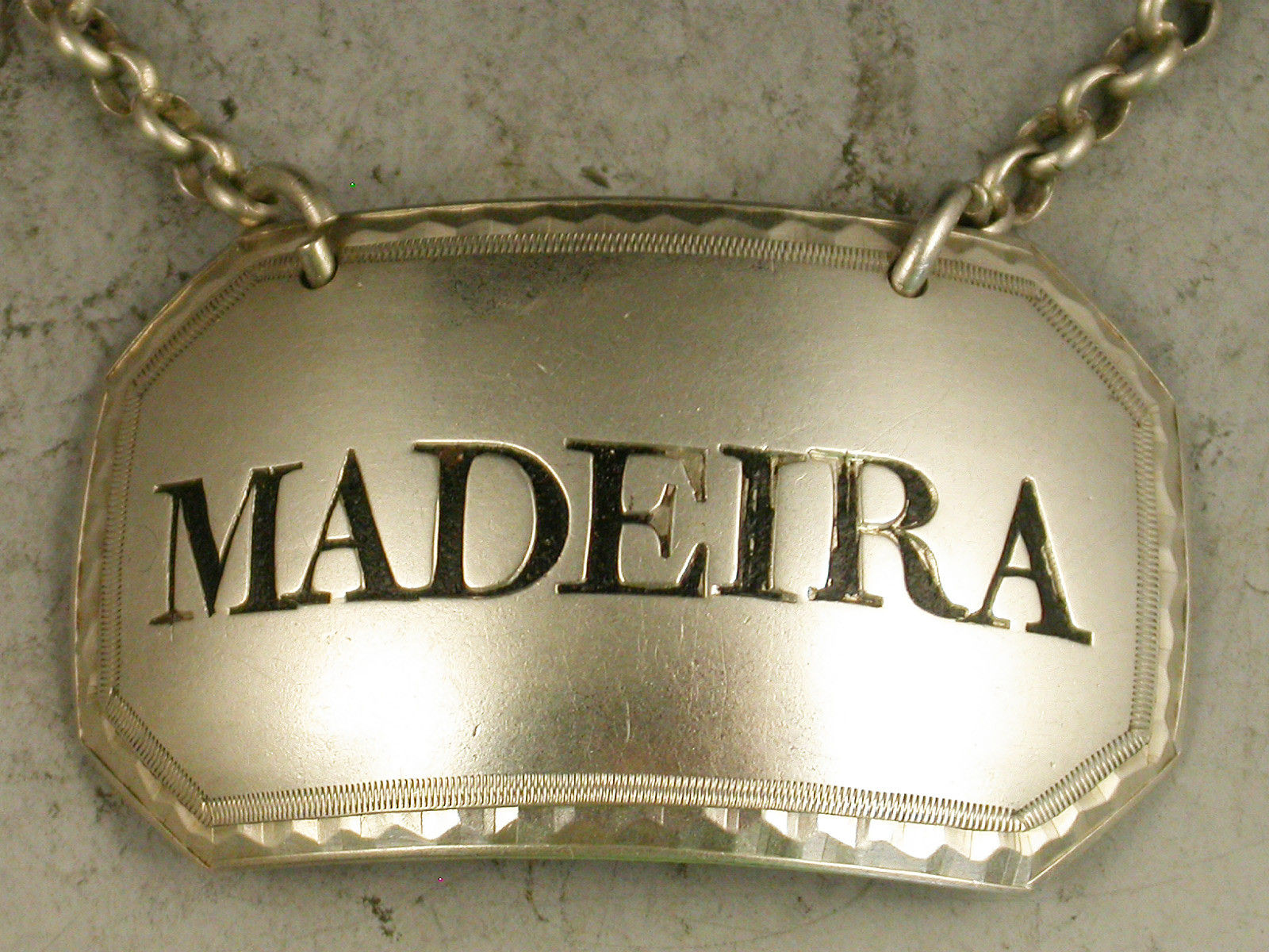 A good George III silver Wine Label of curved cut-cornered rectangular form with bright -cut engraved border, incised and niello filled for Madeira.