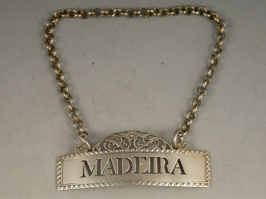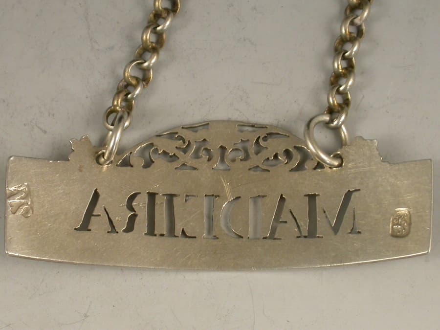 A very fine quality and attractive George III silver Wine Label of 'fret domed' rectangular form with bright-cut engraved border, the dome pierced with scrolls and a flower head with additional flower heads either side of the jumper ring attachments. Pierced for Madeira.