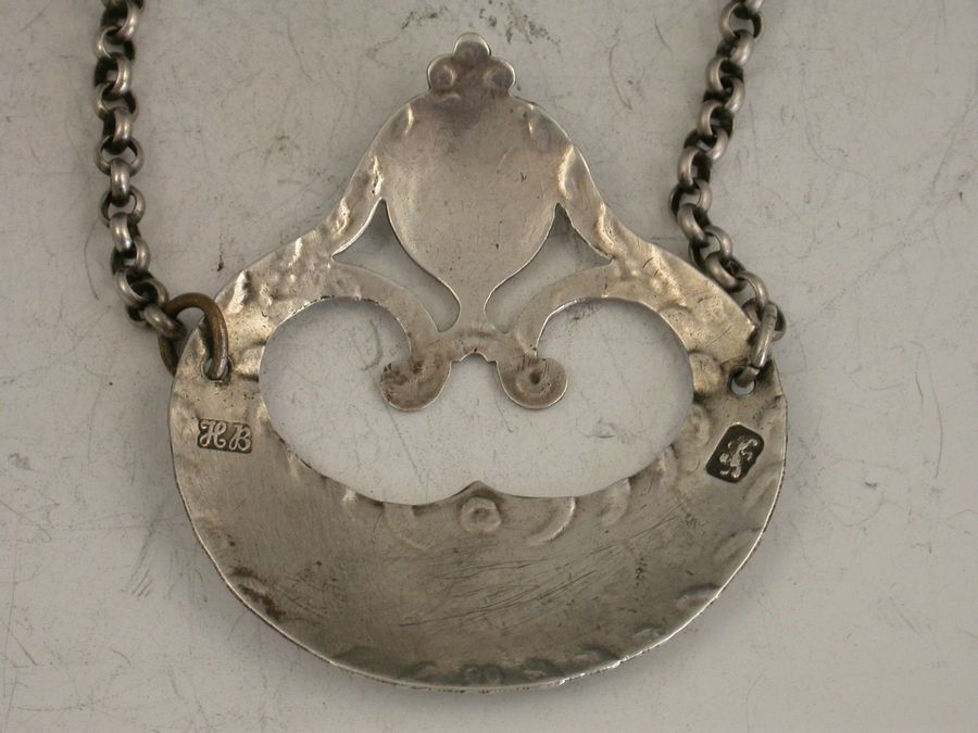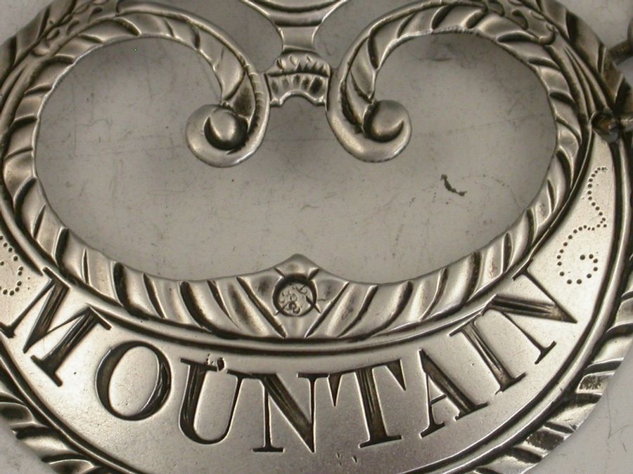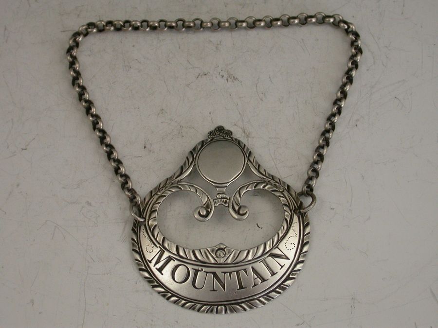 A good George III 18th century silver Wine Label of enclosed crescent form with oval cartouche above supported by swags, engraved feather edge borders, incised for Mountain.