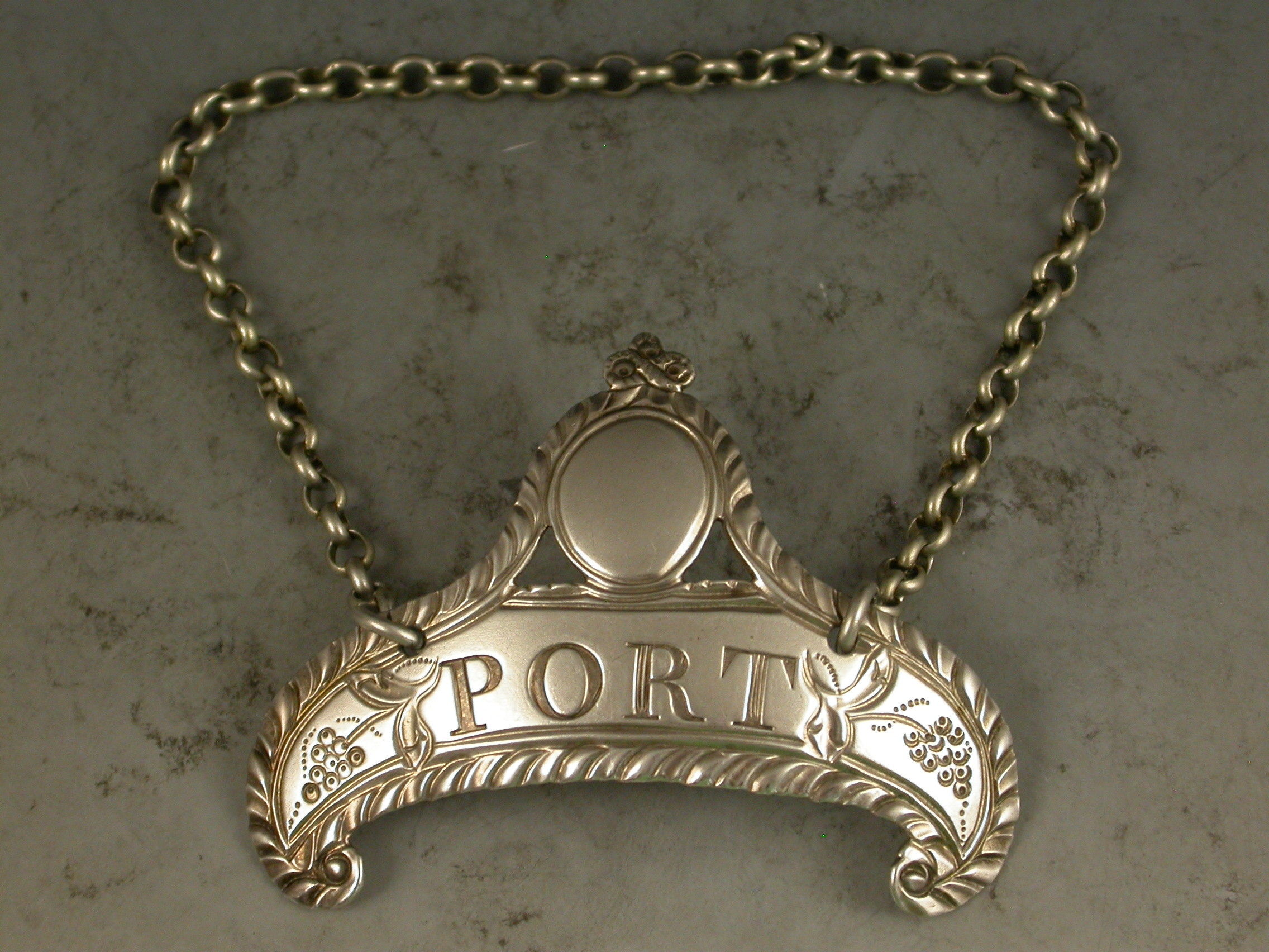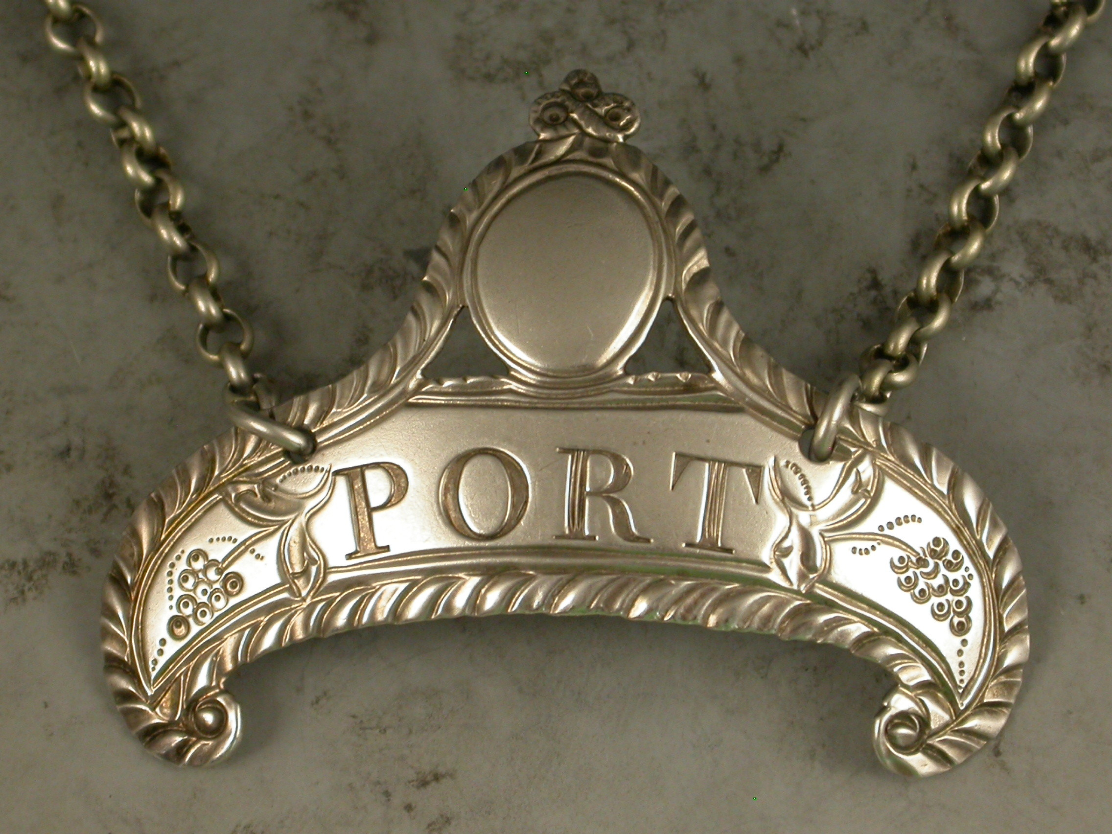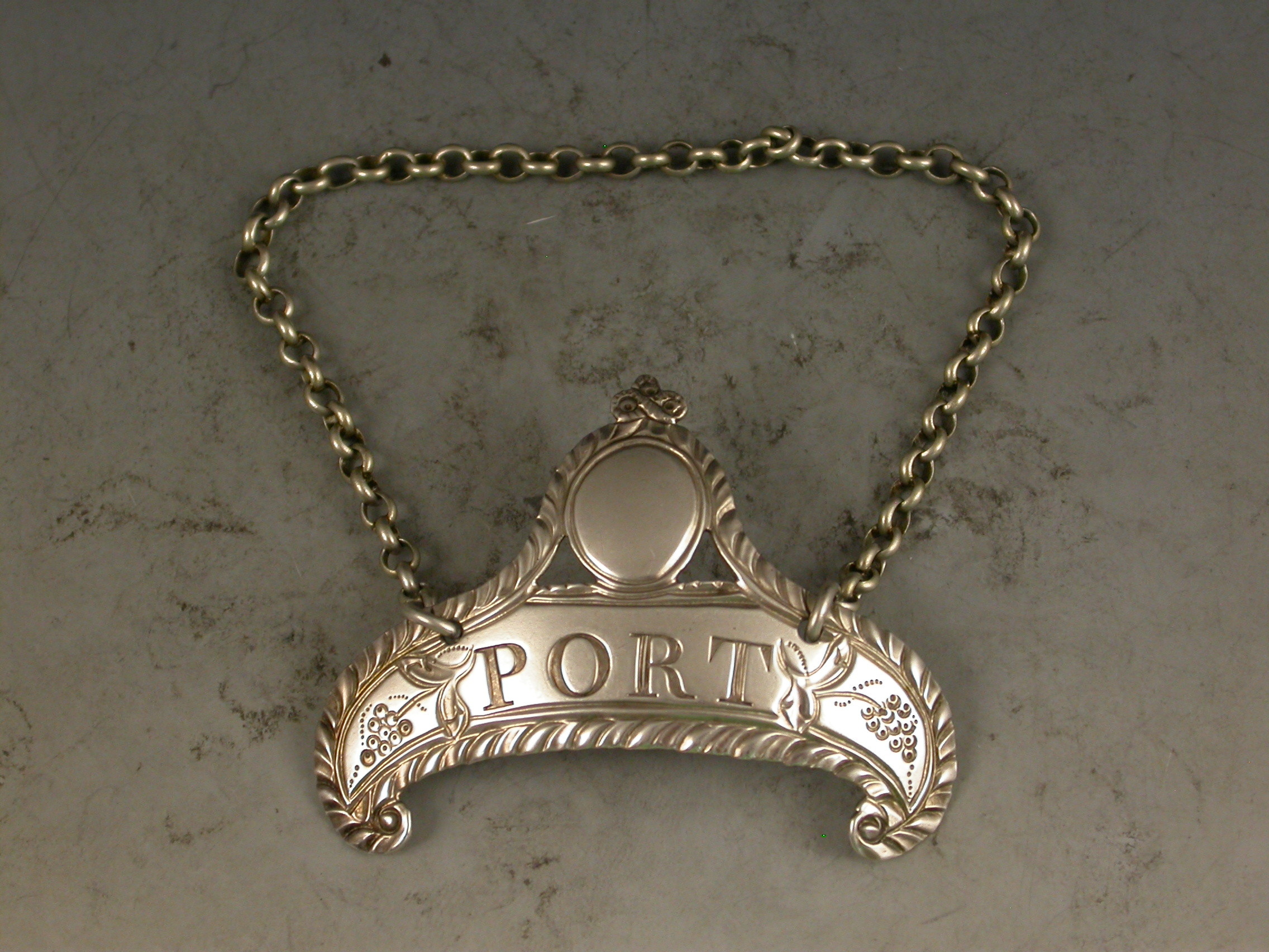 A good George III silver Wine Label of down-turned crescent form with oval cartouche above supported by swags and tied ribbon surmount, a feather edge border and an engraved floral device either side of the incised title for Port.