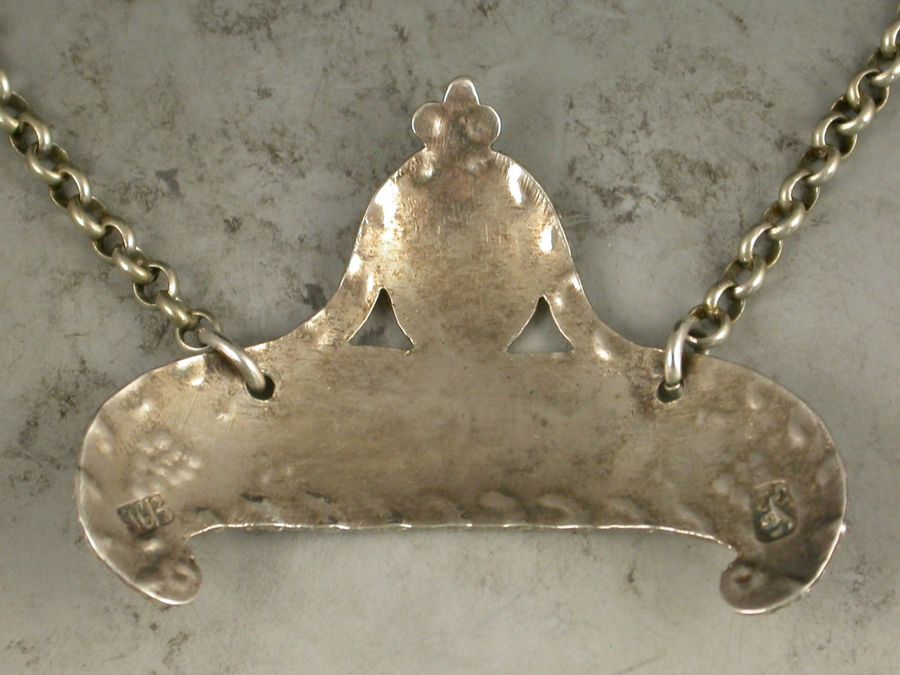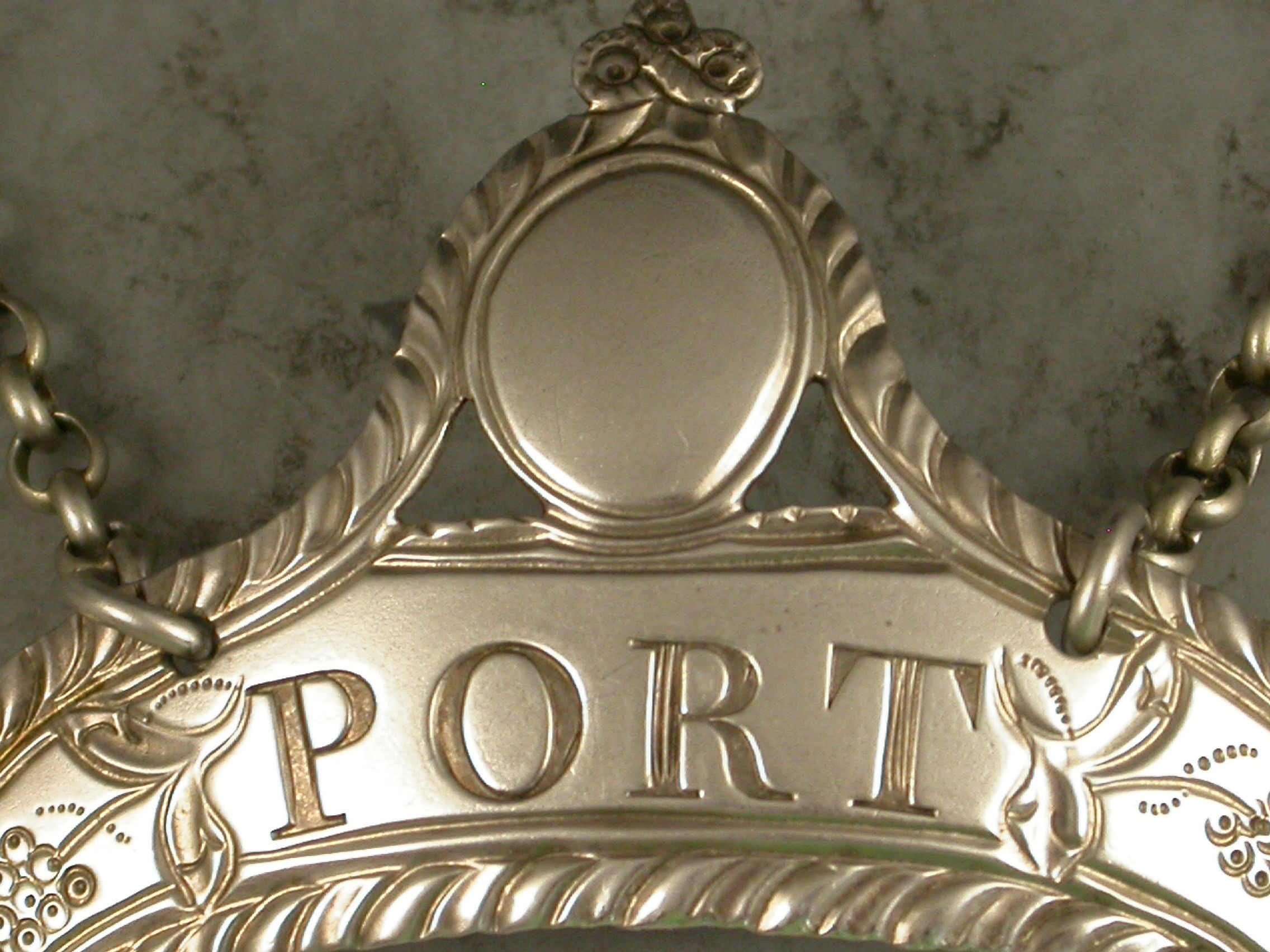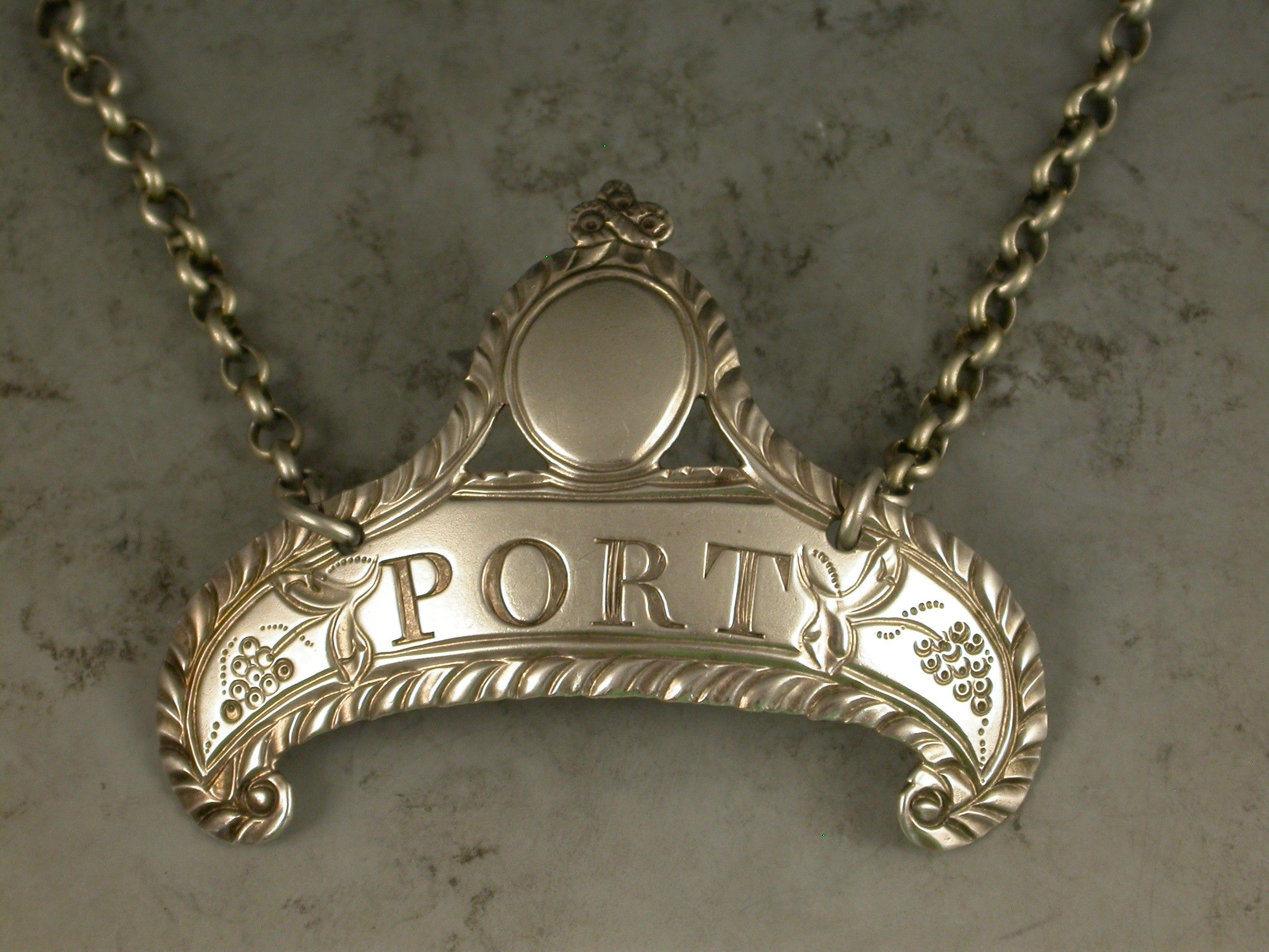 A good George III silver Wine Label of down-turned crescent form with oval cartouche above supported by swags and tied ribbon surmount, a feather edge border and an engraved floral device either side of the incised title for Port.