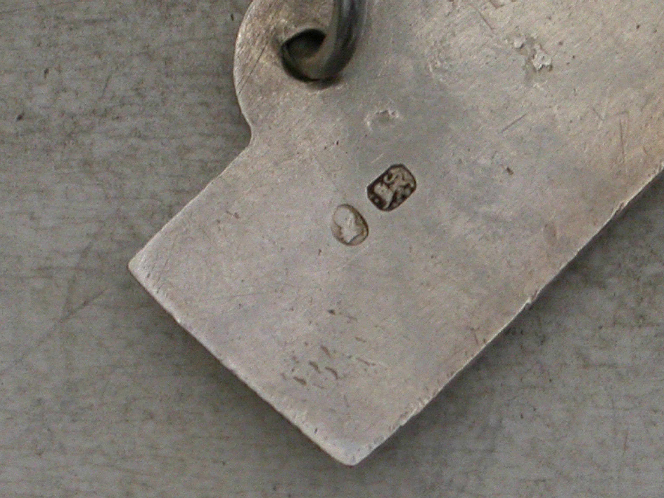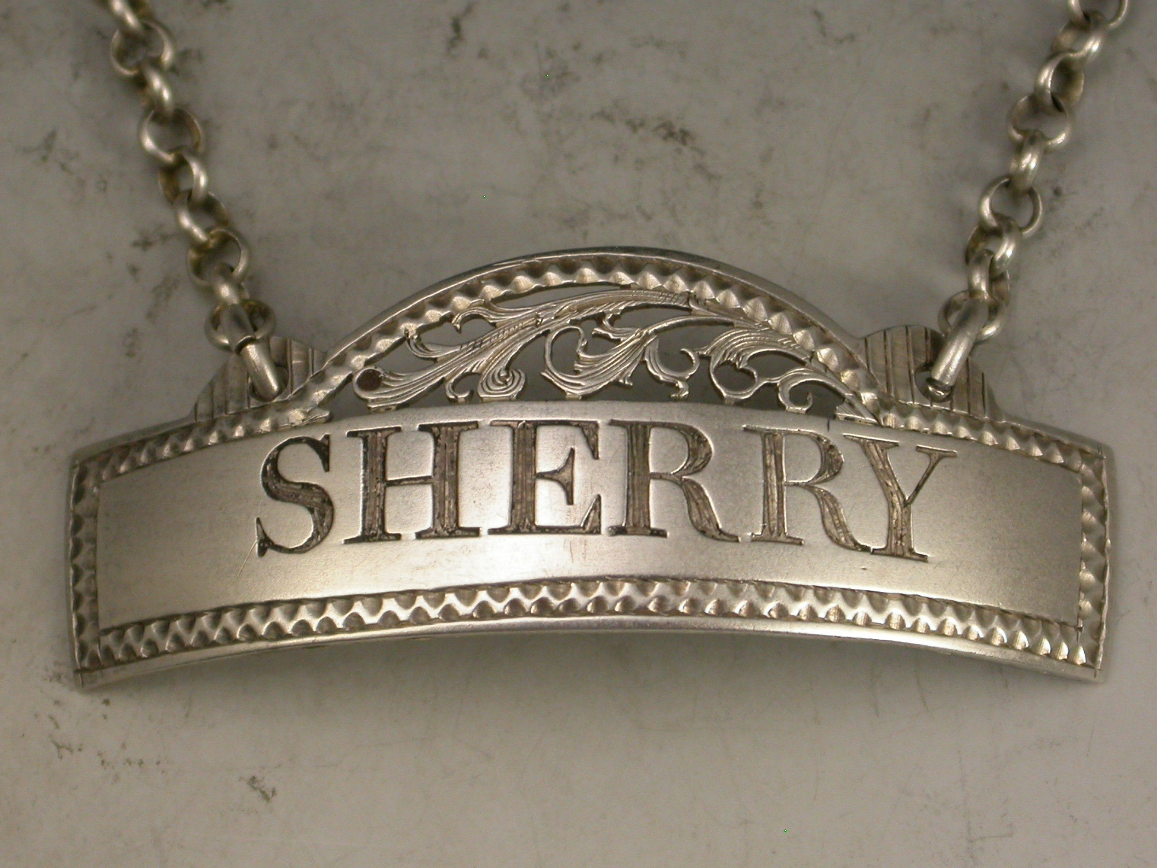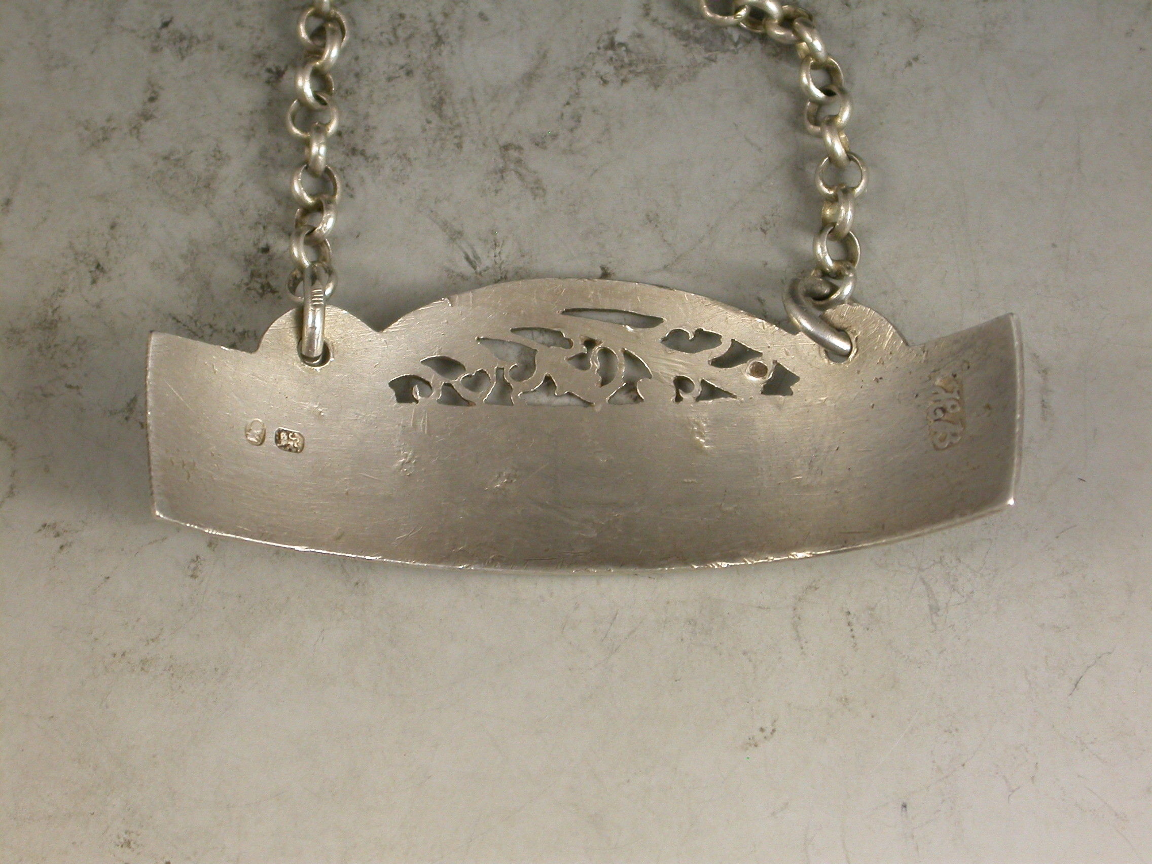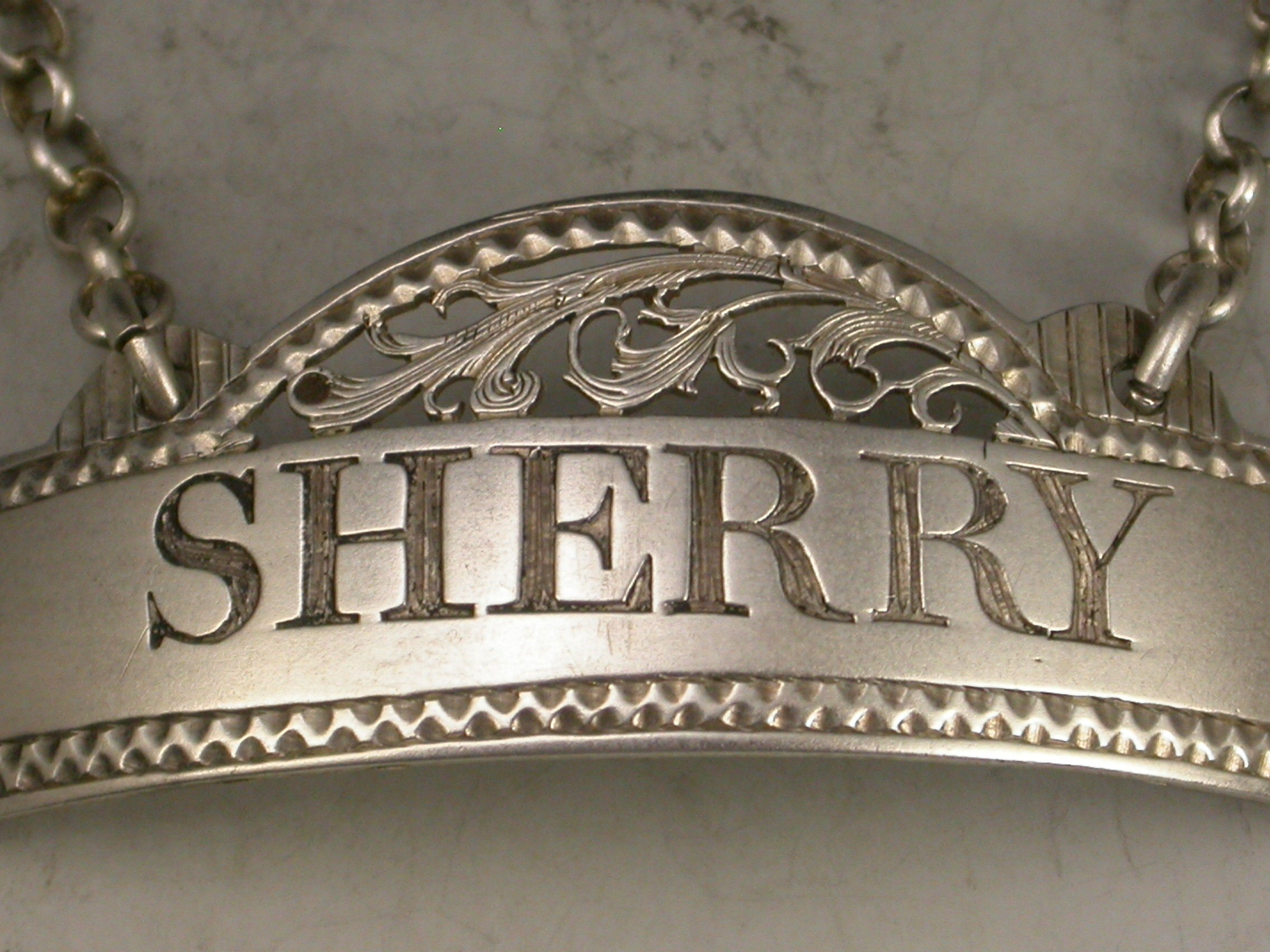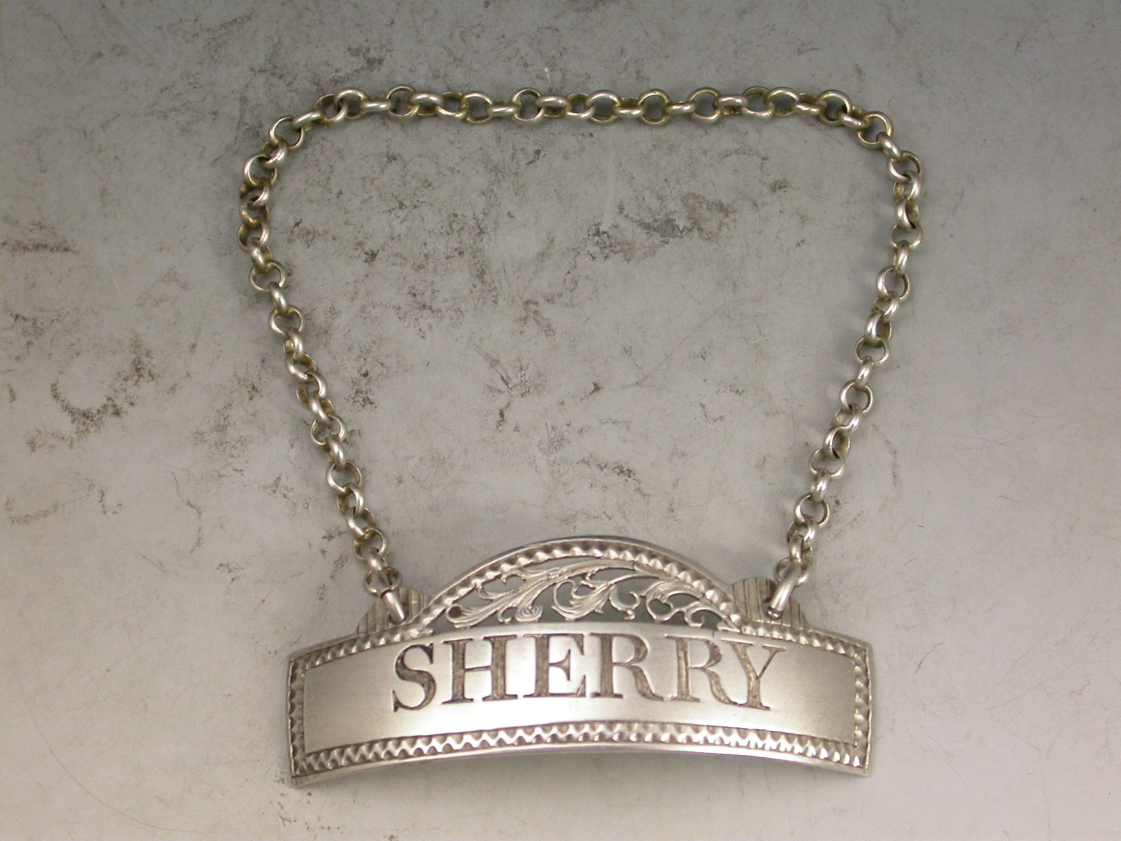 A fine George III 18th century silver Wine Label of fret domed rectangular form with bright cut engraved border and raised eyelets, the pierced domed surmount with scroll decoration, incised for Sherry.