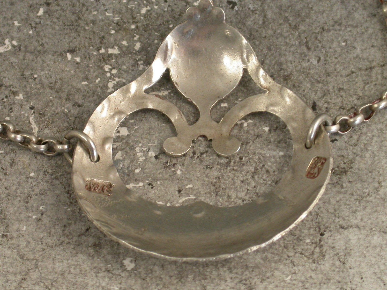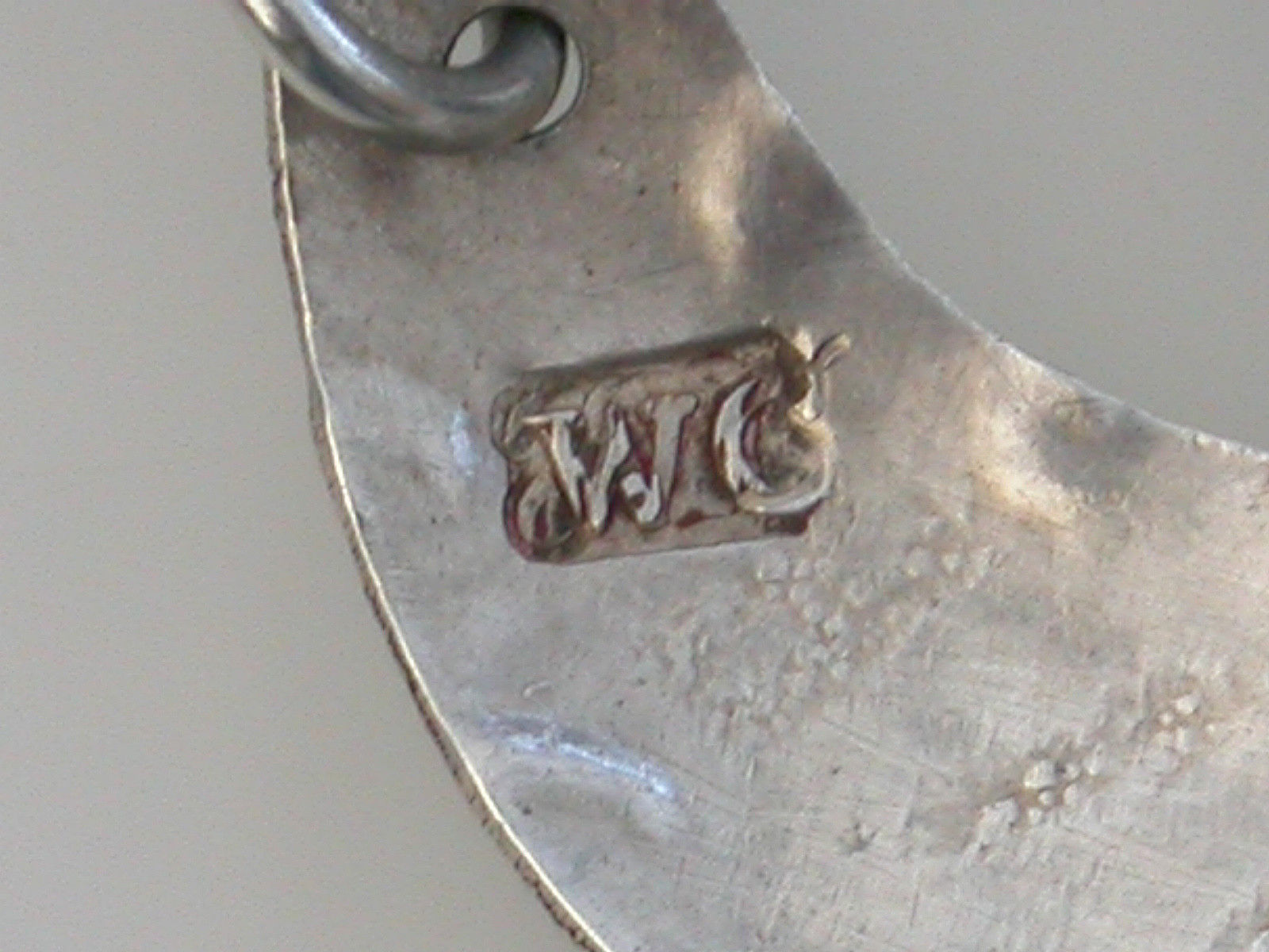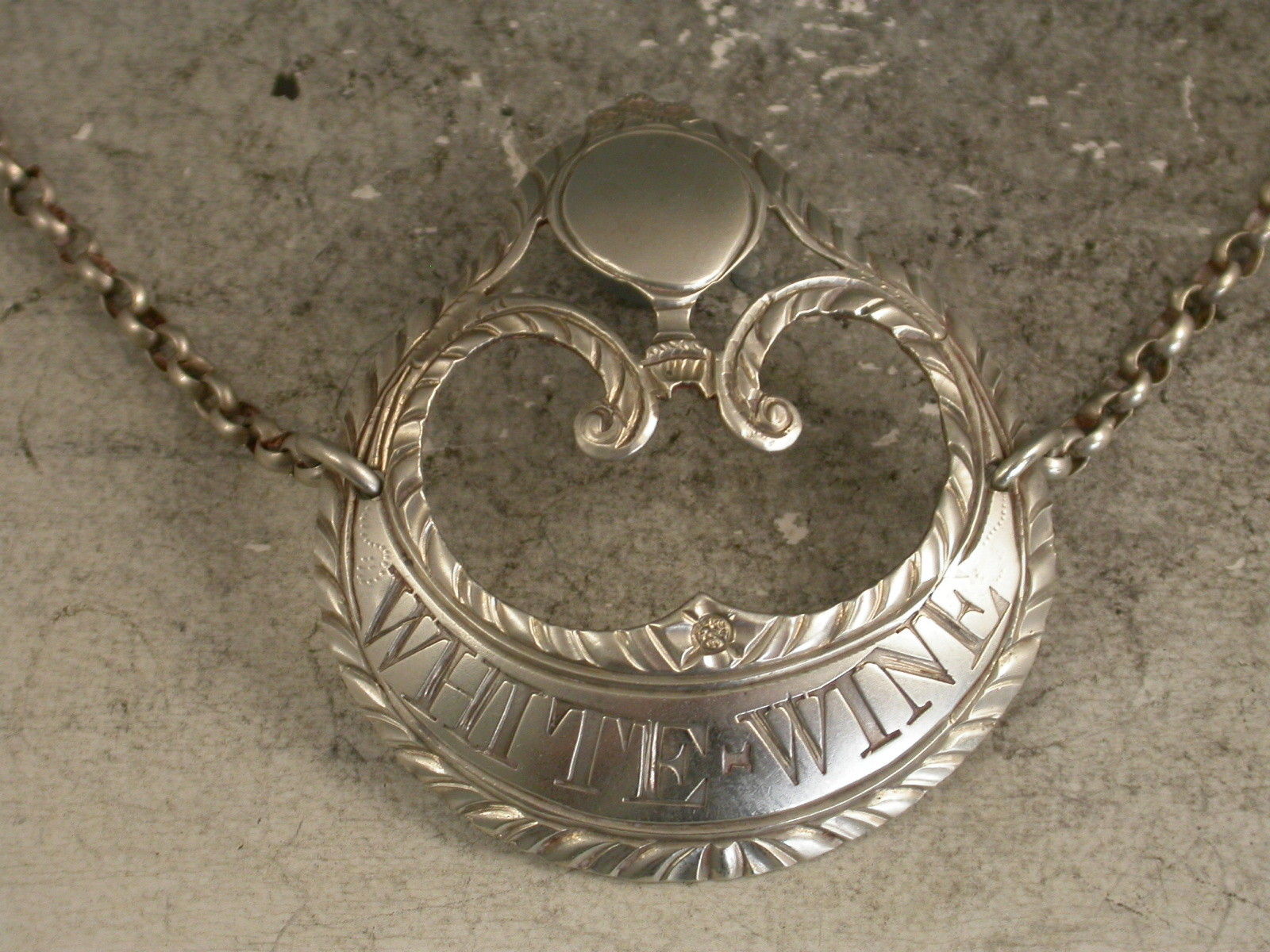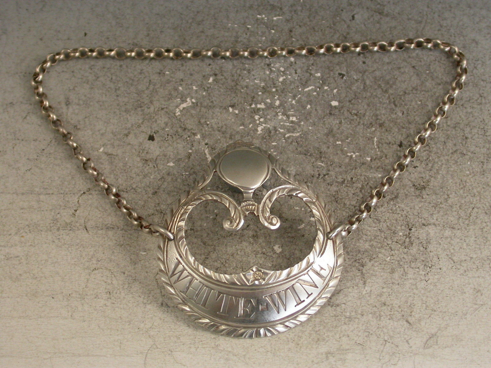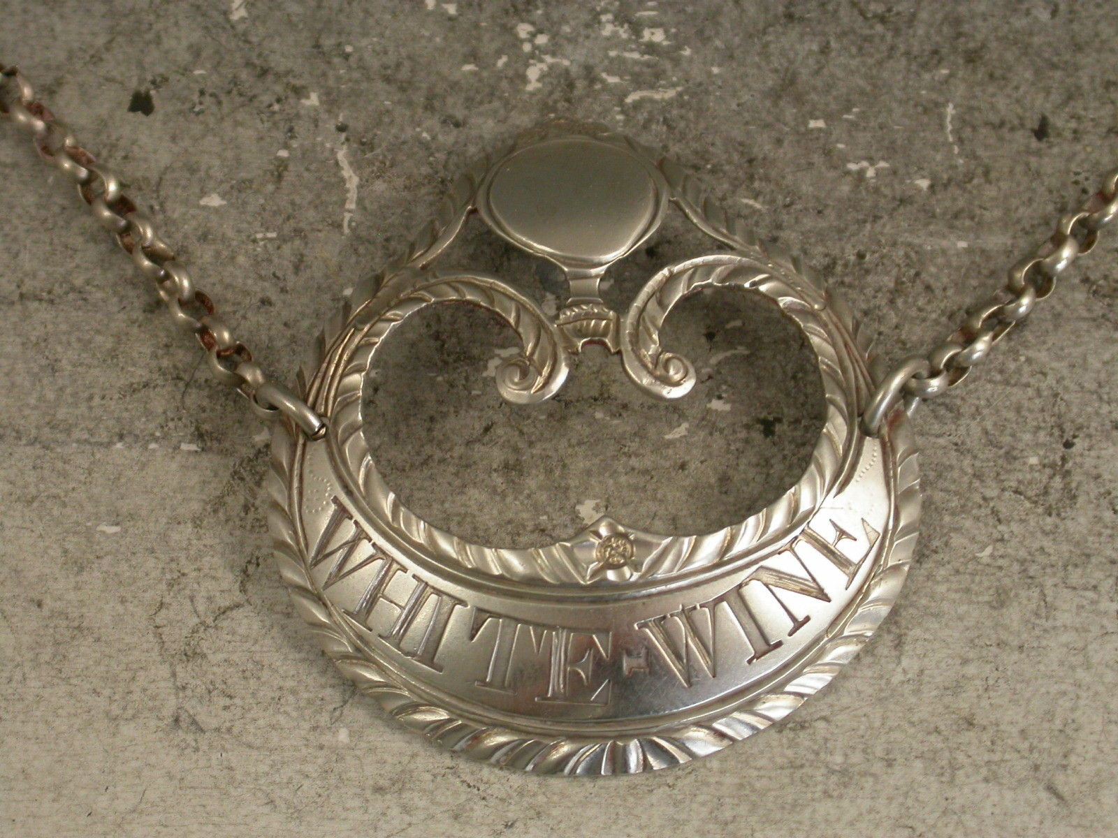 A fine George III 18th century silver wine Label of enclosed crescent form with oval cartouche above supported by tied ribbon swags, feather edge border, incised for White*Wine.