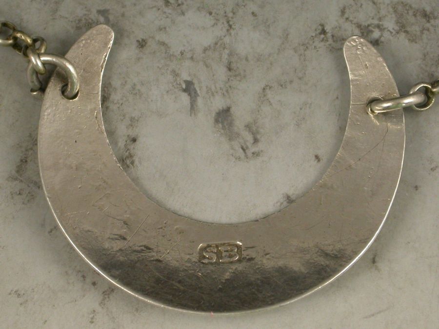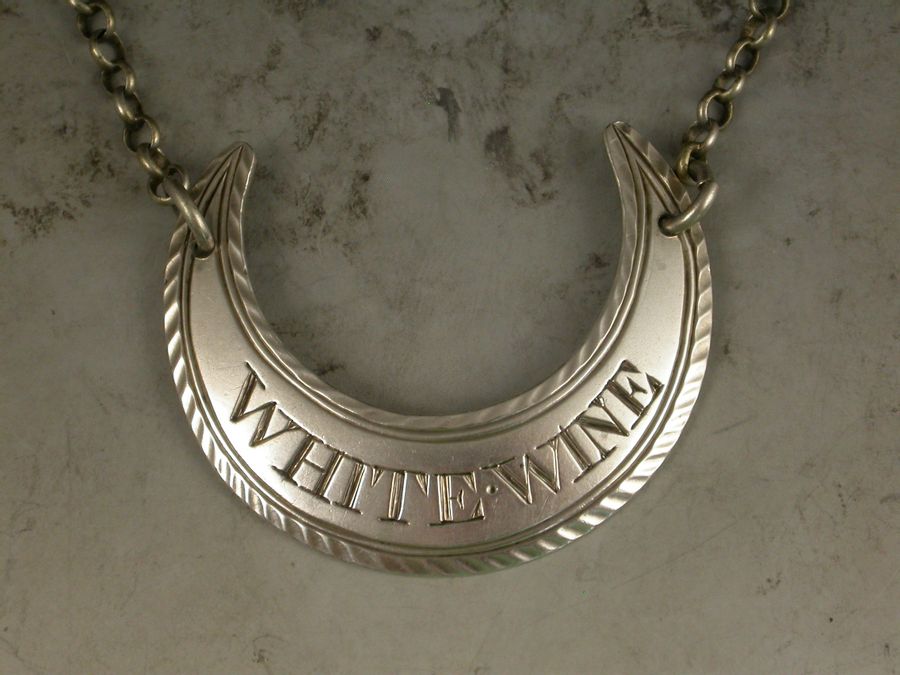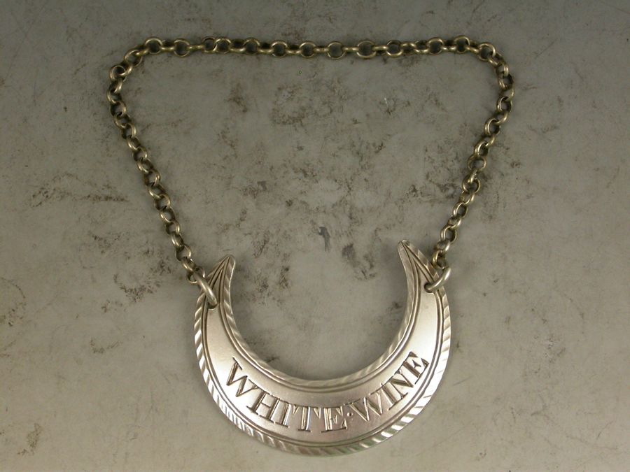 A rare George III silver Wine Label of crescent form with feather edge border, incised for White.Wine.