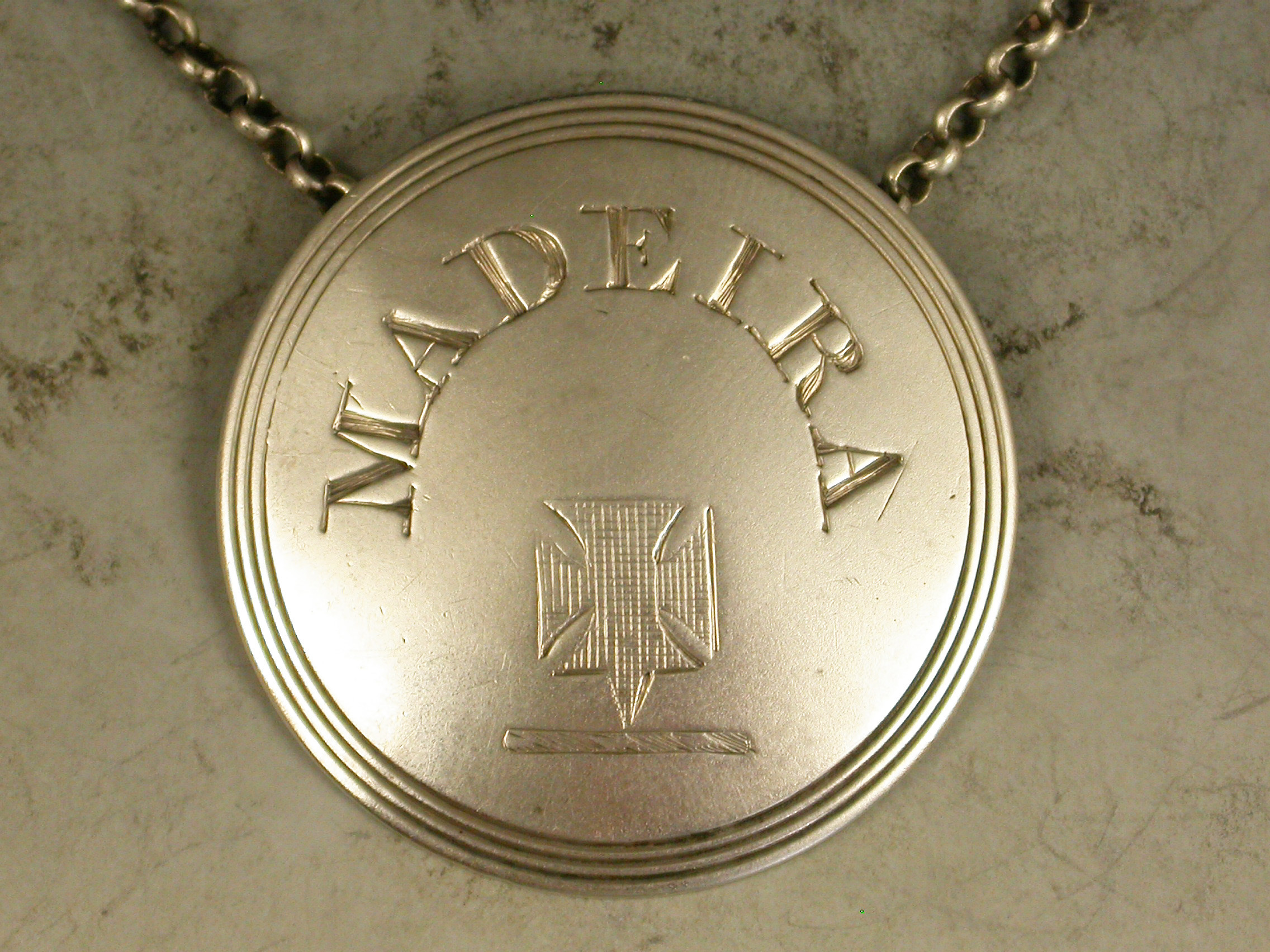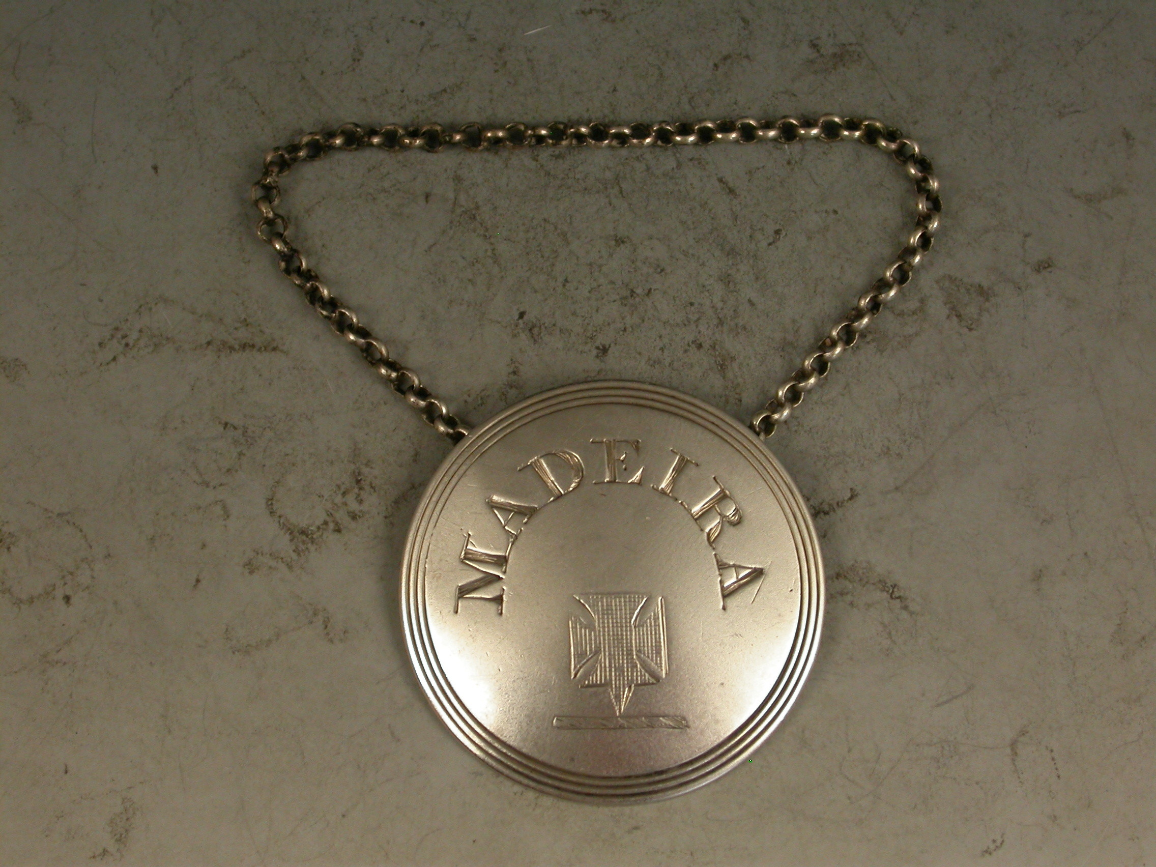 A rare George III silver Wine Label of ""button"" form, the circular label with a triple reeded border and engraved with a crest below the incised curved title for Madeira.