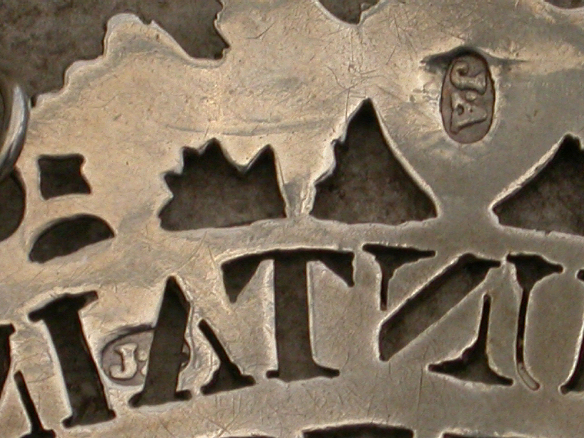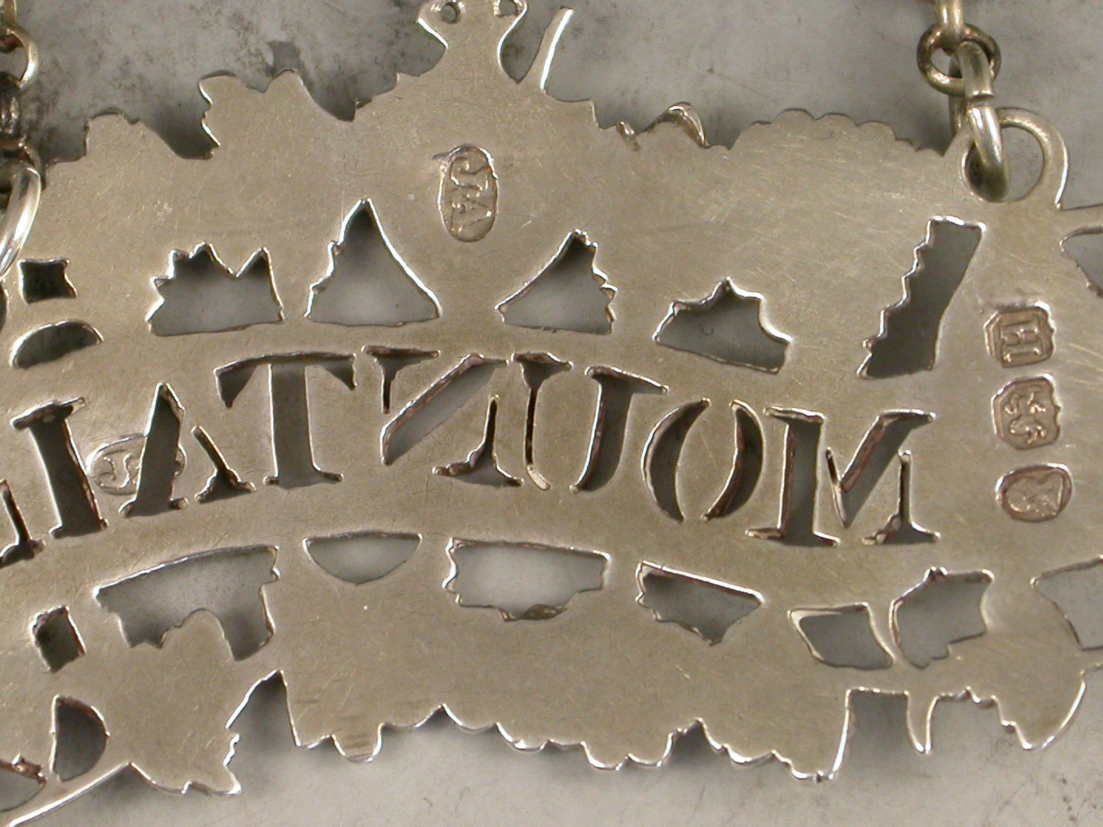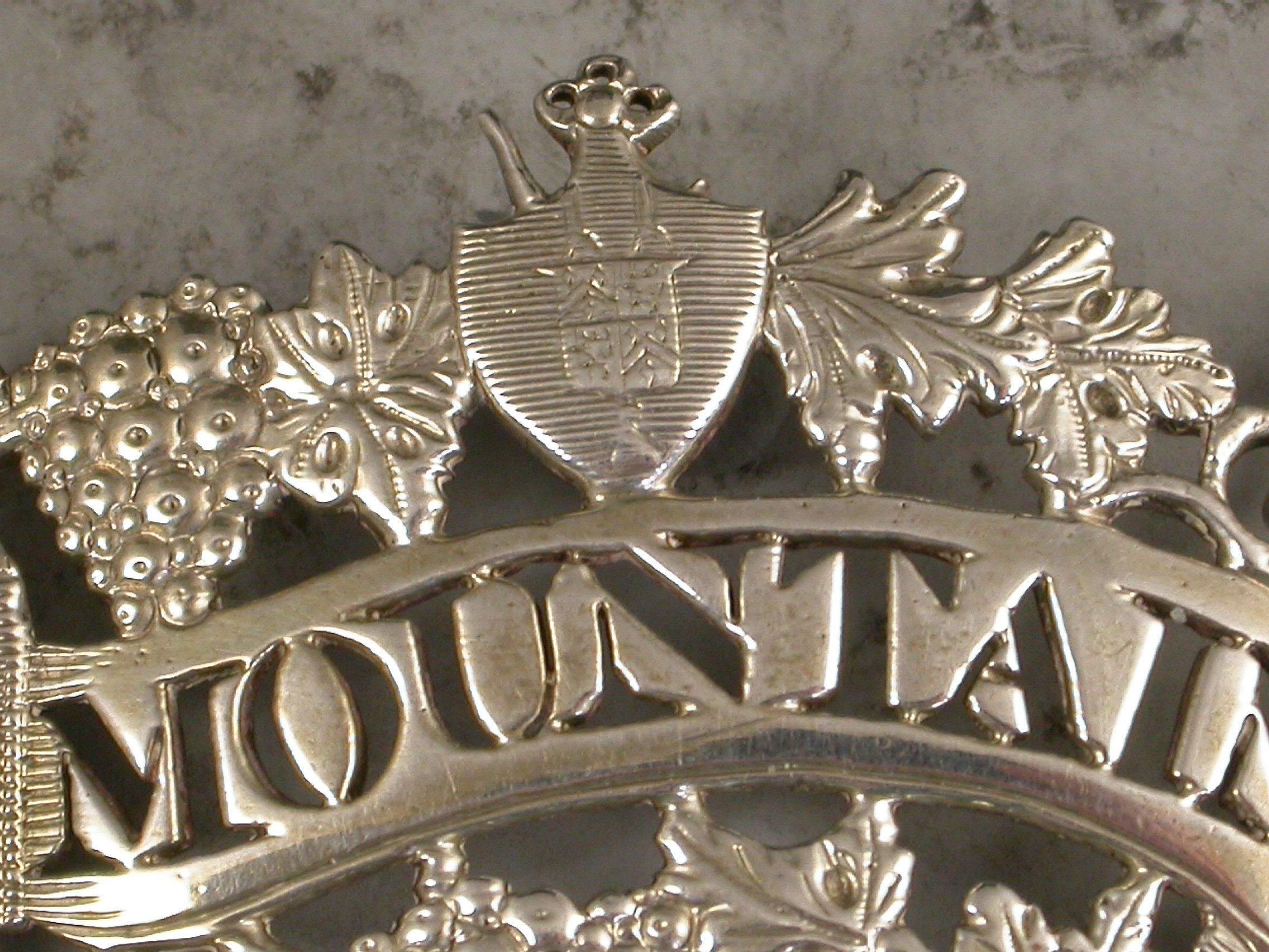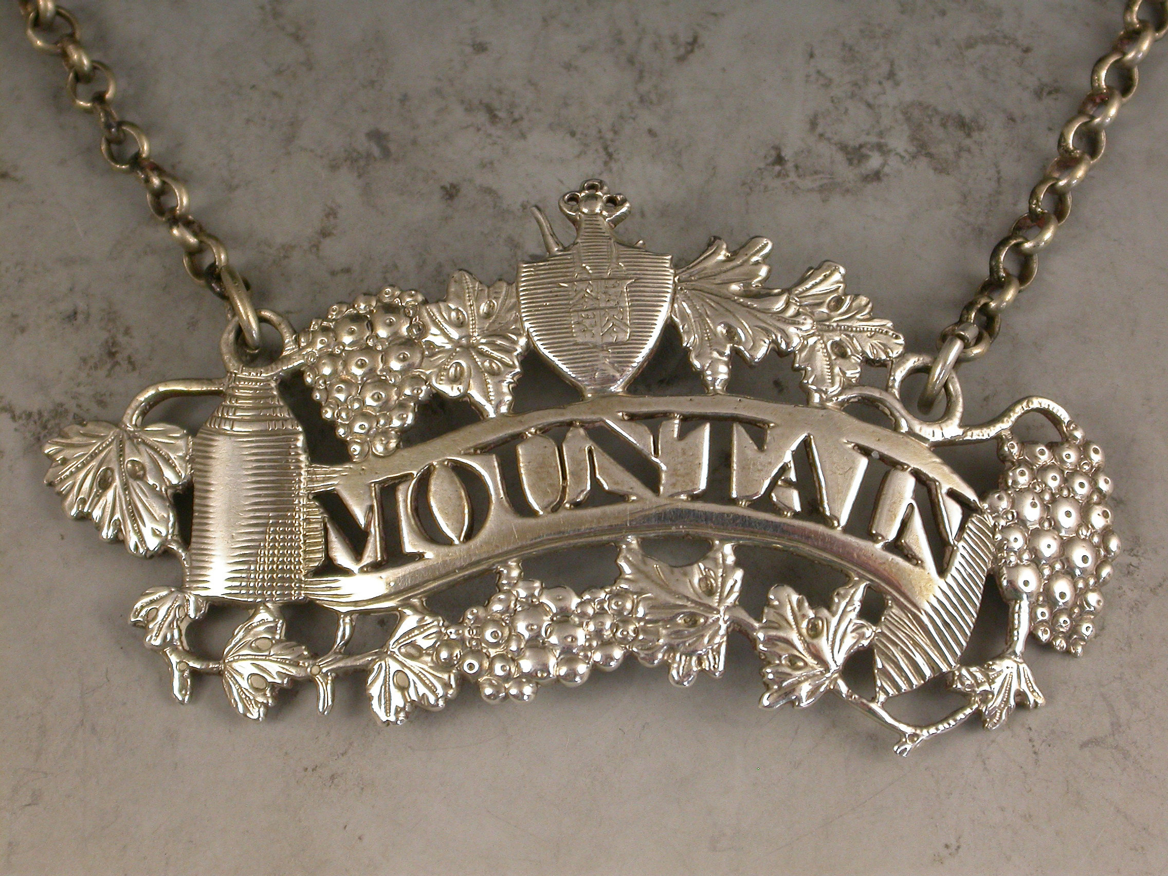 A fine and rare George III cast silver Wine Label of pierced scroll form with border of vine leaves and grapes surrounding the scrolled name plate pierced for Mountain.