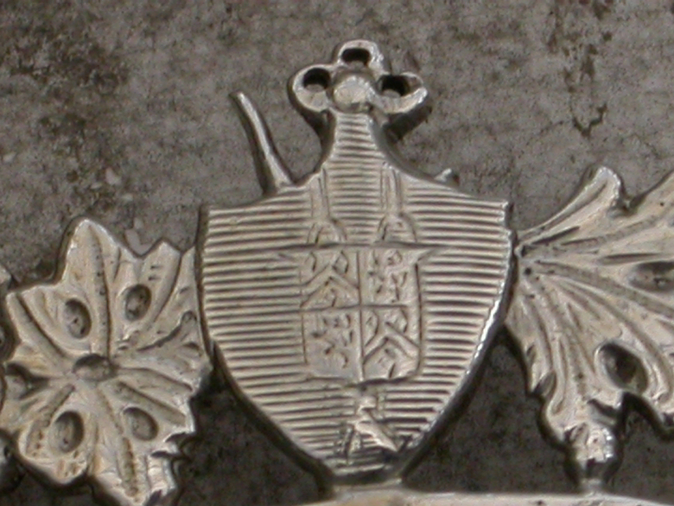The shield shaped cartouche above engraved with the complete coat of arms of Gifford, for Elizabeth Gifford, heiress.