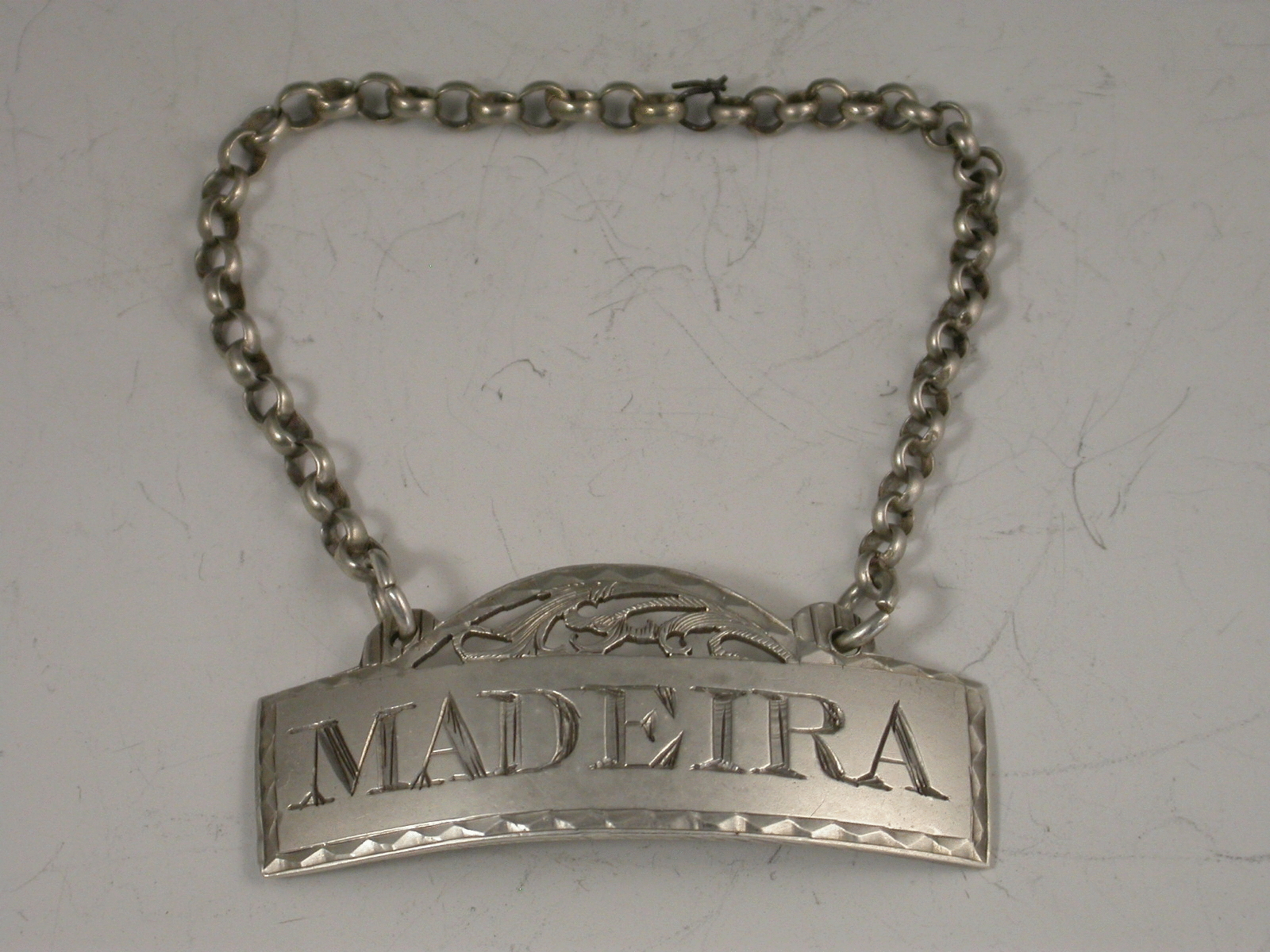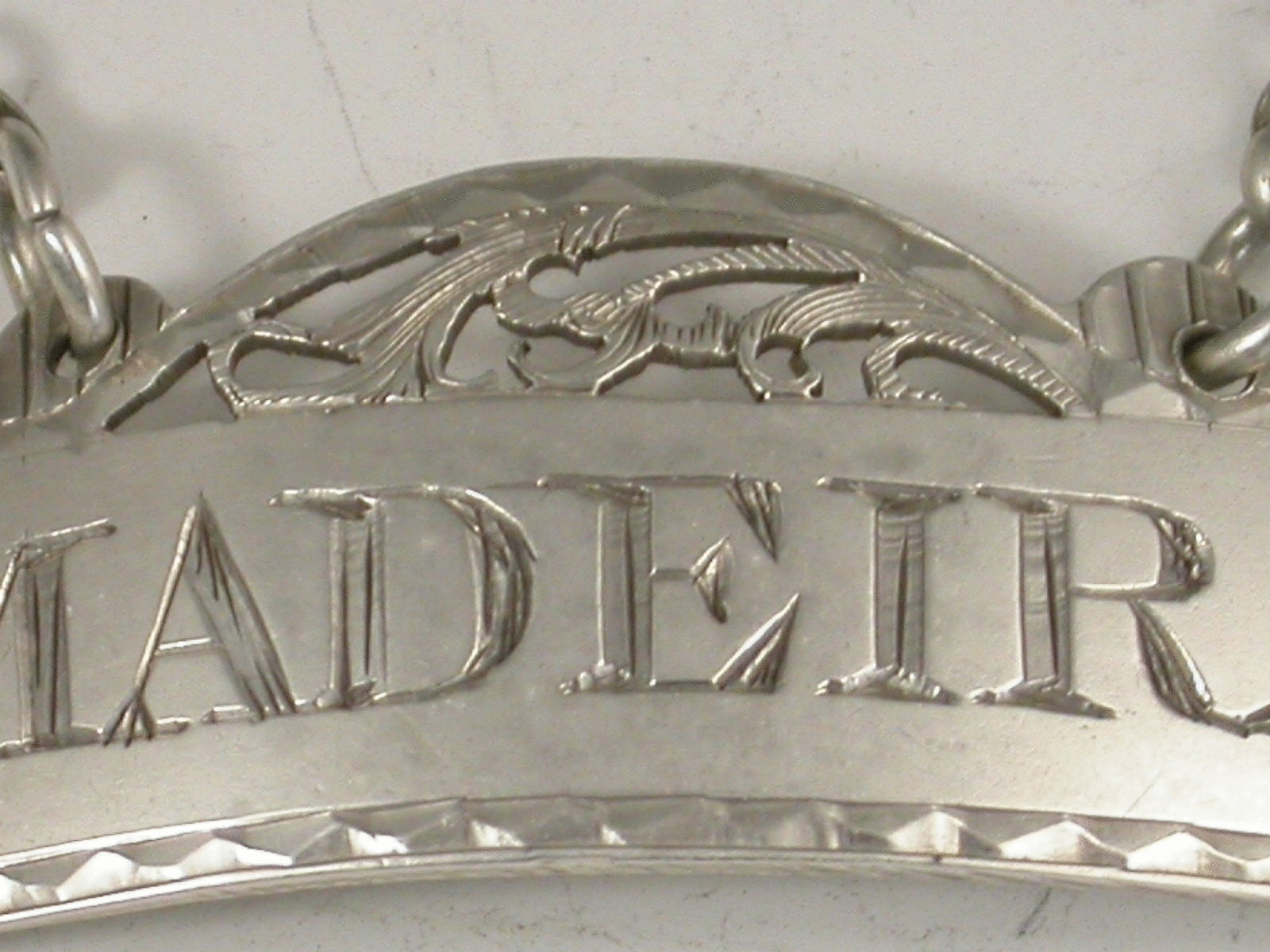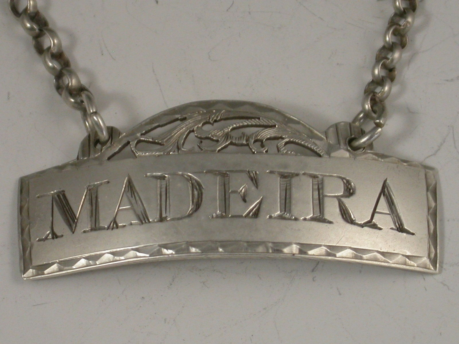 A rare George III silver Wine Label of fret - domed rectangular form with bright cut engraved border, incised for Madeira.