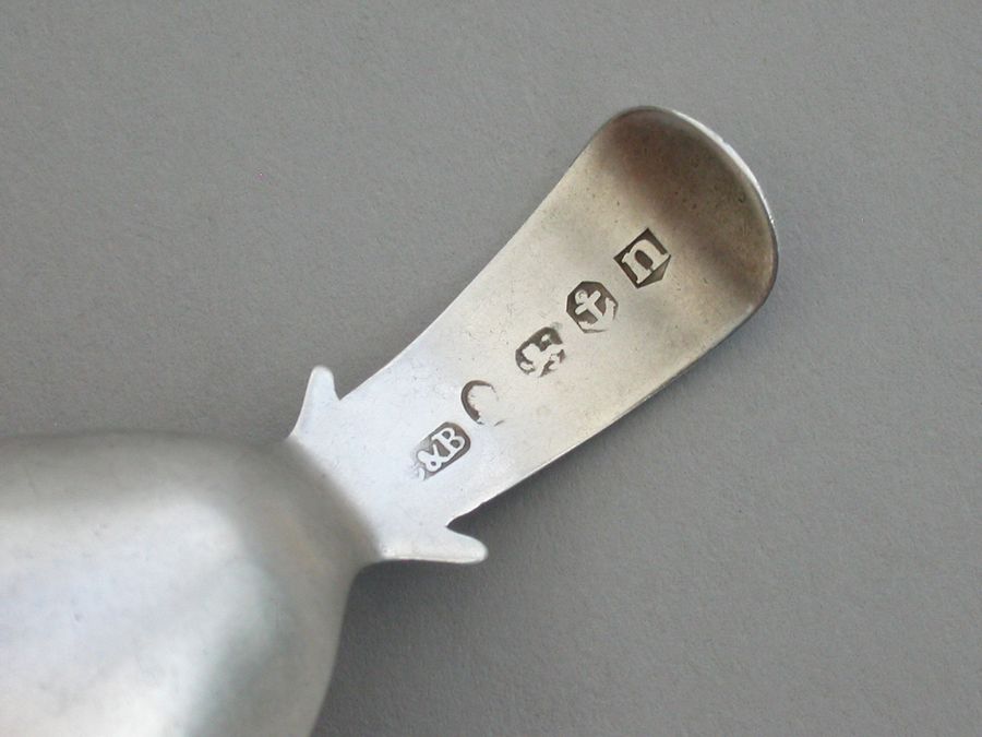 A fine George III silver Caddy Spoon with pear shaped bowl and curved Old English handle with shoulders, the bowl with bright-cut engraved basket-weave design, the handle also bright-cut engraved and with a cartouche engraved with contemporary initials.