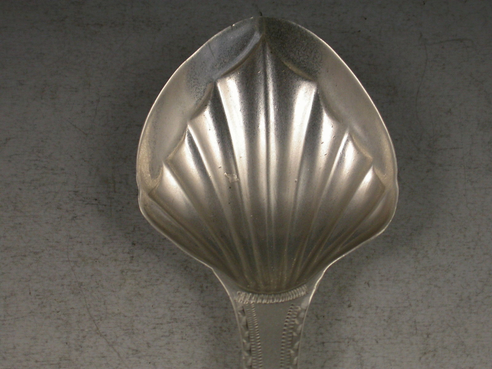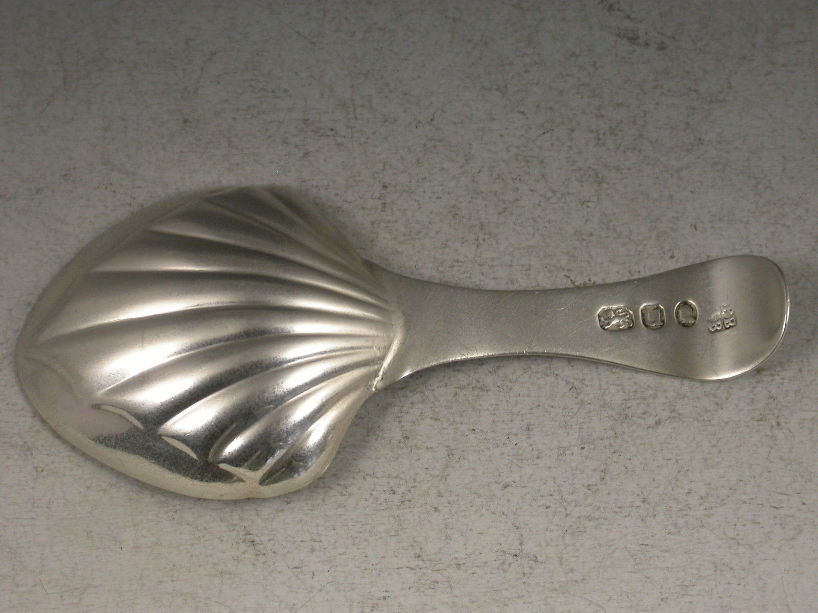 A good George III silver Caddy Spoon with bright cut engraved Old English handle and rare part fluted Anthemion shaped bowl.