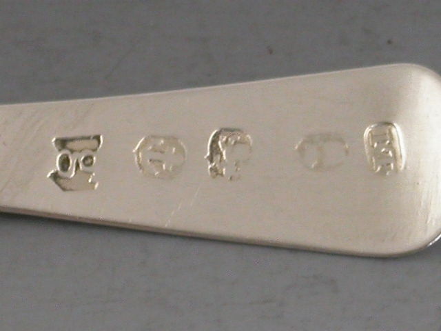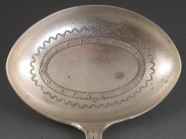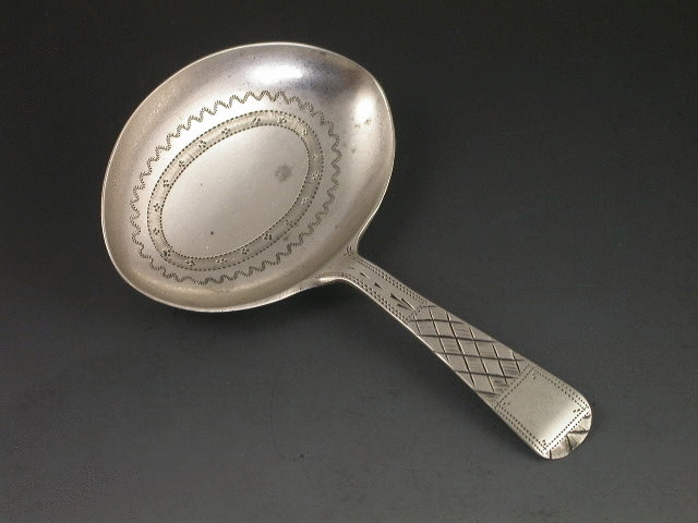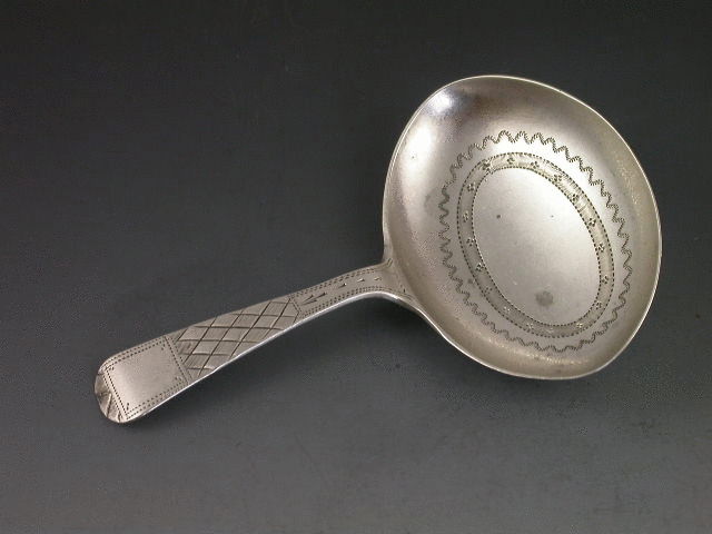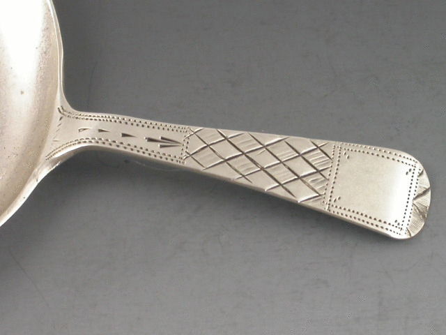 A good George III silver Caddy Spoon with sideways oval bowl and Old English type handle, bright cut and prick dot engraved decoration to bowl and handle.