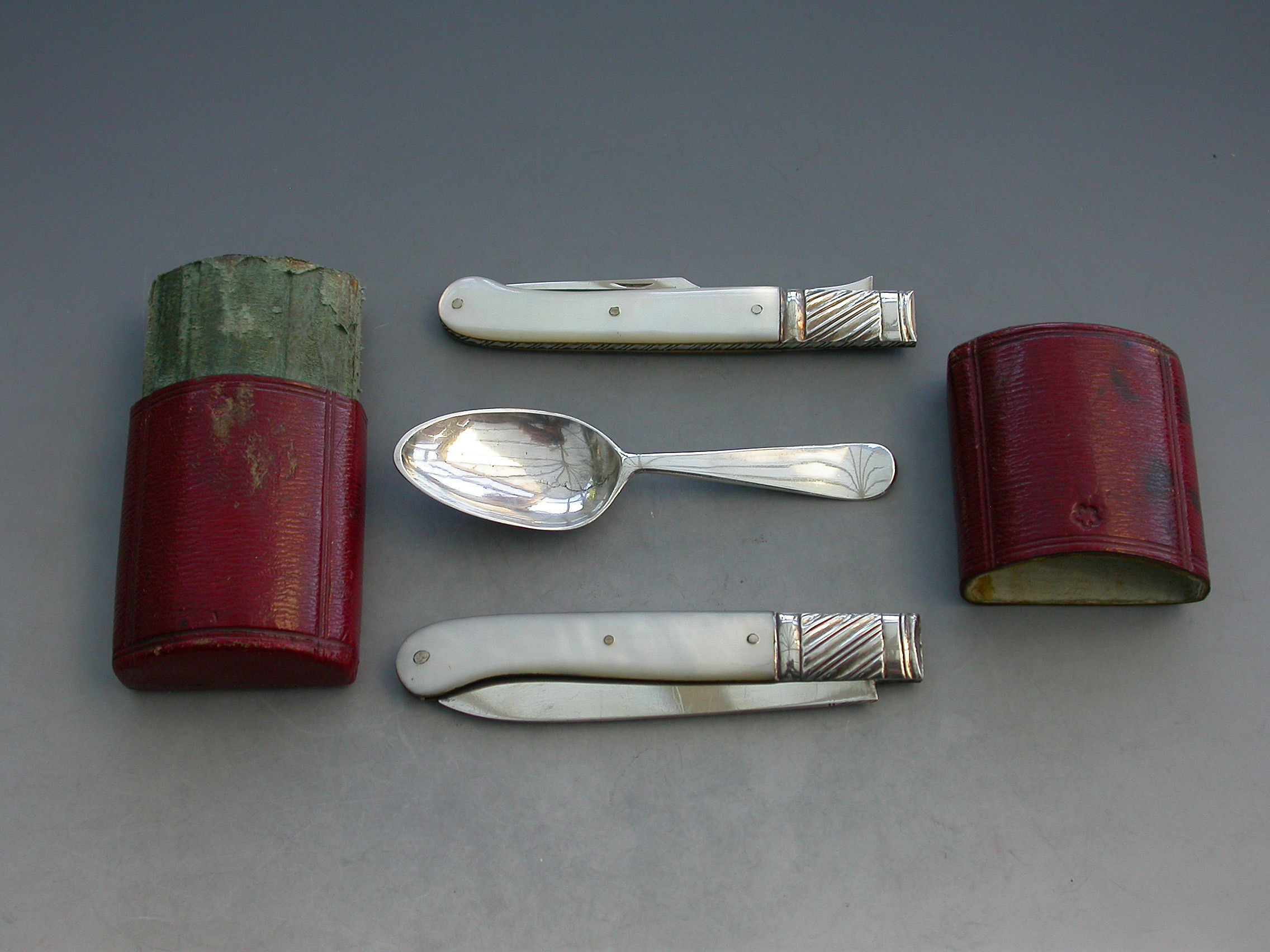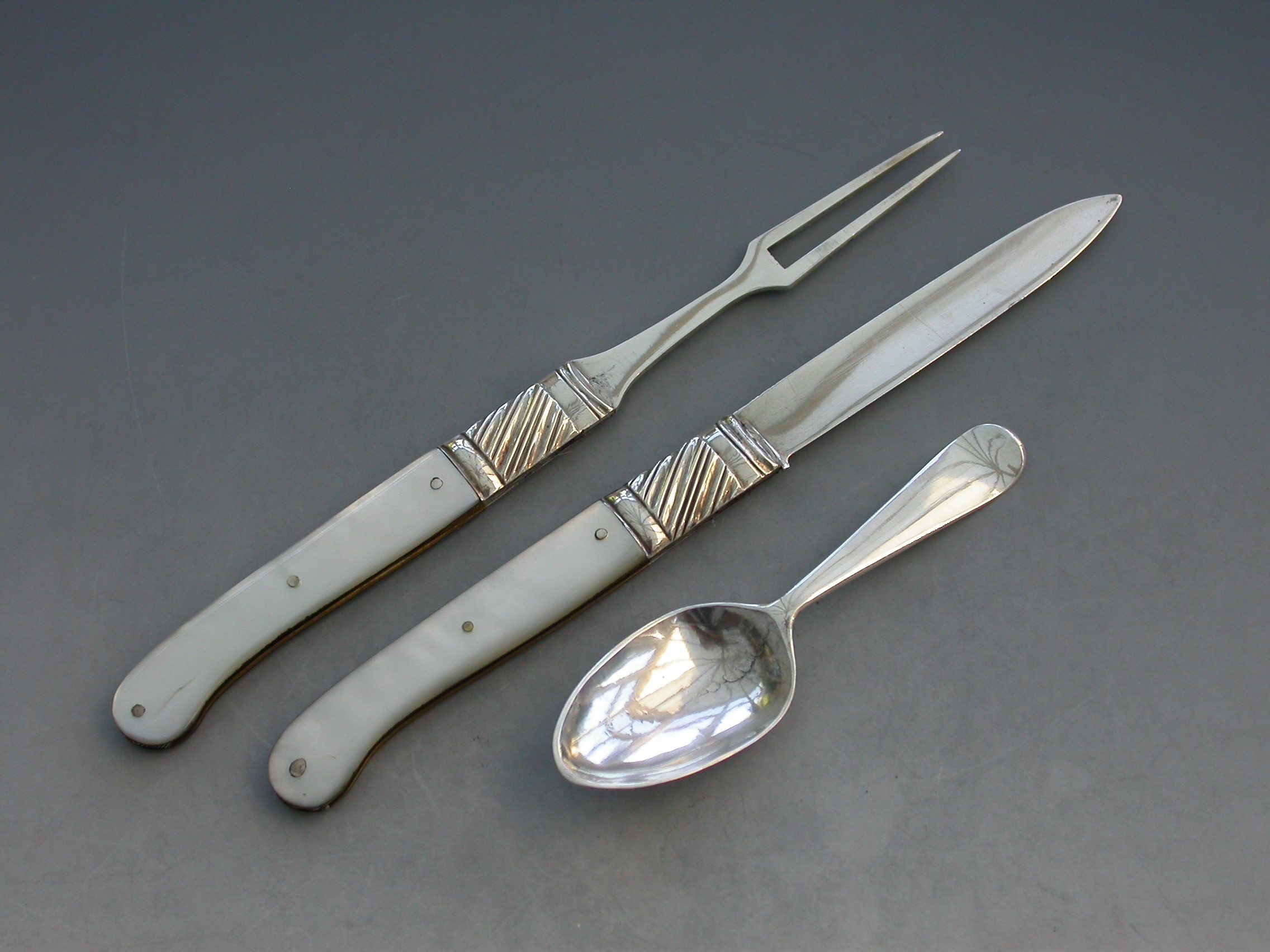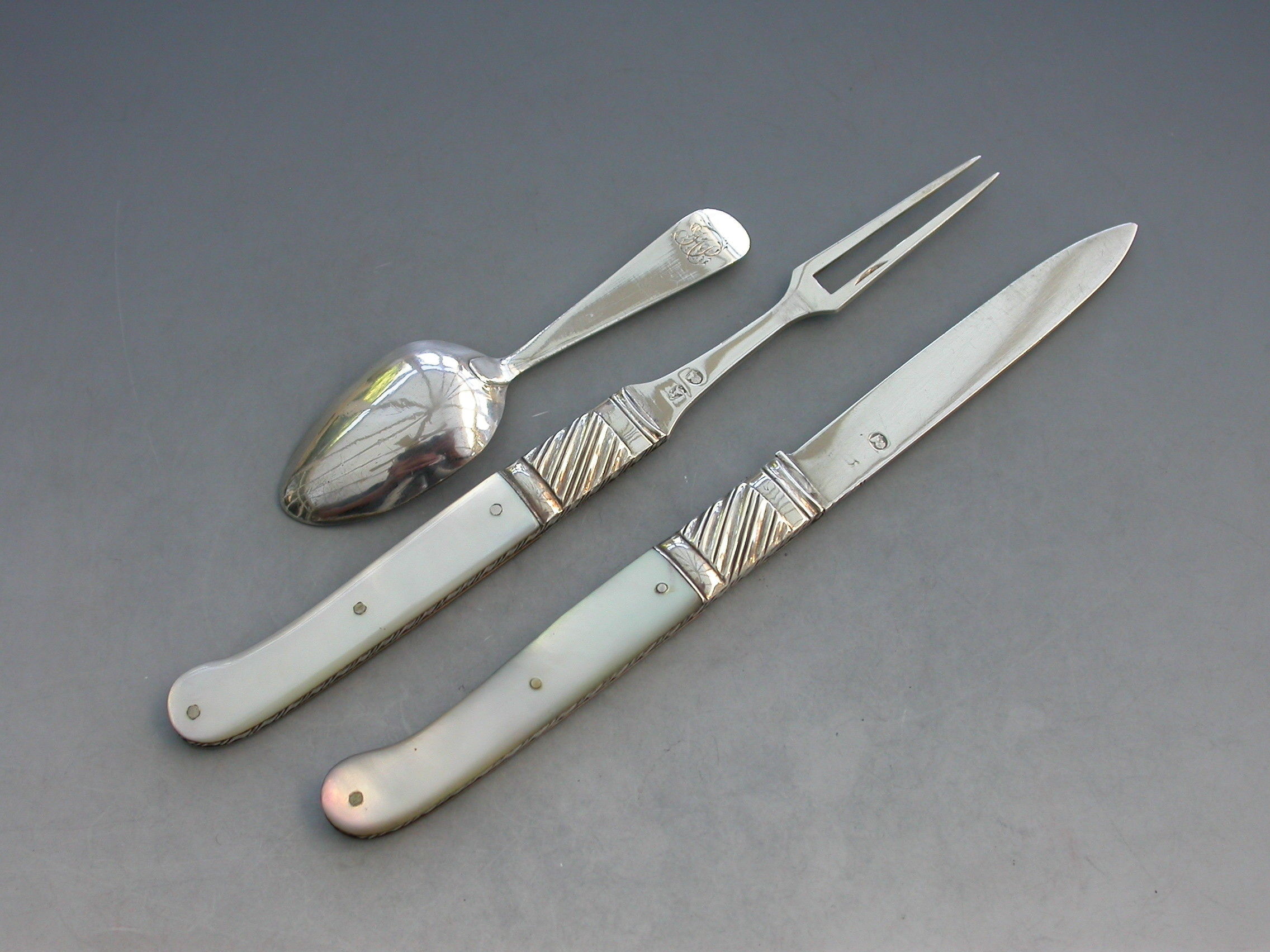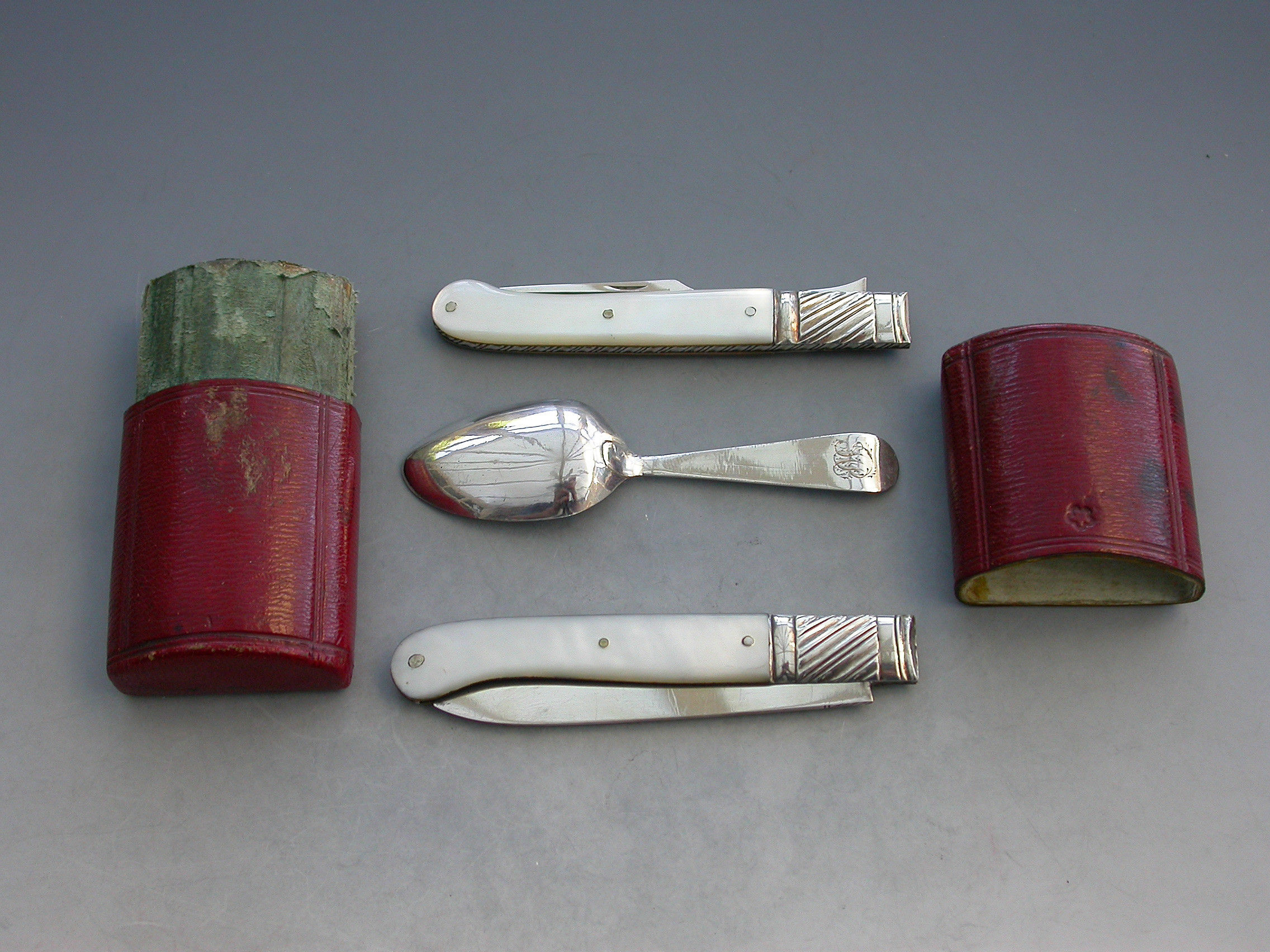 A rare George III cased silver and mother of pearl Folding Fruit Knife, Fork and Spoon. The knife and fork with shaped mother of pearl pistol grip handles and large gadrooned bolsters. The blades struck with duty marks and lion passants only. The integral small spoon with Hanoverian type handle and engraved initials.