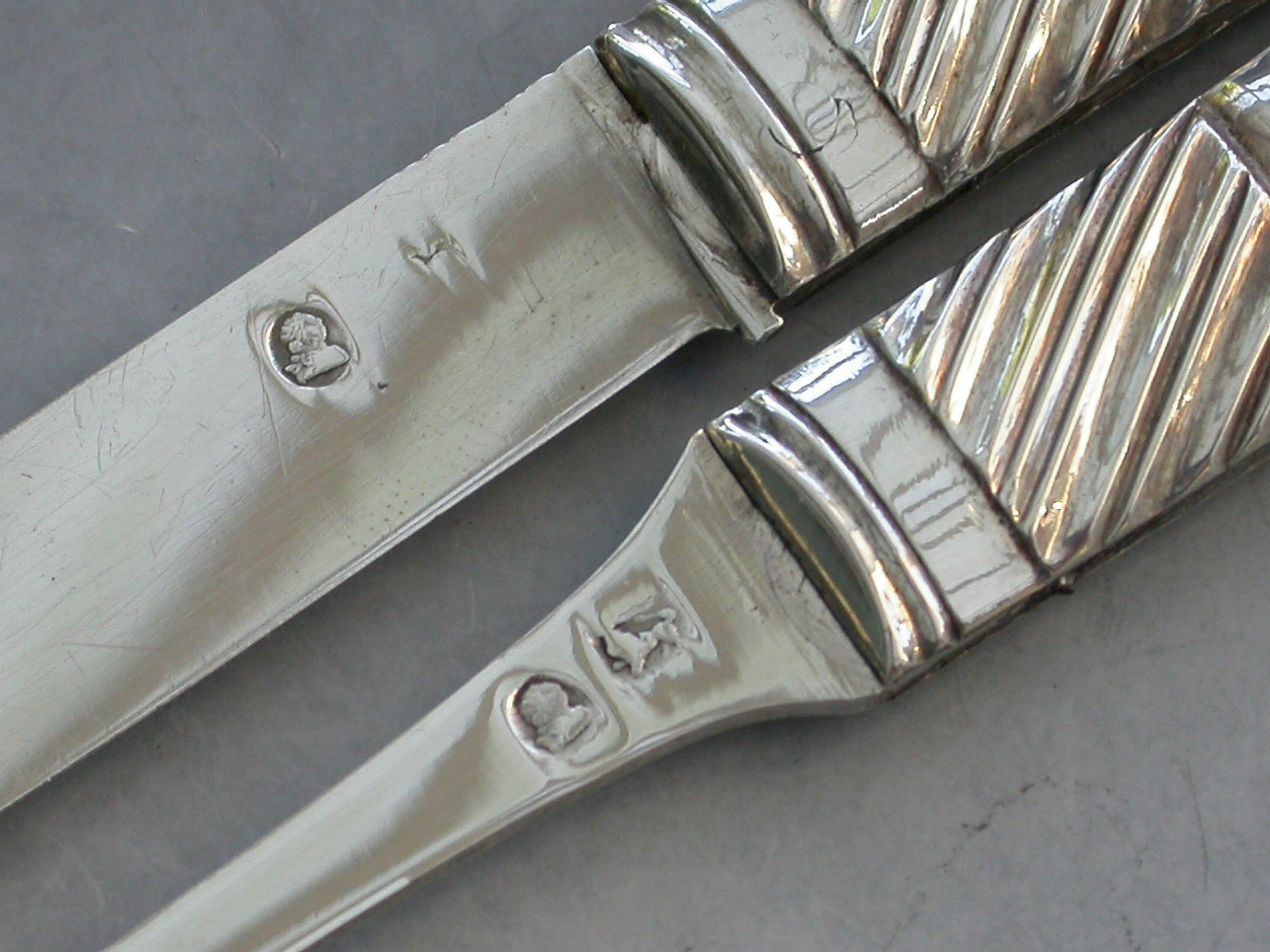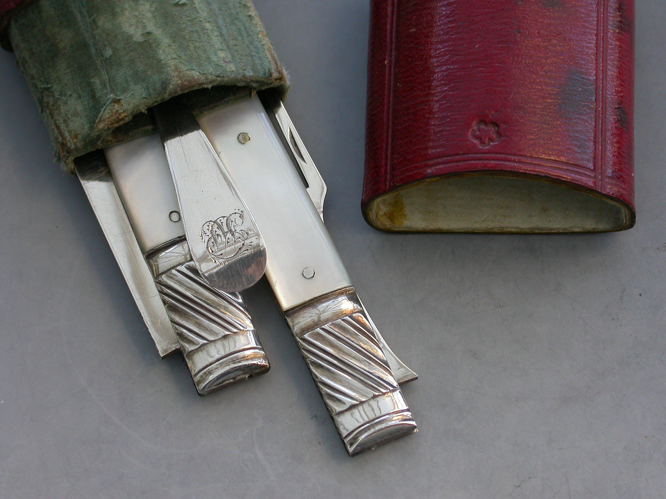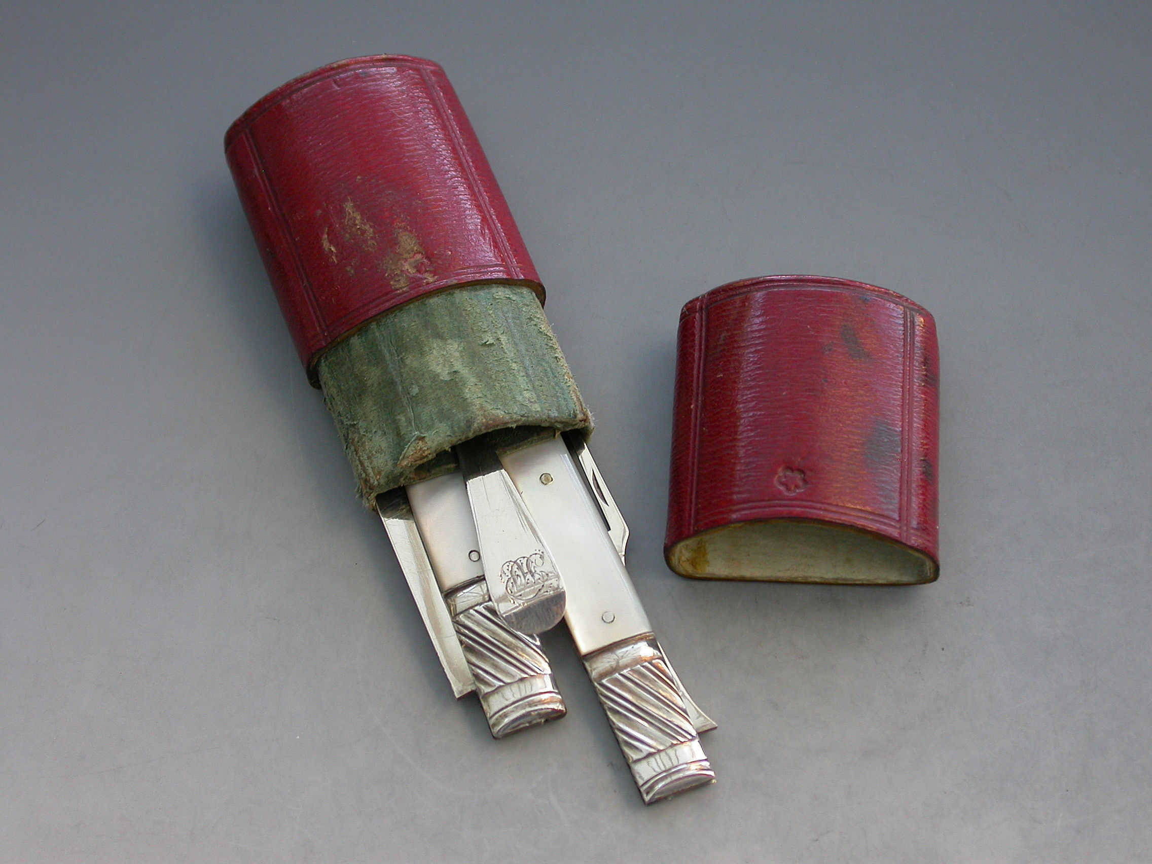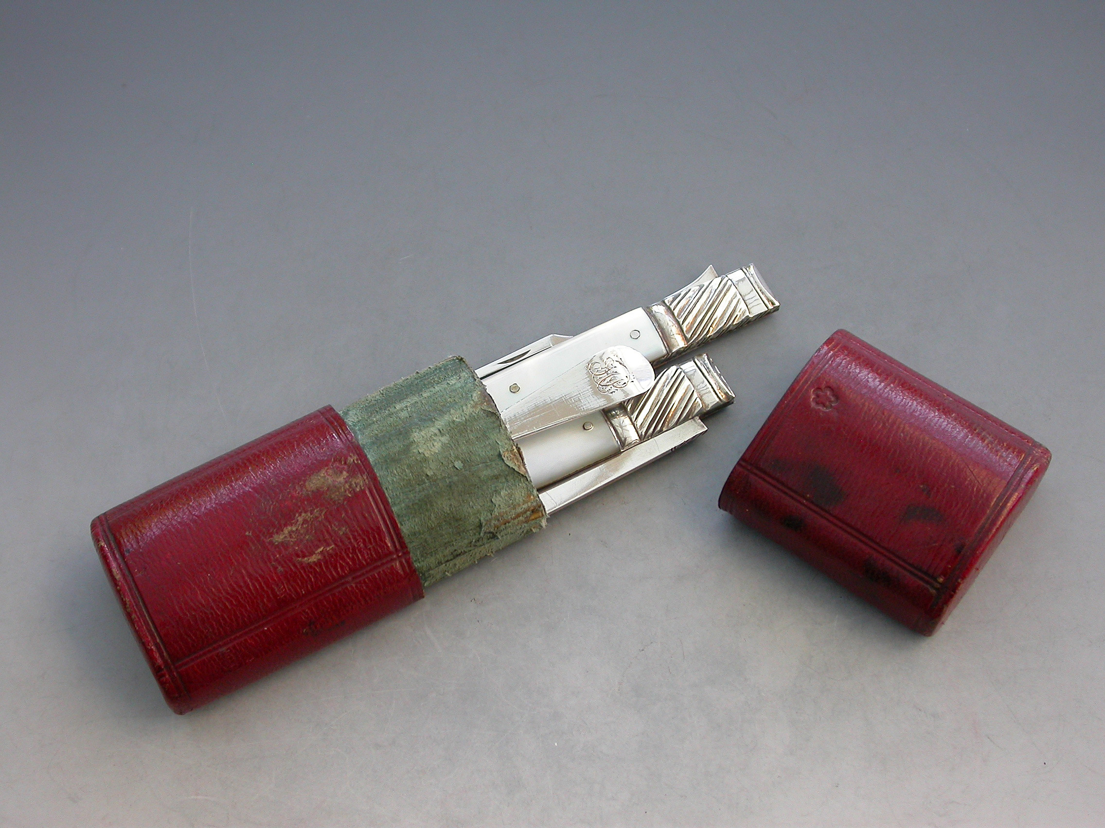 A rare George III cased silver and mother of pearl Folding Fruit Knife, Fork and Spoon. The knife and fork with shaped mother of pearl pistol grip handles and large gadrooned bolsters. The blades struck with duty marks and lion passants only. The integral small spoon with Hanoverian type handle and engraved initials.