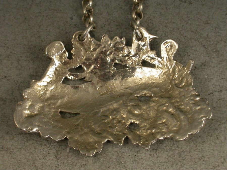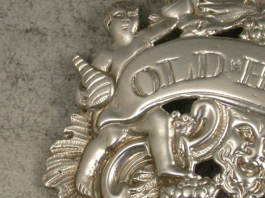 A rare early George III heavy cast Silver Wine Label of two Putti, Bacchanalian mask and fruiting vine form, one putto holding a jug and bottle, the other squeezing grapes into a goblet, incised for Old Hock.