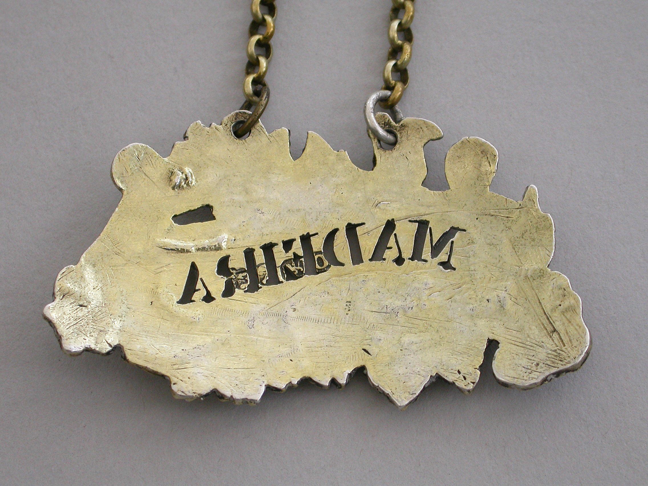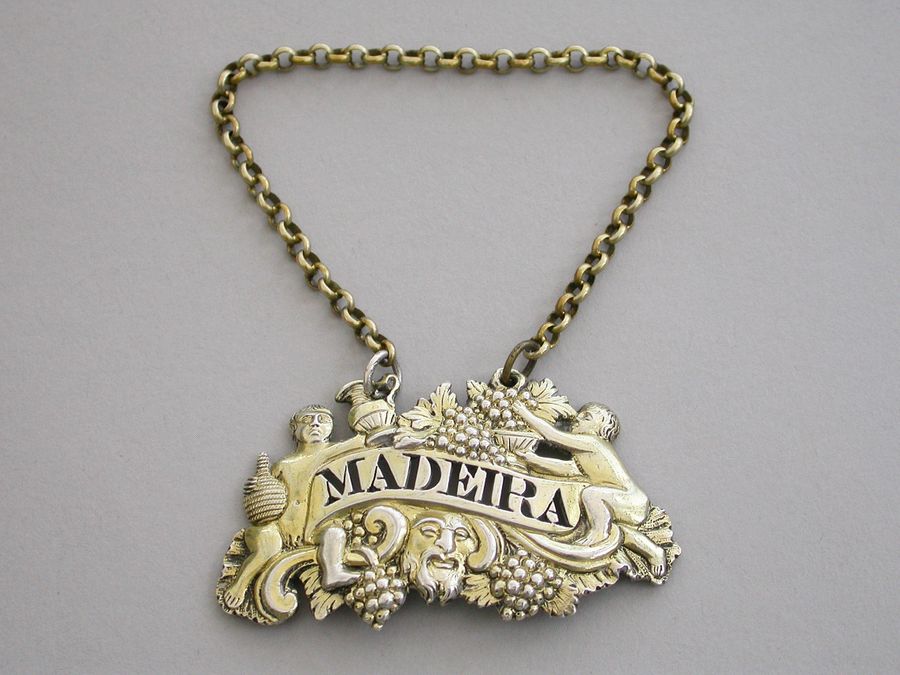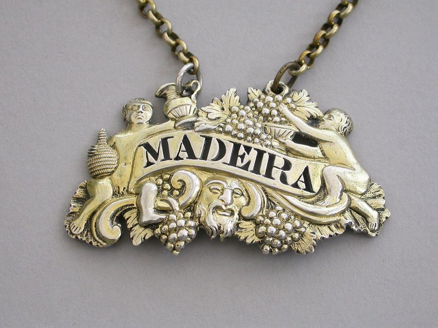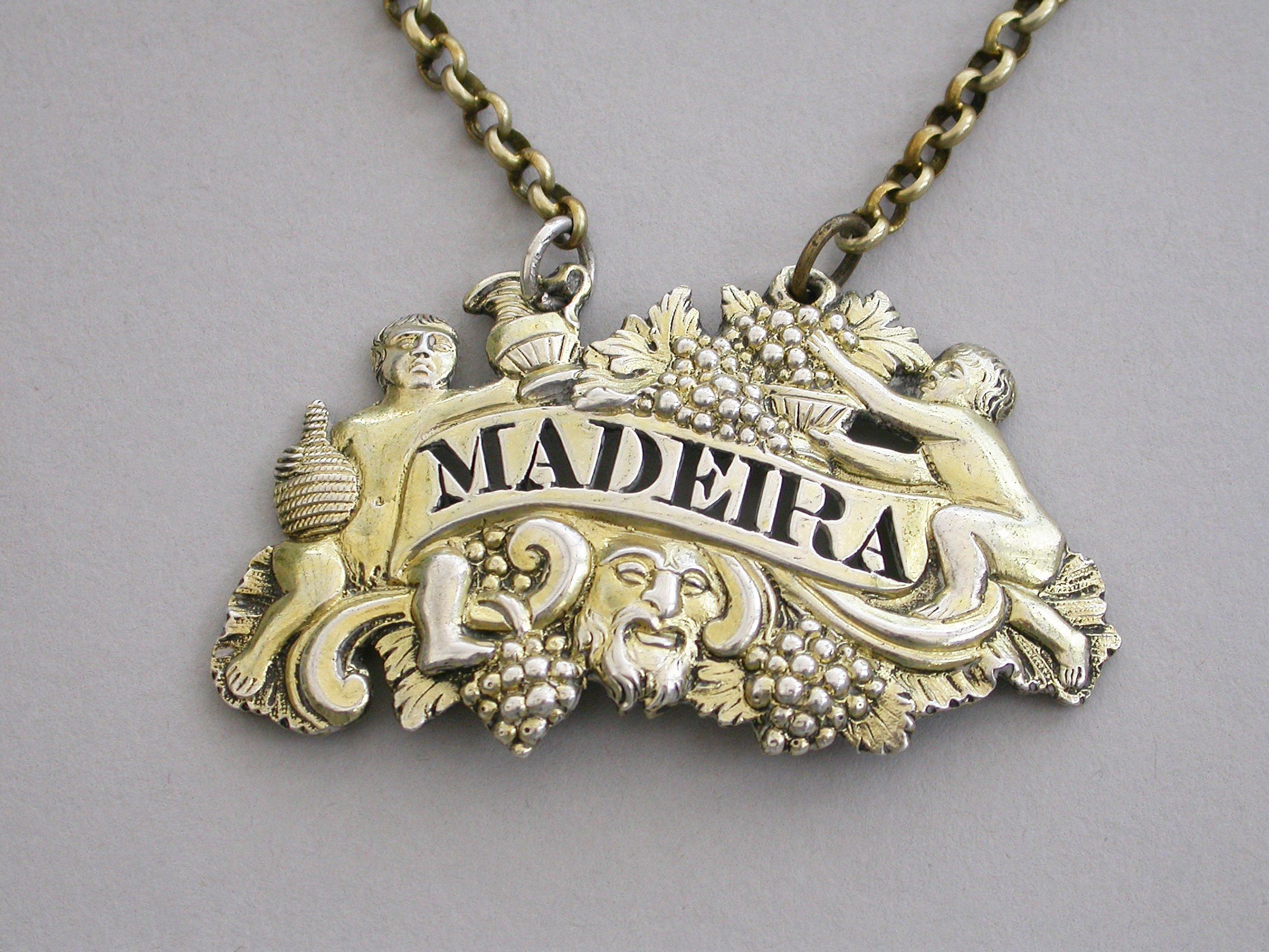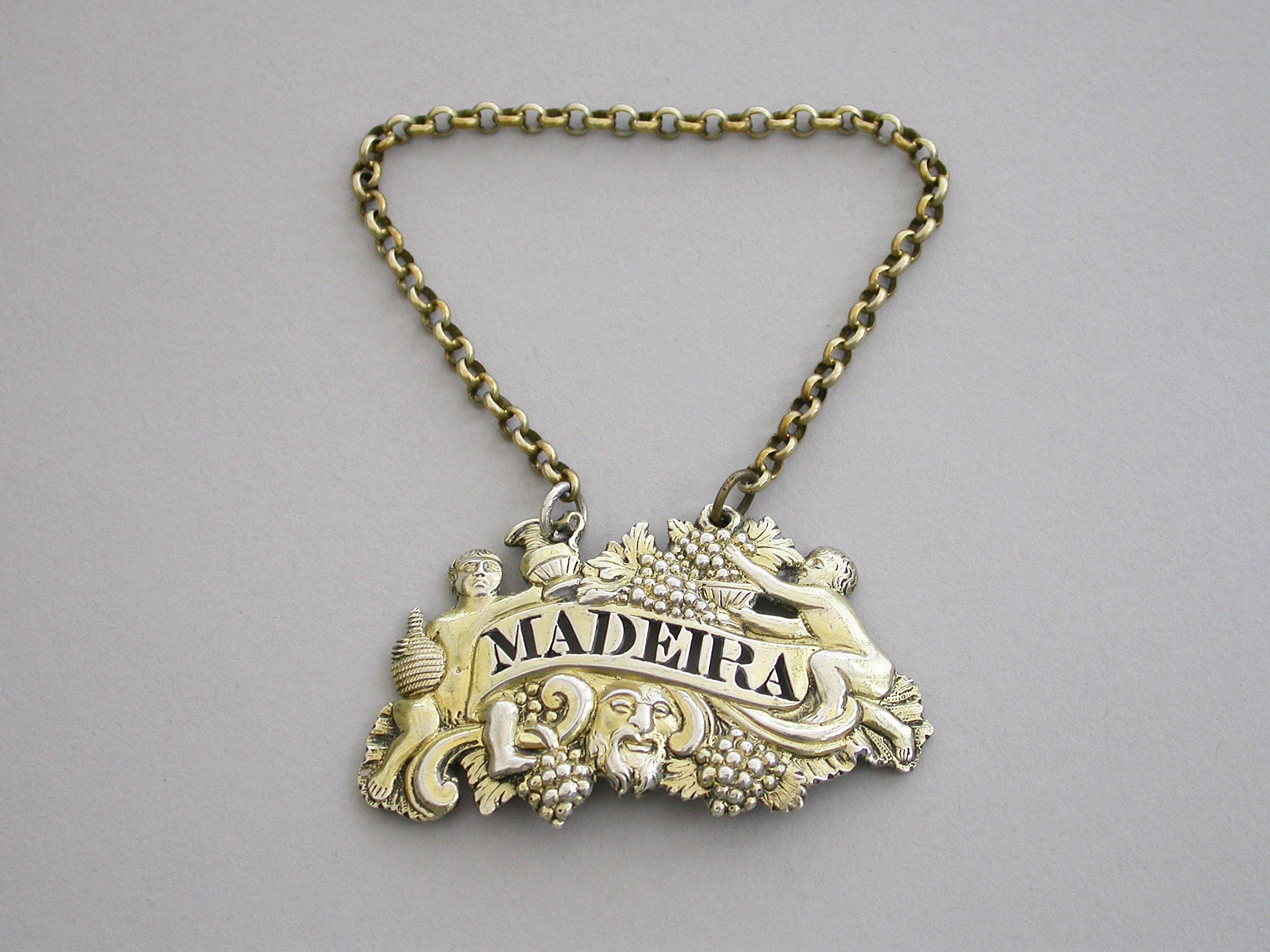 A good quality George III cast silver gilt Wine Label of "two putti with jug and bottle" form, depicting two naked boys, one holding a jug and bottle the other squeezing grapes into a goblet, both supporting a scroll shaped name plate pierced for Madeira. A bearded bacchus mask below.