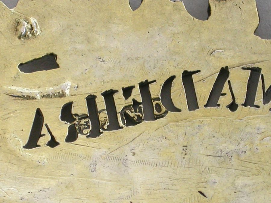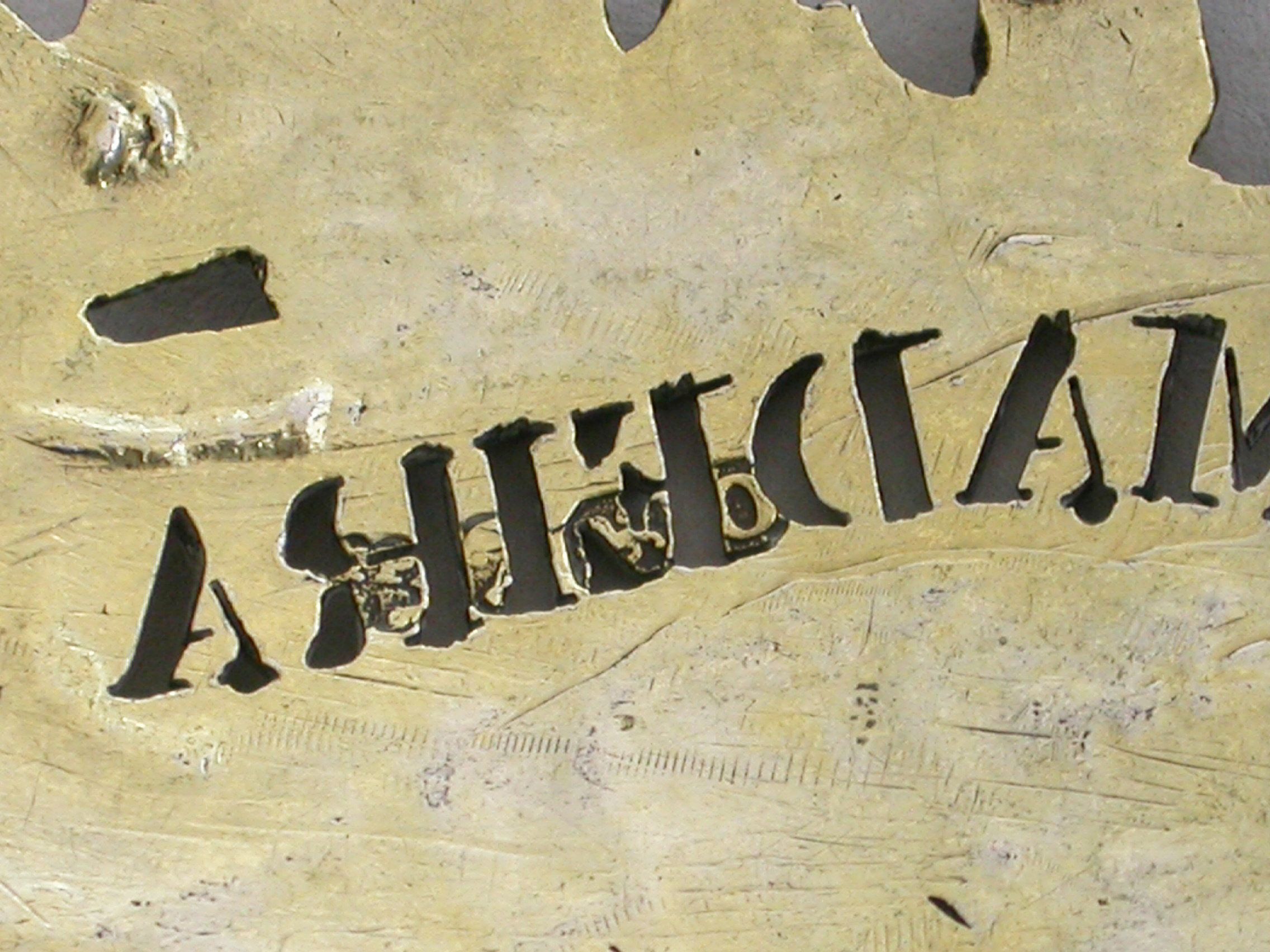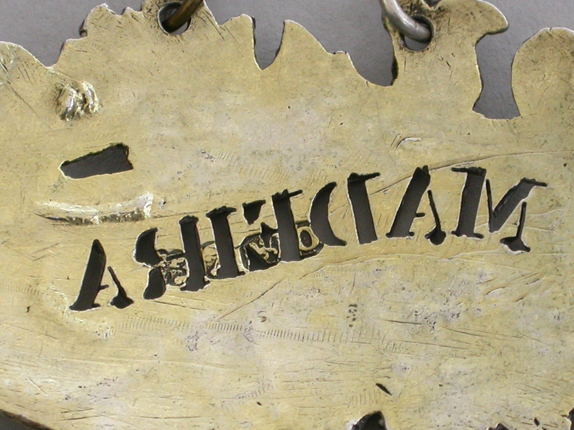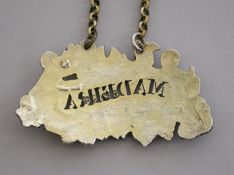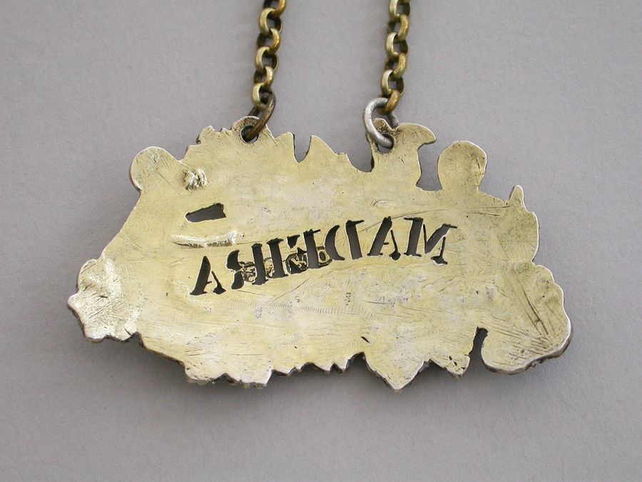 A good quality George III cast silver gilt Wine Label of "two putti with jug and bottle" form, depicting two naked boys, one holding a jug and bottle the other squeezing grapes into a goblet, both supporting a scroll shaped name plate pierced for Madeira. A bearded bacchus mask below.