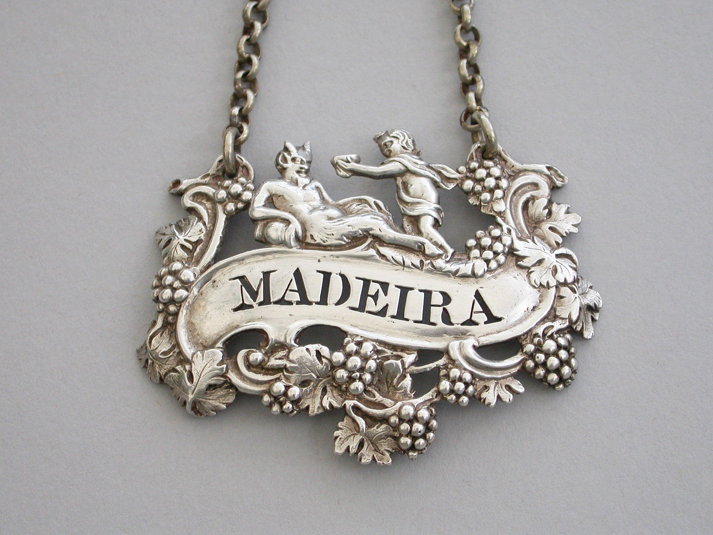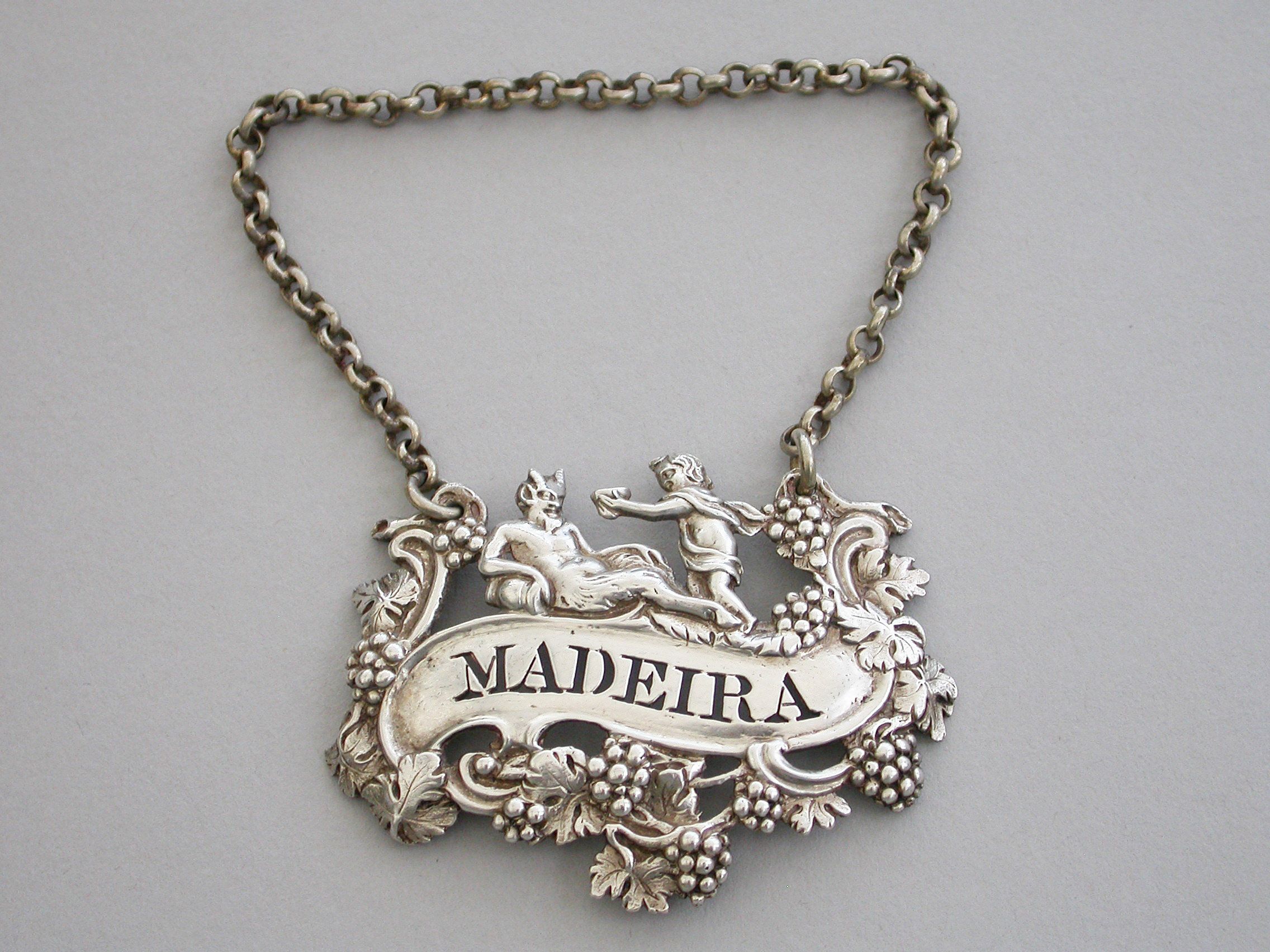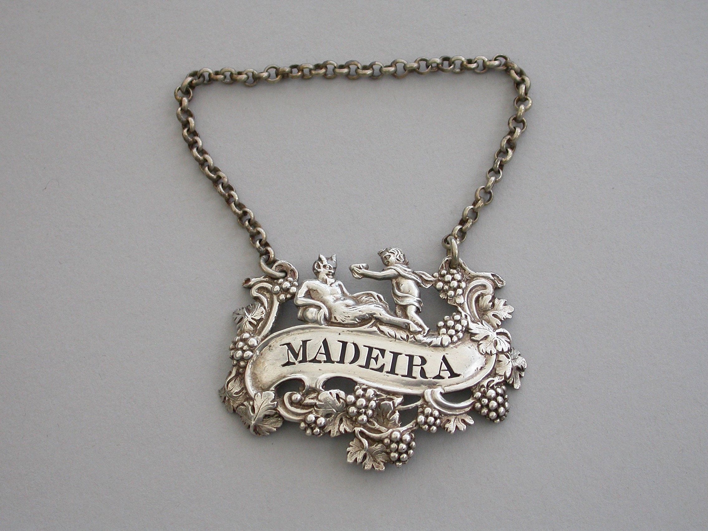 A fine George III heavy cast and pierced silver Wine Label depicting a reclining Dionysus being offered a cup of wine by a cloaked putto, a fruiting vine border surrounding the scrolled name plate incised for Madeira.