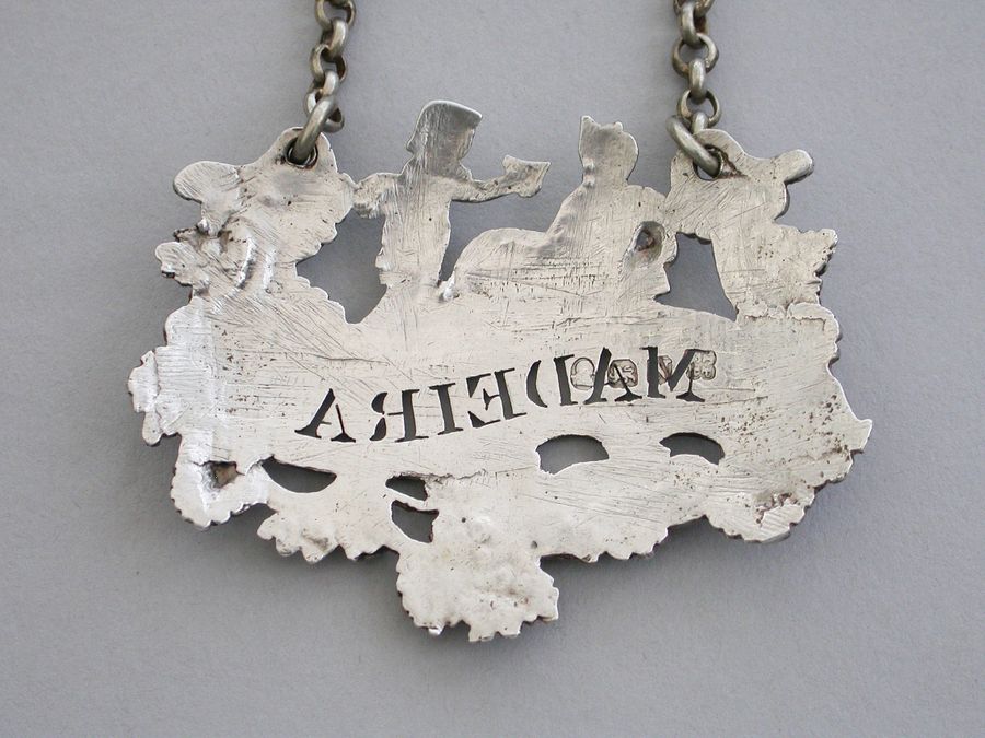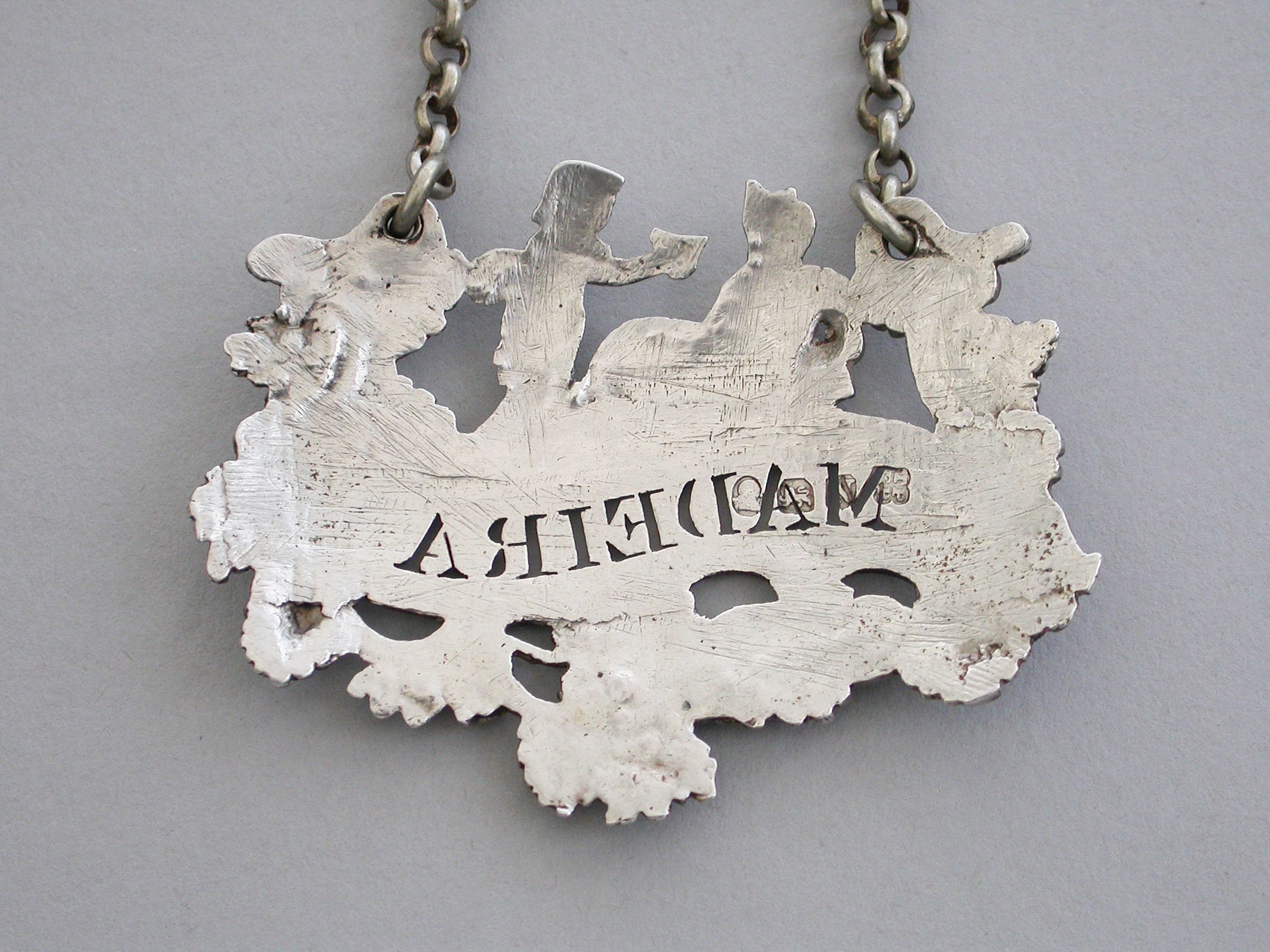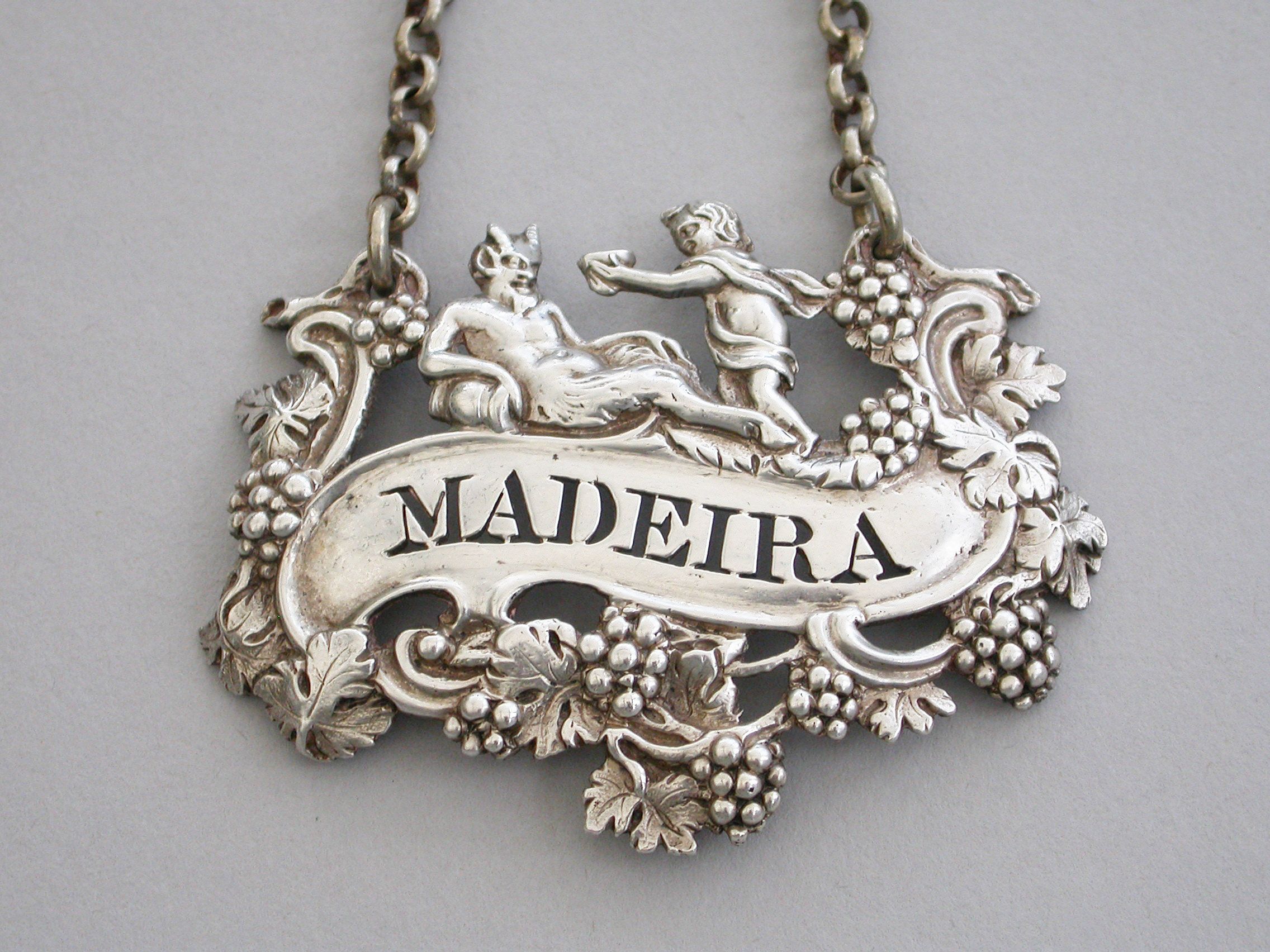 A fine George III heavy cast and pierced silver Wine Label depicting a reclining Dionysus being offered a cup of wine by a cloaked putto, a fruiting vine border surrounding the scrolled name plate incised for Madeira.