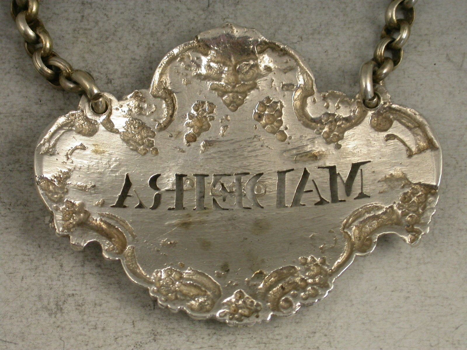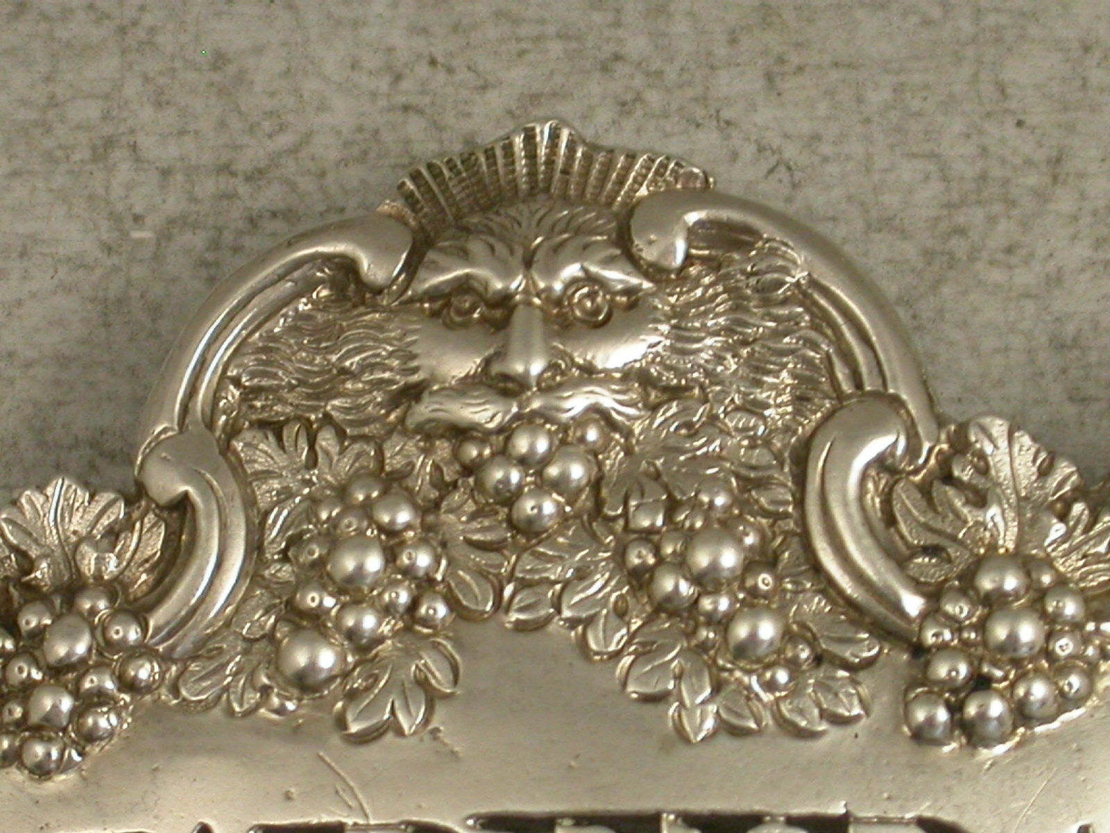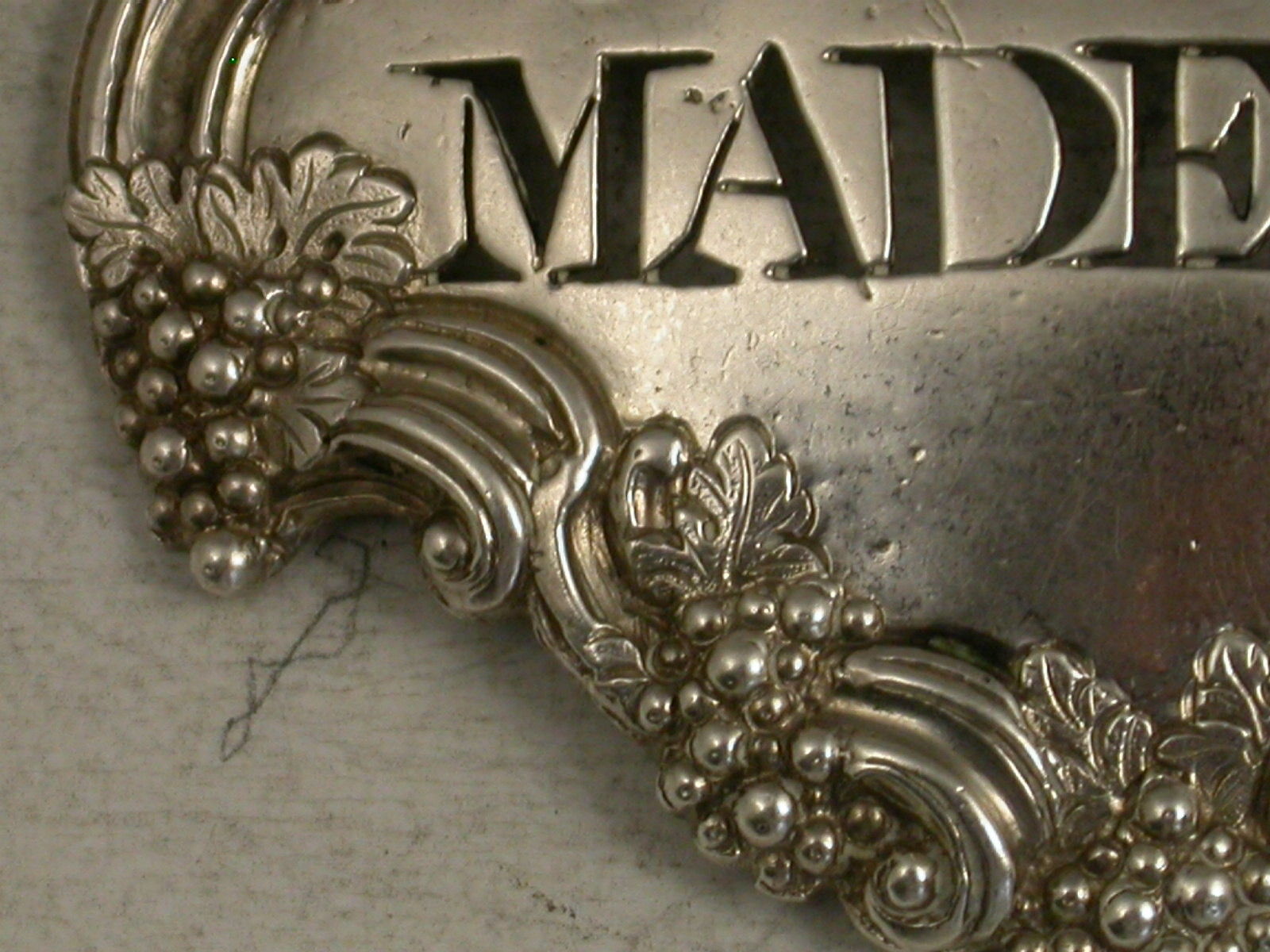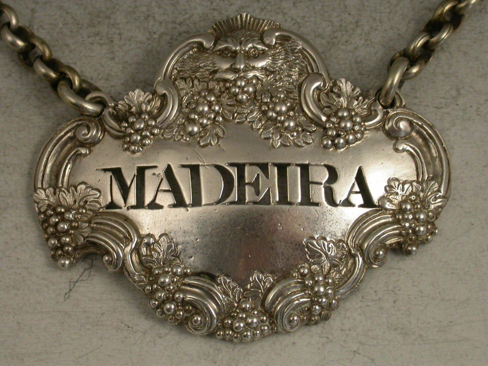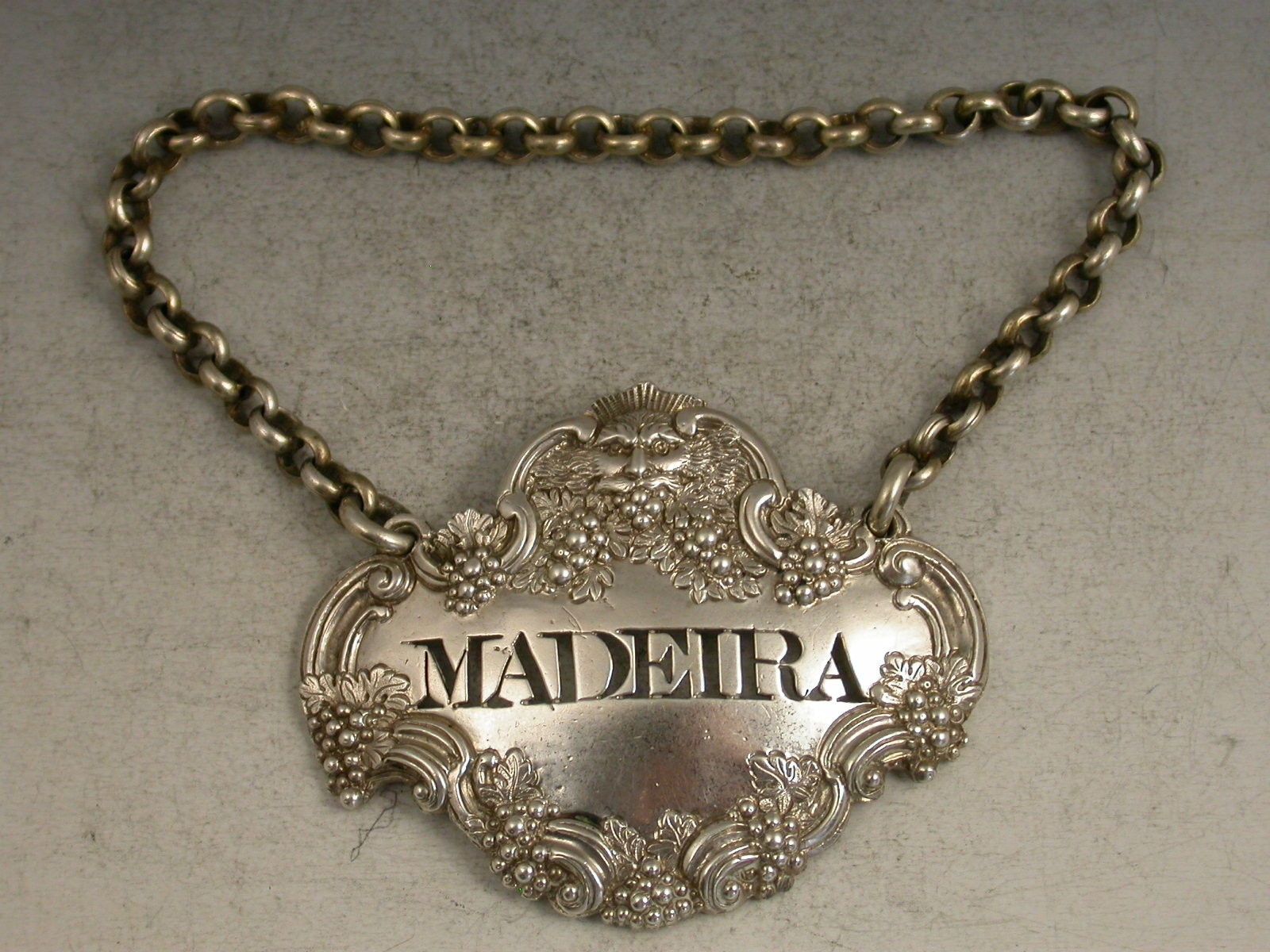 A fine George III heavy cast silver Wine Label of cartouche form with scrolled border of vine leaves and grapes, a Bacchus head surmount, pierced for Madeira.